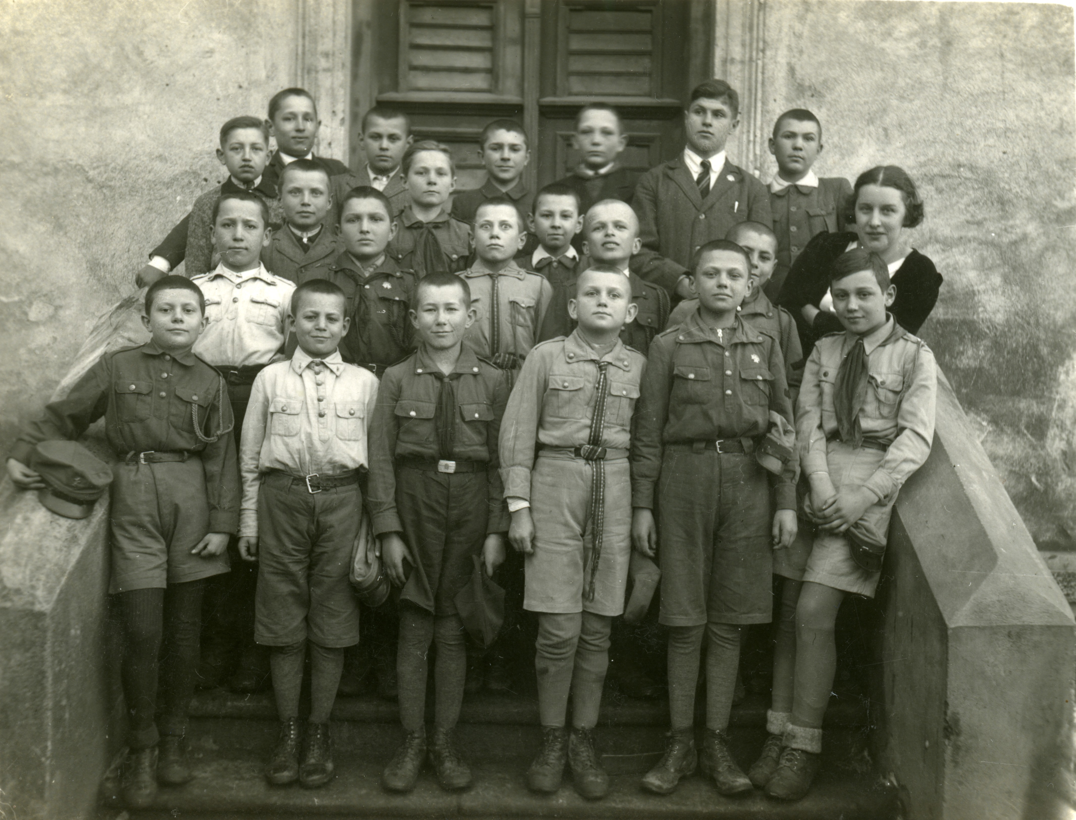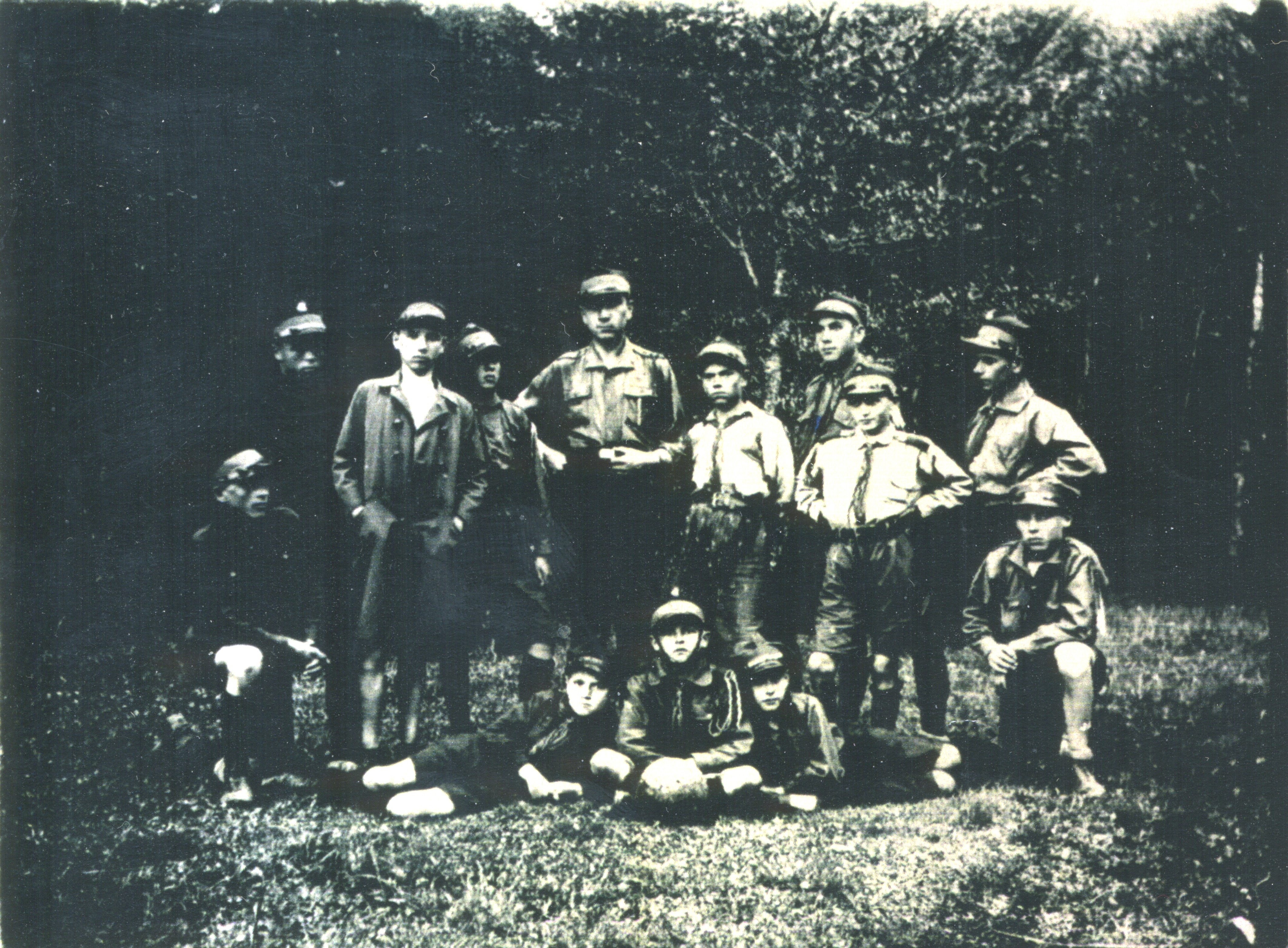 Grupa harcerzy z instruktorem. Druhowie na lewym ramieniu noszą czarne żałobne opaski po śmierci marszałka Piłsudskiego, 1935 r. Zbiór por. Romana Zygmunta Skwary -