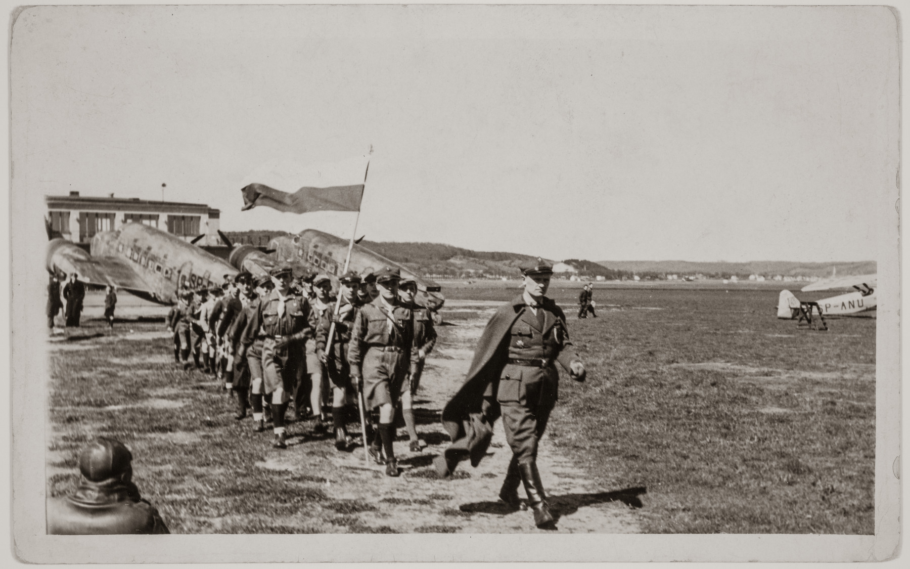 Wojciech Sabat prowadzi defiladę harcerzy po uroczystym pożegnaniu sztafety lotniczej do Prezydenta RP na lotnisku Rumia-Zagórze, 3 maja 1938 r. Zbiór Józefa Martyńskiego