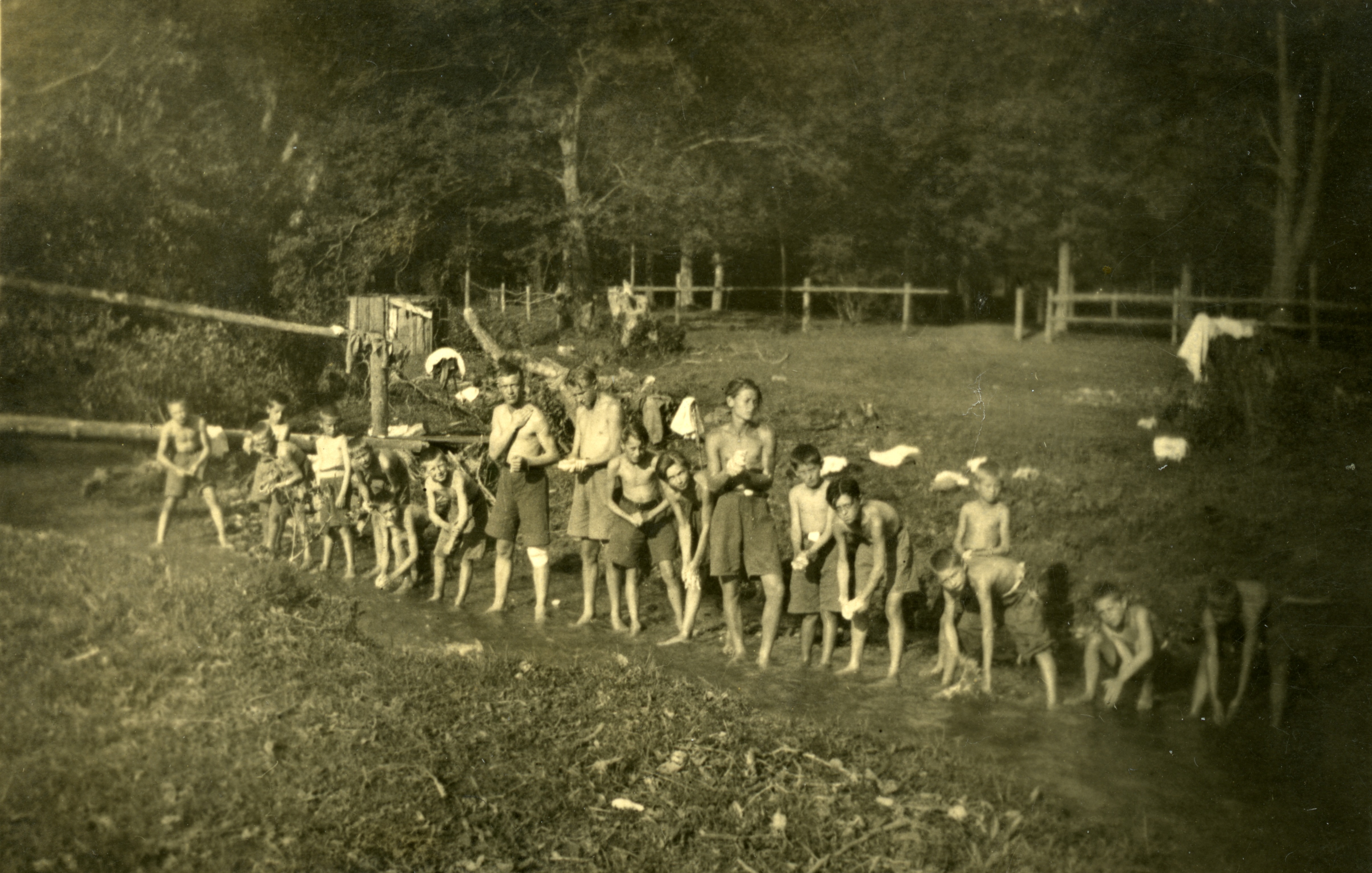Grupa harcerzy w czasie toalety w strumieniu podczas pobytu na obozie harcerskim w rejonie Wysowej, lato 1935 r. Zbiór por. Romana Zygmunta Skwary -