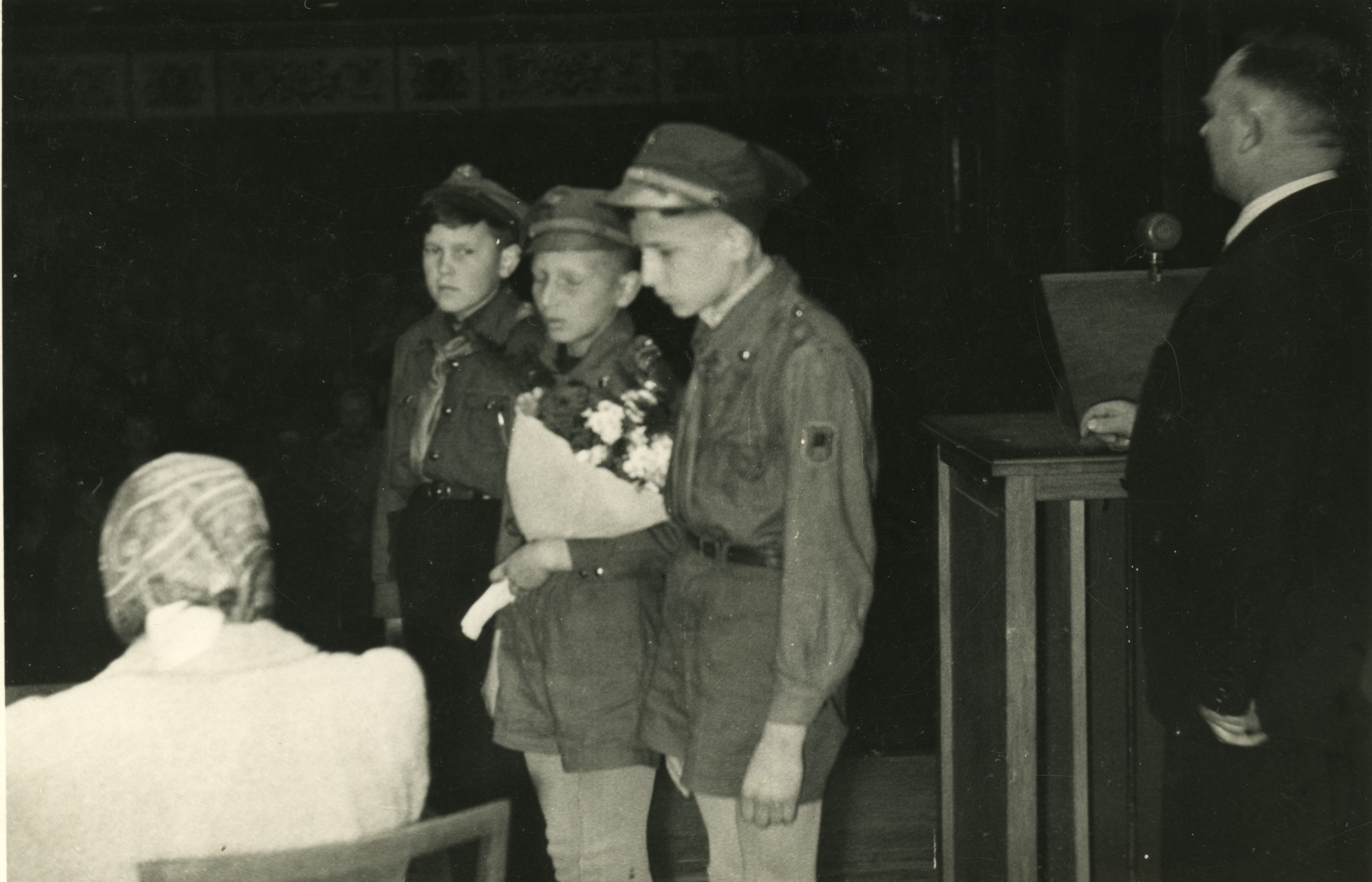 Harcerze wręczają kwiaty wdowie po Władysławie Jasińskim "Jędrusiu", Mielec 1958-1960 Zbiór Andrzeja Doliny -