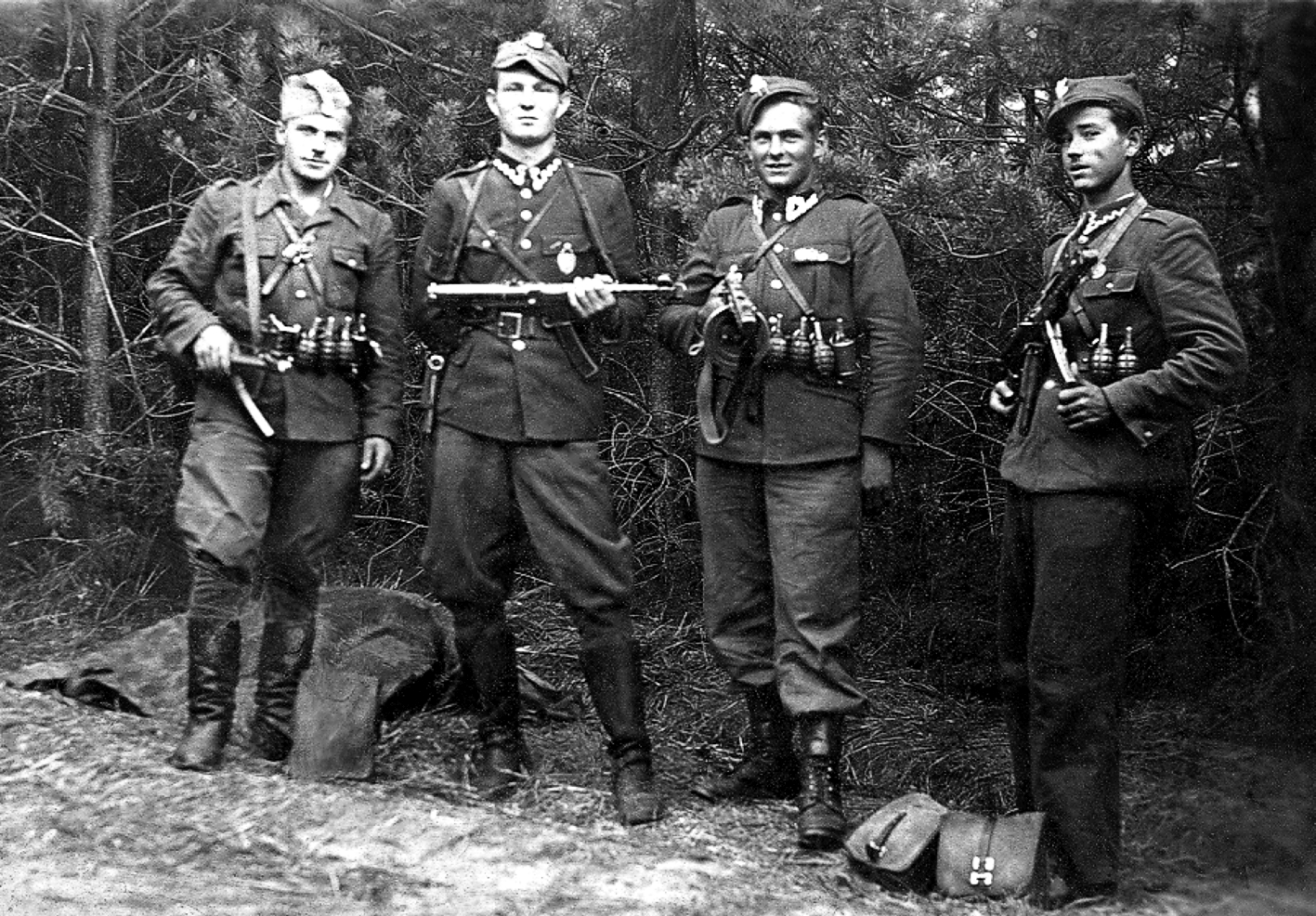 Las k. Mietułki (pow. Włodawa), 27 V 1947 r. Od lewej: Henryk Wybranowski „Tarzan” († 6 XI 1948), Edward Taraszkiewicz „Żelazny” († 6 X 1951), Mieczysław Małecki „Sokół” († 11 XI 1947), Stanisław Pakuła „Krzewina” (skazany na 10 lat więzienia) (Fot. AIPN) -