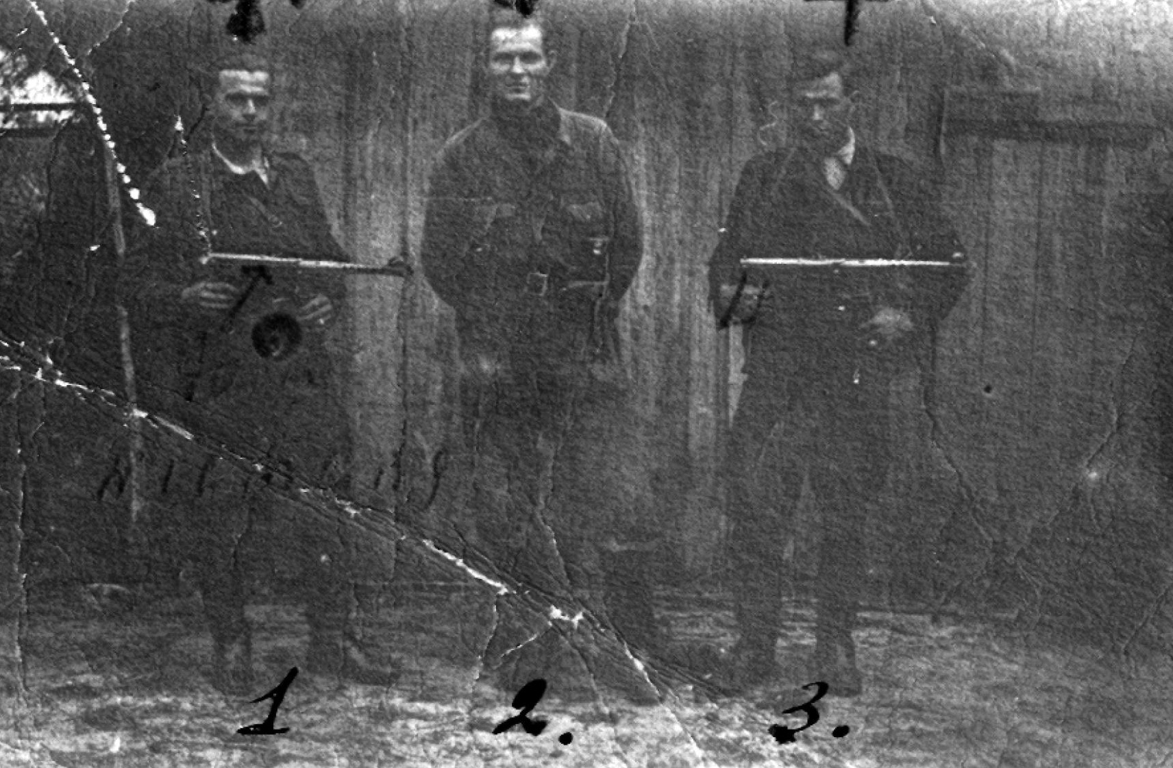 Od lewej: Henryk Wybranowski „Tarzan”, Edward Taraszkiewicz, „Żelazny”, Władysław Korzeniewski „Fredek”. Łowiszów, przed domem Janiny Korzeniewskiej „Wandy” (siostry „Fredka”), wrzesień 1948 r. (Fot. AIPN) -