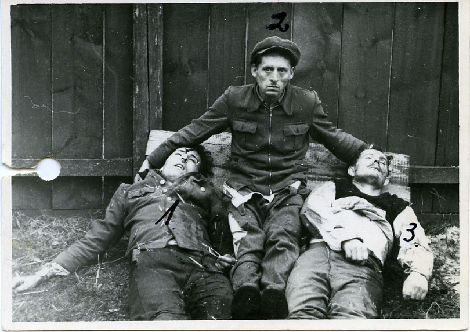 Zdjęcie wykonane 6 X 1951 r. na dziedzińcu PUBP we Włodawie. Leżą zabici: Stanisław Torbicz „Kazik” (z lewej) i Edward Taraszkiewicz „Żelazny” (z prawej). W środku siedzi Stanisław Marciniak „Niewinny”, skazany na karę śmierci, zamordowany wraz z Józefem Domańskim „Łukaszem” 12 stycznia 1953 r. w więzieniu na Zamku w Lublinie. (Fot. AIPN) -