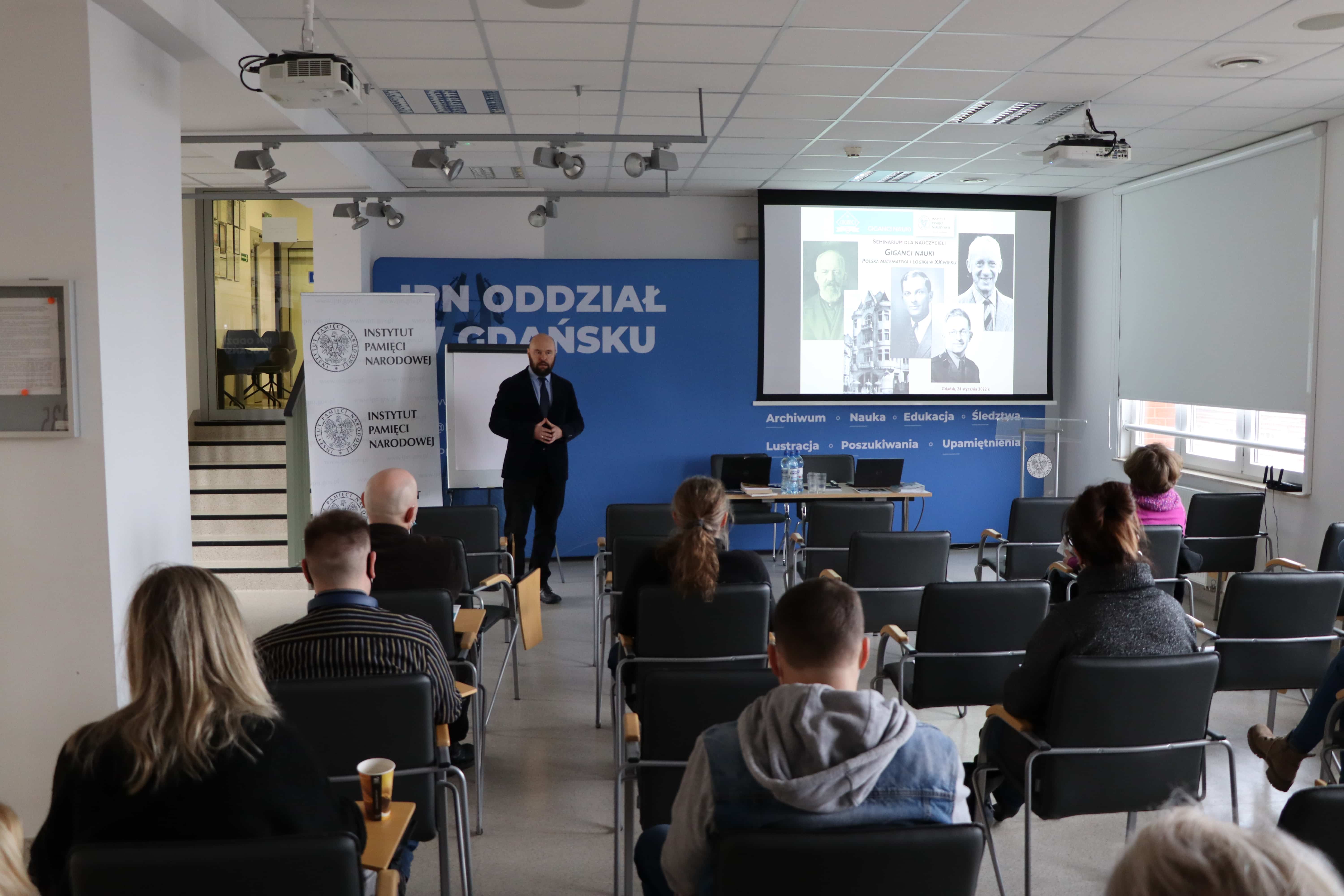 W pierwszej części spotkania wystąpił dr hab. Tomasz Jarmużek, pracownik Katedry Logiki Uniwersytetu Mikołaja Kopernika, który zaprezentował fenomen Szkoły Lwowsko-Warszawskiej oraz jej wpływ na rozwój matematyki i logiki w Europie i świecie. O walorach edukacyjnych infografik historycznych przedstawiających sylwetki 20 wybitnych polskich uczonych XX wieku opowiedziała Aleksandra Szwarc, pracownik pionu edukacyjnego IPN w Gdańsku. Charakterystykę pozostałych materiałów edukacyjnych (m.in. broszury „Swego nie znacie”, cykl filmów dok. „Wielcy polscy wynalazcy w II RP”) zaprezentował Bartosz Januszewski (OBEN IPN Gdańsk). Na koniec spotkania uczestnicy zmierzyli się z quizem historycznym, który przeprowadziła dr Barbara Męczykowska (OBEN IPN Gdańsk).