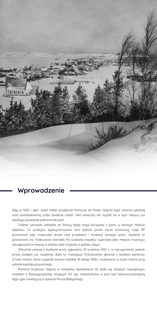 Gdy w 1920 r. gen. Józef Haller przyłączał Pomorze do Polski, Gdynia była rolniczo-rybacką wsią zamieszkiwaną przez dwieście rodzin. Nikt wówczas nie myślał, że w tym miejscu już niedługo powstanie pełnomorski port.