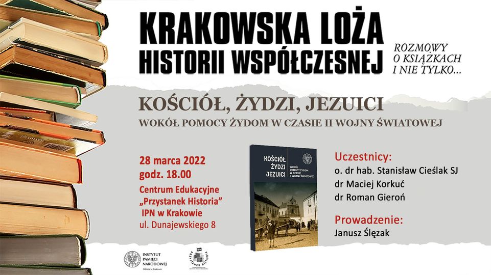 Tematów do rozmowy dostarczyła nowa książka pod redakcją dr. Michała Wenklara, zatytułowana „Kościół, Żydzi, jezuici. Wokół pomocy Żydom w czasie II wojny światowej”, która ukazała się nakładem krakowskiego oddziału IPN i Wydawnictwa Naukowego Akademii Ignatianum w Krakowie. W spotkaniu wzięli udział dwaj autorzy tekstów zamieszczonych w zbiorze – ks. dr hab. Stanisław Cieślak SJ i dr Maciej Korkuć, a także dr Roman Gieroń, jeden z recenzentów książki.