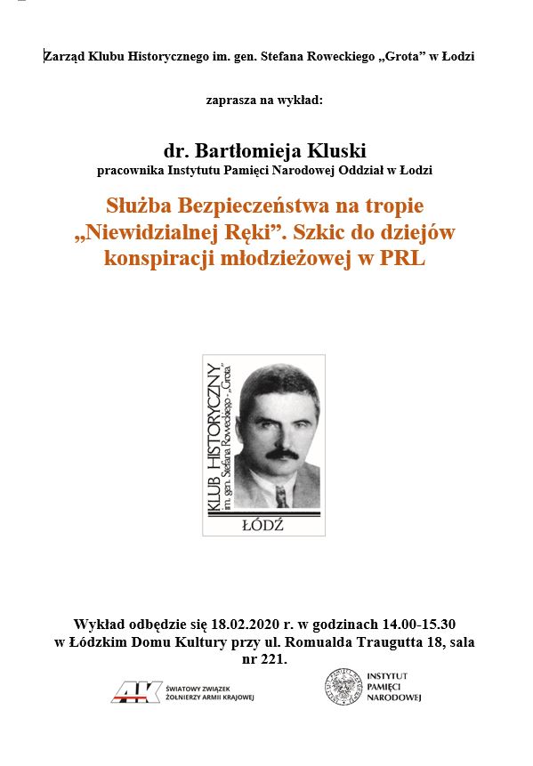 Klub Historyczny im. gen. Stefana Roweckiego „Grota” w Łodzi, działający przy łódzkim Oddziale Instytutu Pamięci Narodowej, zaprasza na spotkanie z dr. Bartłomiejem Kluską, historykiem, pracownikiem Oddziałowego Biura Edukacji Narodowej IPN w Łodzi, zatytułowane Służba Bezpieczeństwa na tropie „Niewidzialnej Ręki”. Szkic do dziejów konspiracji młodzieżowej w PRL.