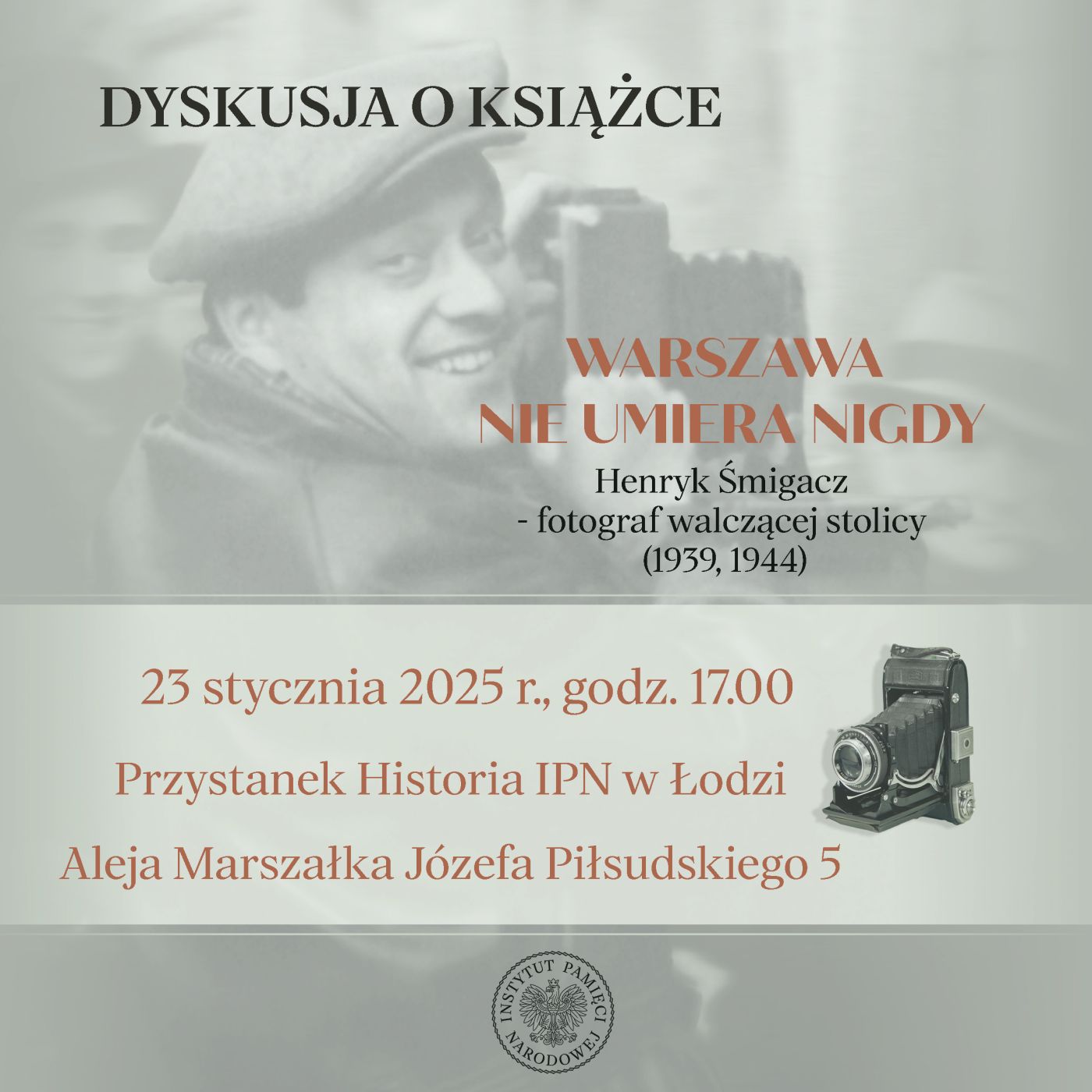 Zapraszamy na rozmowę o książce „Warszawa nie umiera nigdy. Henryk Śmigacz – fotograf walczącej stolicy (1939, 1944)”, która odbędzie się 23 stycznia 2025 r. o godz. 17.00 w Przystanku Historia IPN im. ppłk. Wacława Lipińskiego w Łodzi przy al. Marszałka Józefa Piłsudskiego 5.