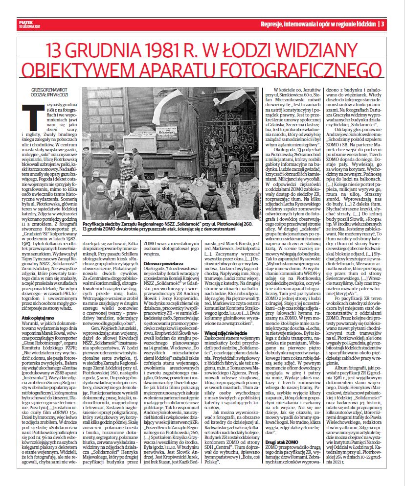 Okolicznościową prezentacją Oddziałowe Biuro Eduakcji Narodowej IPN w Łodzi przypomina o 41. rocznicy wprowadzenia w Polsce stanu wojennego. Materiał trafił na wyświetlacze Łódzkiej Kolei Aglomeracyjnej. Regionalny kontekst 13 grudnia jest do prześledzenia również w tekście Grzegorza Nawrota 13 grudnia 1981 r. w Łodzi widziany obiektywem aparatu fotograficznego, opublikowanym w dodatku do „Dziennika Łódzkiego” z 10 grudnia 2021 r. (załącznik).