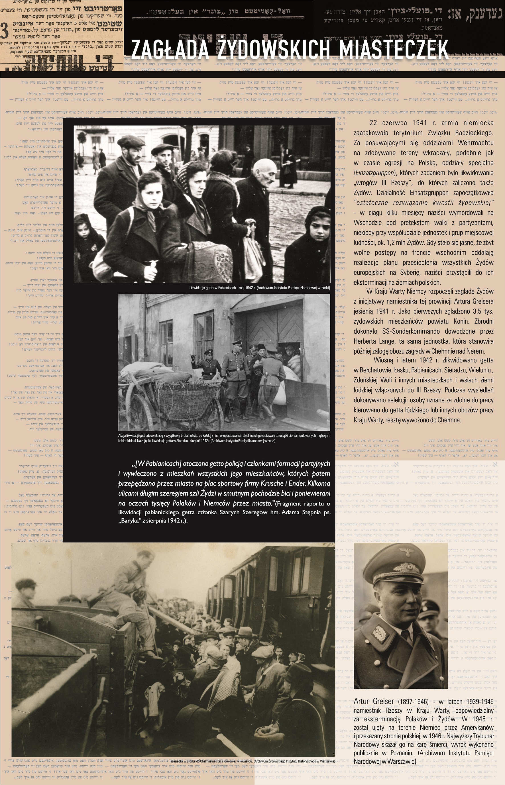 Zagłada „żydowskich miasteczek” rozpoczęła się w Kraju Warty z inicjatywy namiestnika tej prowincji Artura Greisera jesienią 1941 r. Jako pierwszych zgładzono 3,5 tys. żydowskich mieszkańców powiatu Konin. Zbrodni dokonało SS-Sonderkommando dowodzone przez Herberta Lange. Ta sama jednostka stanowiła później załogę obozu zagłady w Chełmnie nad Nerem, do którego 3 marca 1942 r. Niemcy wywieźli 3200 Żydów z getta w Żychlinie. Wiosną i latem 1942 r. zlikwidowano również getta w Kutnie, Poddębicach, Bełchatowie, Łasku, Pabianicach, Sieradzu, Wieluniu, Zduńskiej Woli i innych miasteczkach i wsiach ziemi łódzkiej włączonych do III Rzeszy. Równocześnie w tzw. Generalnym Gubernatorstwie Niemcy rozpoczęli w marcu 1942 r. tzw. Akcję "Reinhardt", czyli eksterminację Żydów, która objęła m.in. wschodnią część dawnego województwa łódzkiego włączonego w 1939 r. do GG. Do jesieni 1943 r. niemieccy okupanci wywieźli mieszkańców gett z GG do obozów zagłady w Bełżcu, Treblince, Sobiborze i zamordowali tam 1,7 mln osób. „Nie masz już, nie masz w Polsce żydowskich miasteczek, […] krew piaskiem przysypano, ślady uprzątnięto” – pisał Antoni Słonimski w wierszu „Elegia miasteczek żydowskich”. Zagłada unicestwiła żydowskie społeczności zakorzenione na polskiej ziemi niekiedy od setek lat. Dziś o ich obecności świadczą jedynie trawione przez czas cmentarze oraz tablice i pomniki upamiętniające ich zagładę.