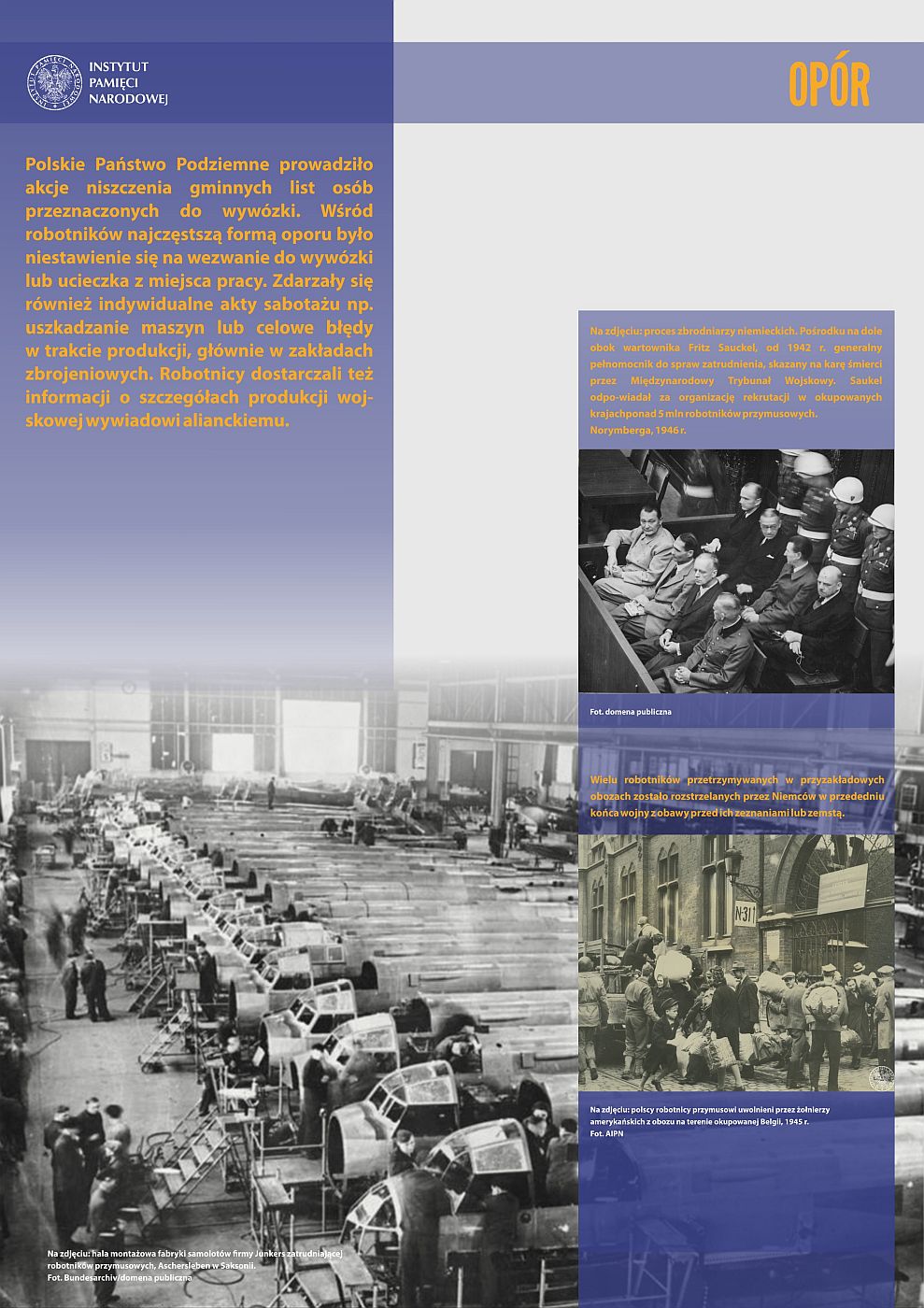 Podczas II wojny światowej hitlerowskie Niemcy stworzyły ogromny system pracy przymusowej, w której zatrudniano 20 mln cudzoziemskich robotników cywilnych, jeńców wojennych i więźniów z podbitych krajów. Wśród 8 mln robotników przymusowych najliczniejszą grupą byli Polacy - 2,5 mln. Wśród nich 70 proc. stanowili mężczyźni, 30 proc. kobiety i dzieci od 12. roku życia. Robotników wykorzystywano m.in. w rolnictwie, przemyśle zbrojeniowym, cywilnym oraz przy budowie dróg i kolei. W większości pracowali w trudnych warunkach po 12-16 godz. za niskie wynagrodzenie, bez odpowiedniej opieki lekarskiej, stale narażeni na represje ze strony niemieckich nadzorców. Polaków znakowano literą P przyszytą na ubraniach. Na terenach II RP włączonych do III Rzeszy okupant stosował przymus pracy, za którego złamanie groziła kara więzienia lub obóz koncentracyjny. W polskich miastach Generalnego Gubernatorstwa organizowano "polowania na ludzi", tzw. łapanki. Zatrzymanych umieszczano w obozach przejściowych, z których wywożono ich w głąb Niemiec.