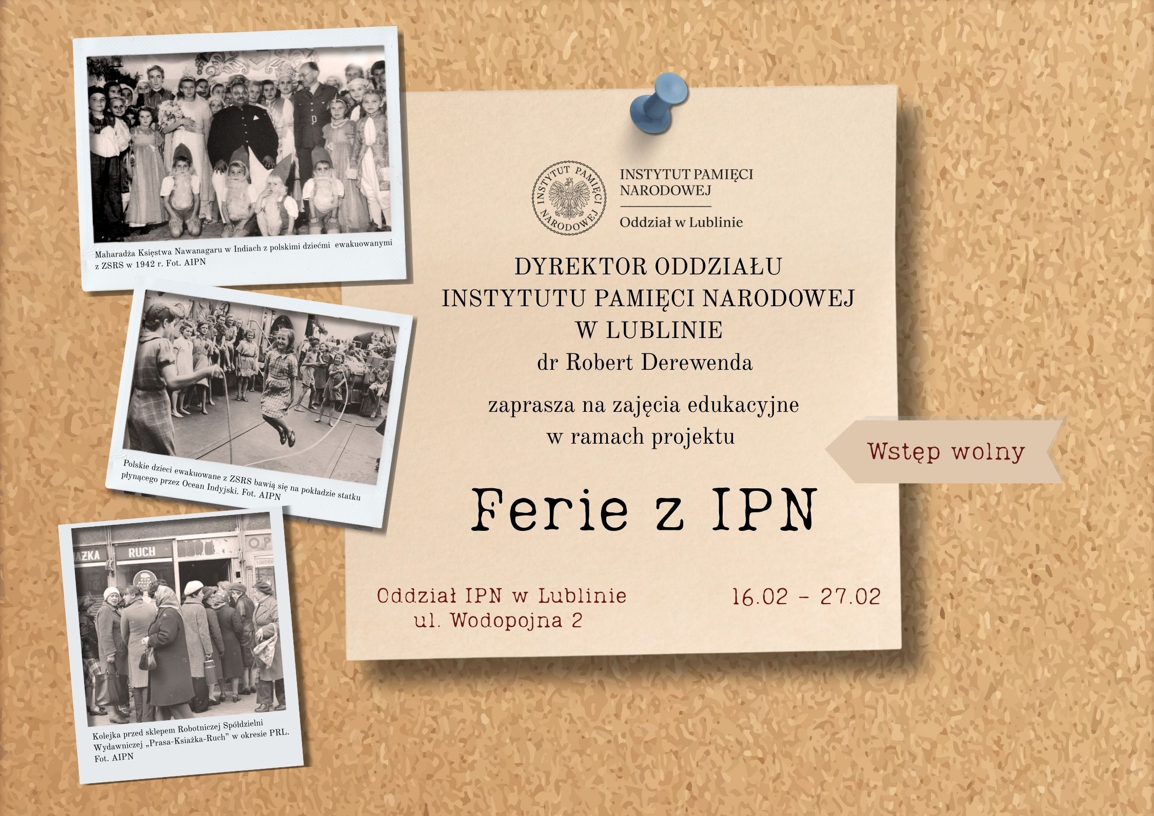 Dyrektor Oddziału Instytutu Pamięci Narodowej w Lublinie dr Robert Derewenda serdecznie zaprasza dzieci i młodzież wraz z opiekunami do wzięcia udziału w warsztatach edukacyjnych w ramach cyklu #Ferie z IPN. To doskonała okazja by spędzić zimowy czas w towarzystwie historii.