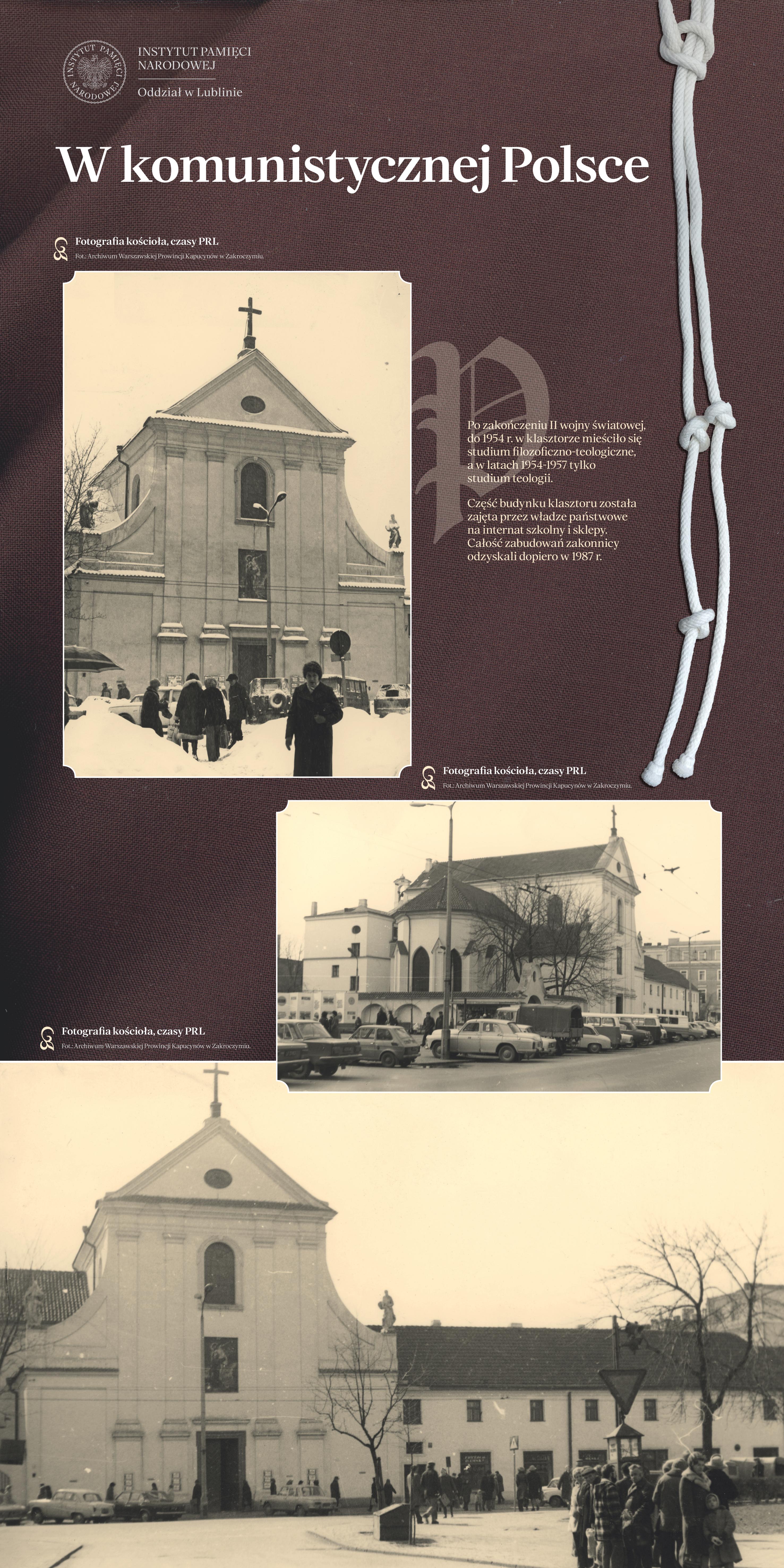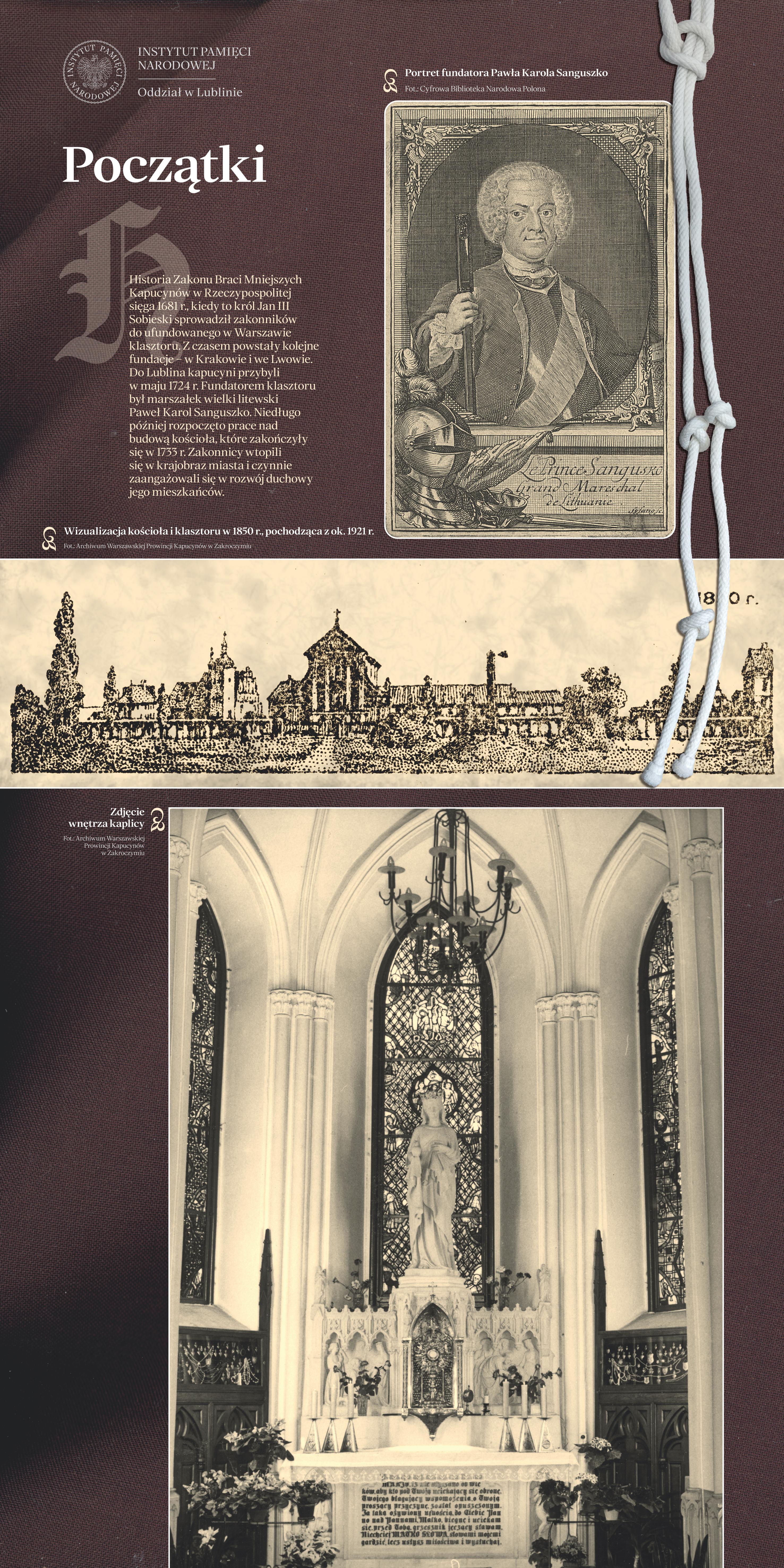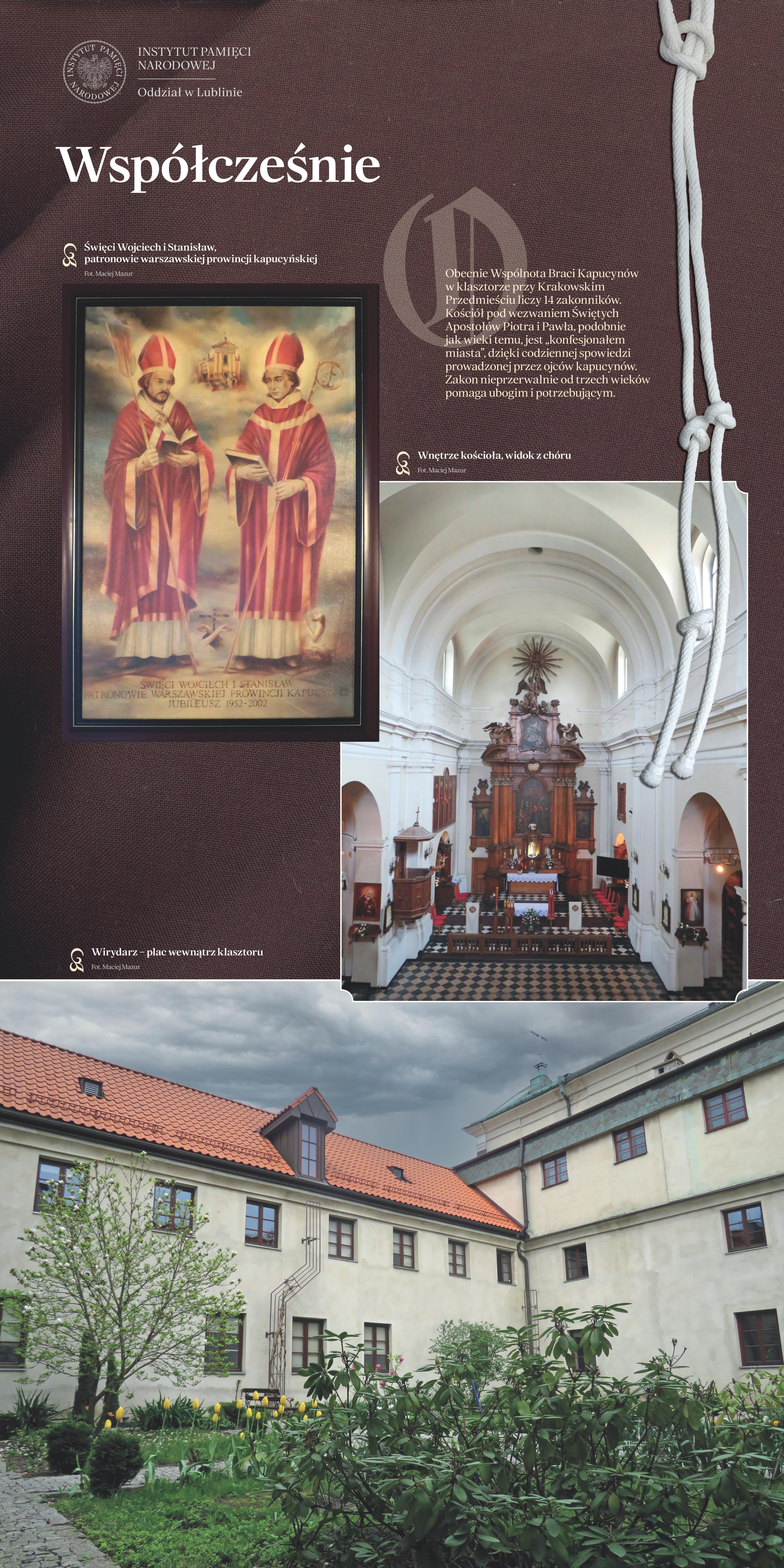 Przygotowana przez Oddział IPN w Lublinie wystawa „Bracia Kapucyni. 300 lat w Lublinie 1724-2024” przedstawia najważniejsze wydarzenia z trzystuletniej obecności ojców Kapucynów w mieście. Na osiemnastu planszach zaprezentowano sprowadzenie Kapucynów do Lublina, zaangażowanie w powstanie styczniowe i jego konsekwencje w postaci kasaty, działalność braci w okresie międzywojennym, męczeństwo oo. Kapucynów w trakcie II wojny światowej oraz losy klasztoru od zakończenia wojny aż do czasów współczesnych.