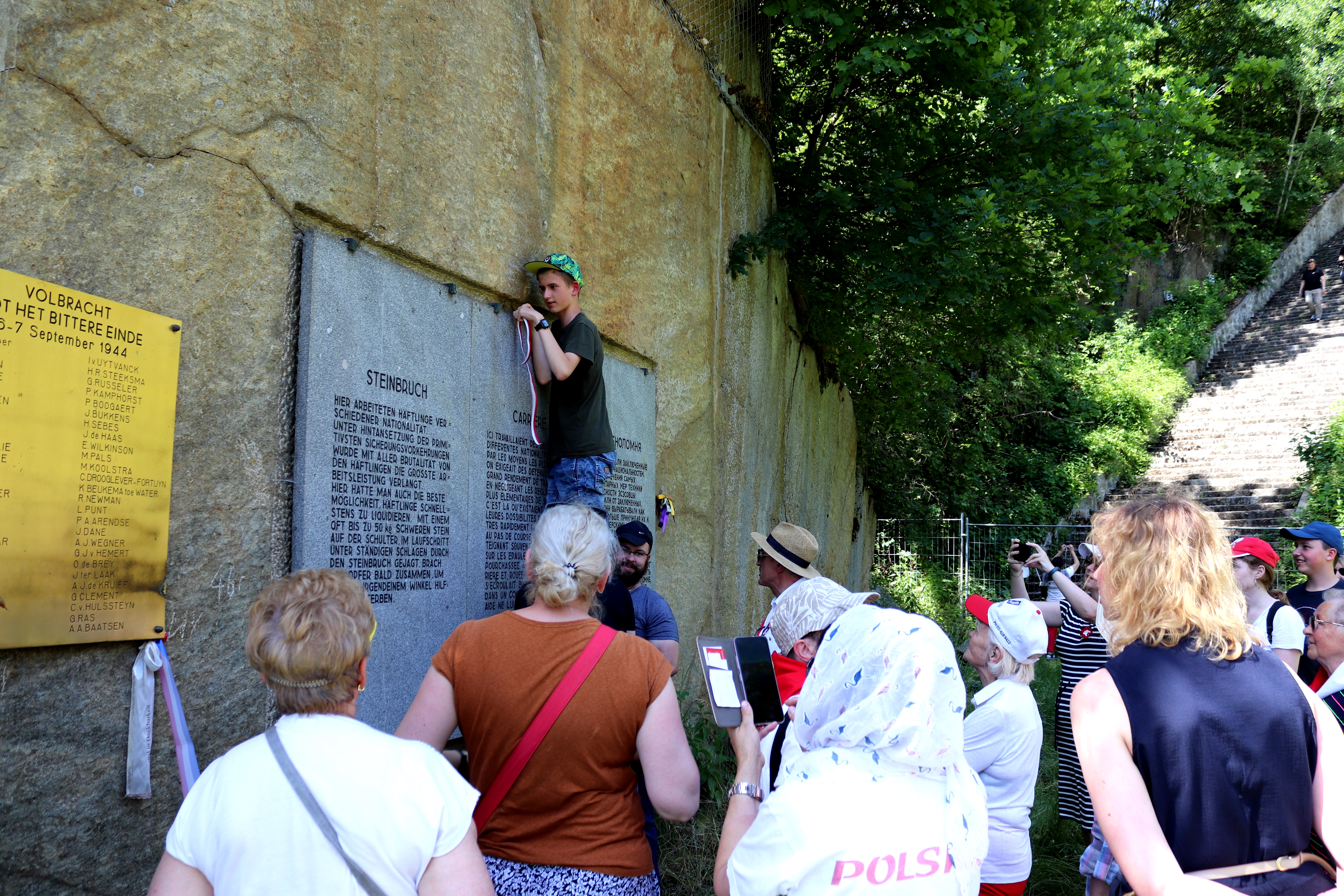 Po wizycie w Miejscu Pamięci Mauthausen uczestnicy udali się pod „Schody Śmierci”, które od kilka lat mimo apeli polskiej strony, pozostają zamknięte. Prowadzą one z kamieniołomu Wiener Graben do obozu. Są złowrogim symbolem i koszmarem tego miejsca. Zostały wybudowane przez pierwszych więźniów KL Mauthausen z luźnych, granitowych bloków. W okresie funkcjonowania obozu tysiące mężczyzn ustawionych w pięcioosobowych szeregach kilkakrotnie w ciągu dnia wnosiło po tych stromych schodach ociosane bloki skalne, z których w 1938 r. wybudowano zewnętrzny mur otaczający KL Mauthausen. Każdy z kamieni ważył kilkadziesiąt kilogramów. Dzięki ich ciężkiej pracy górujący nad miastem do dzisiaj „kamienny zamek” jest niemym świadectwem niemieckich i austriackich zbrodni dokonanych na terenie obecnej Austrii w okresie II wojny światowej.