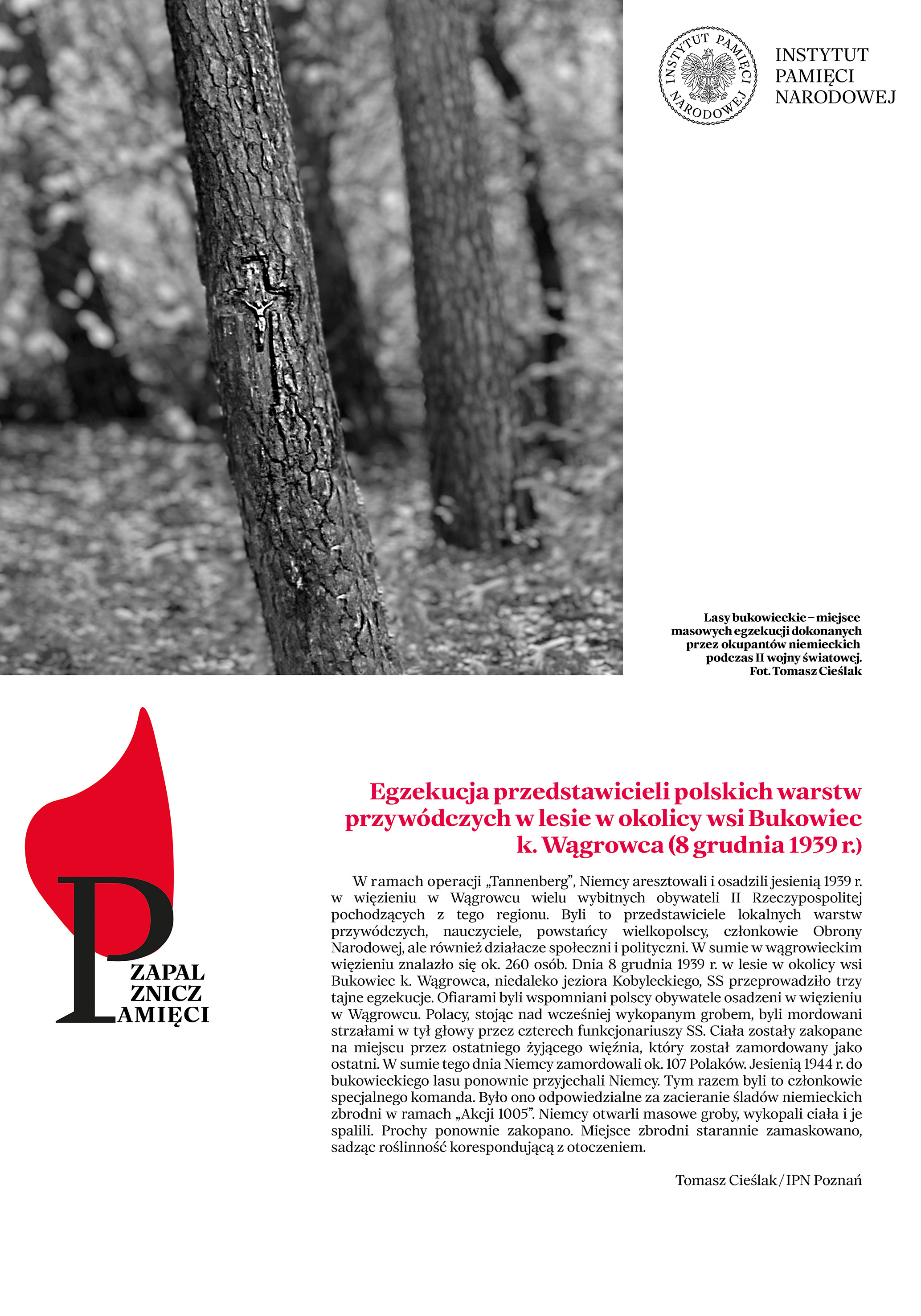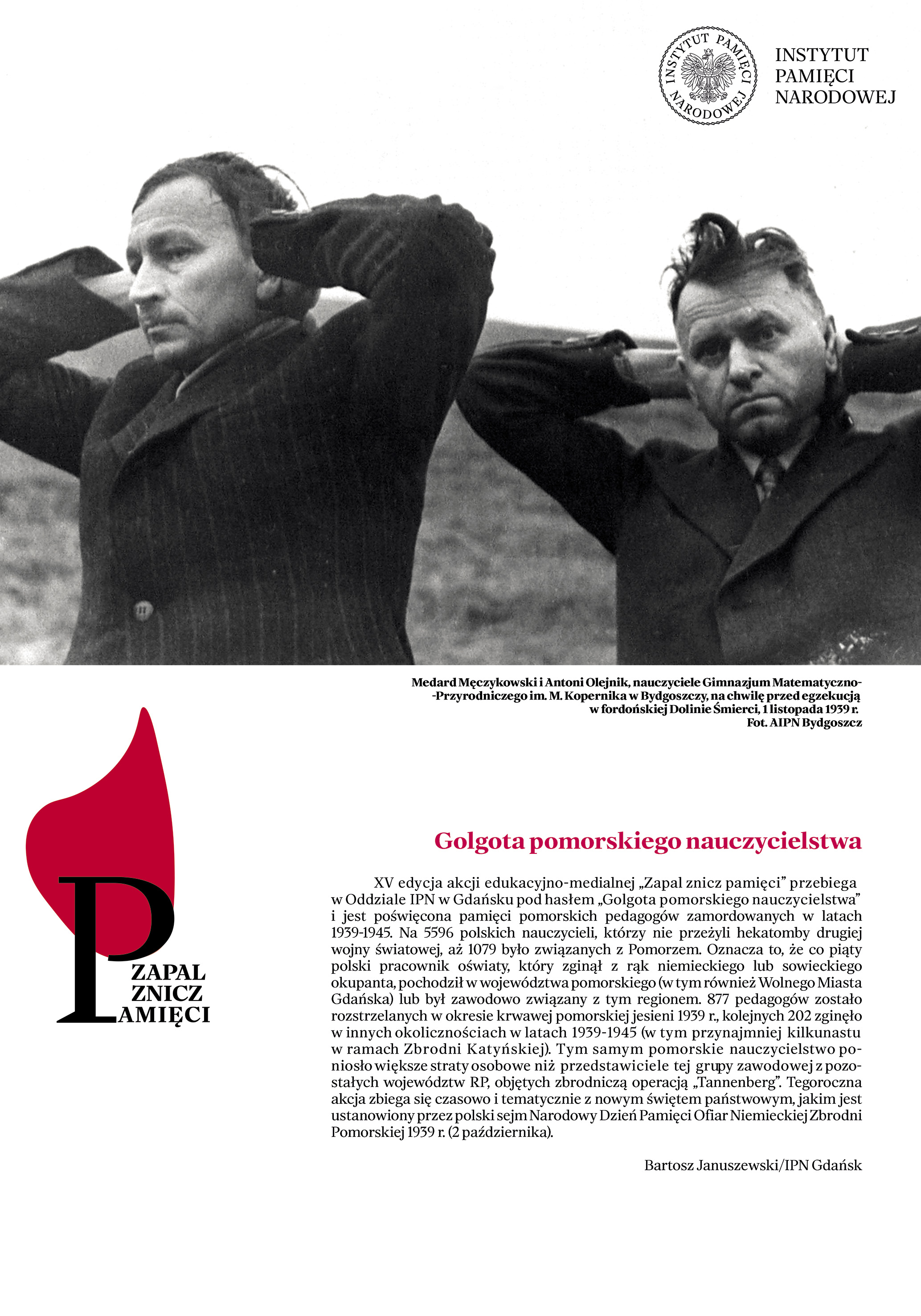 Już po raz piętnasty zachęcamy do zapalenia znicza pamięci ofiarom niemieckich zbrodni dokonanych w ramach „politycznego oczyszczania gruntu”, operacji „Tannenberg” i „Akcji Inteligencja” w 1939 r. Każdego roku, w trzecią niedzielę października, przypominamy o tych, którzy jako pierwsi zostali poddani eksterminacji po agresji III Rzeszy Niemieckiej na Polskę. Uczcijmy wspólnie pamięć przedstawicieli polskich warstw przywódczych, którzy zostali zamordowani na terenach II RP wcielonych w 1939 r. do III Rzeszy: w Wielkopolsce, regionie łódzkim, na Pomorzu Gdańskim, Kujawach i Górnym Śląsku.