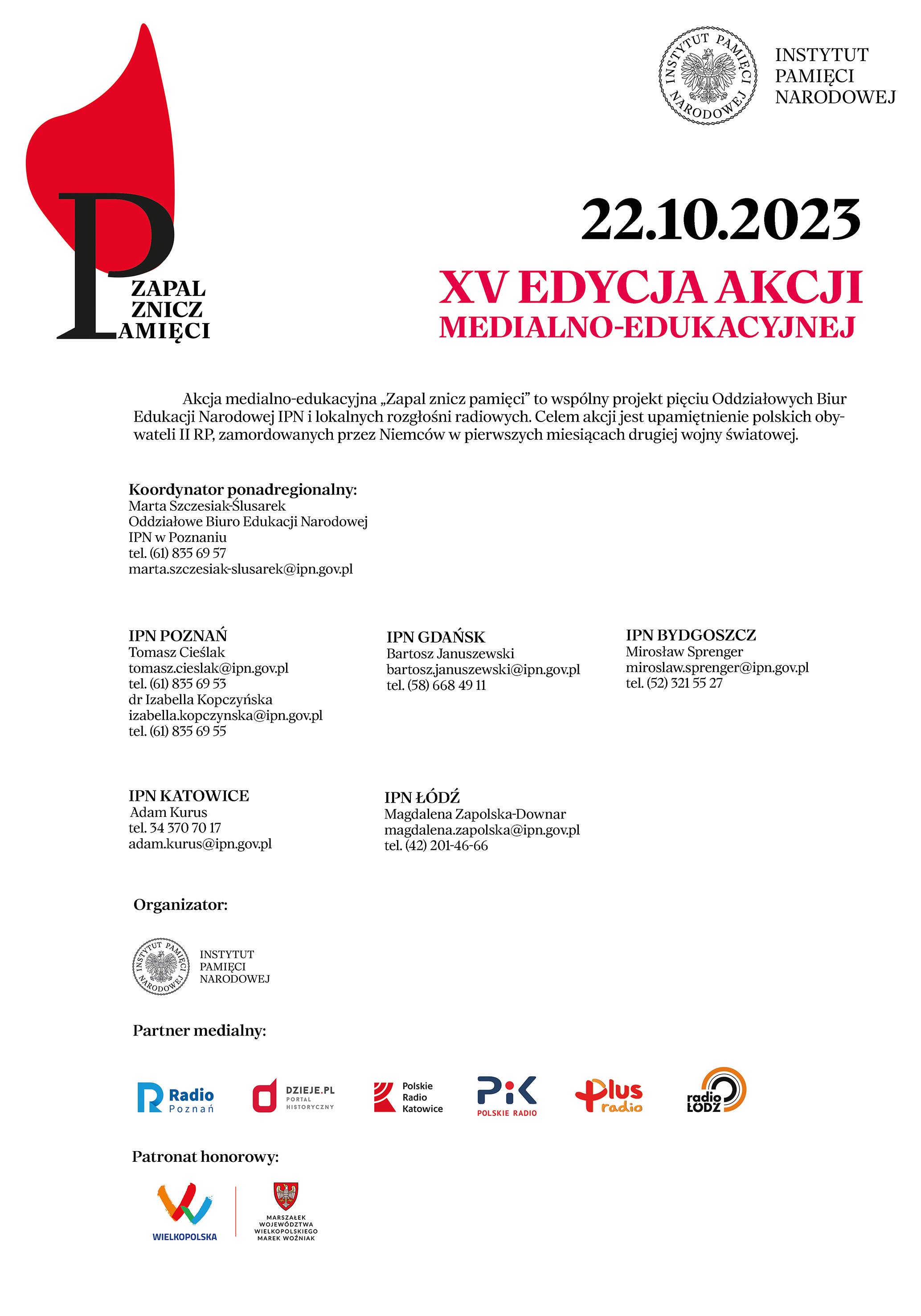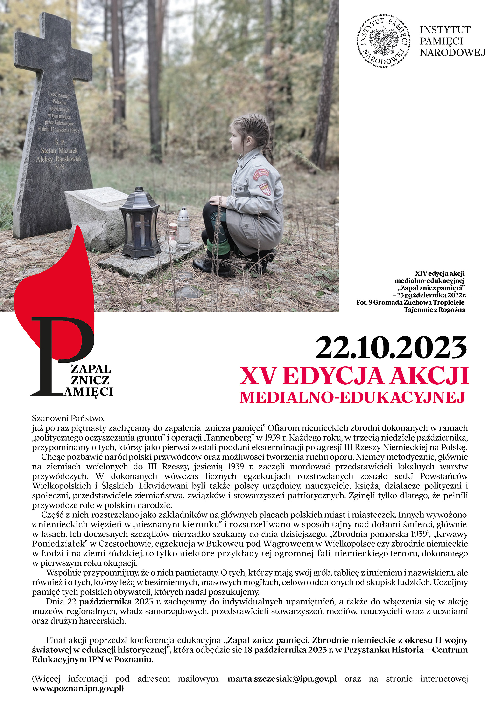 Finał akcji poprzedzi konferencja edukacyjna „Zapal znicz pamięci – zbrodnie niemieckie z okresu II wojny światowej w edukacji historycznej”, która odbędzie się 18 października 2023 r. w Przystanku Historia IPN w Poznaniu przy ul. Dąbrowskiego 29.