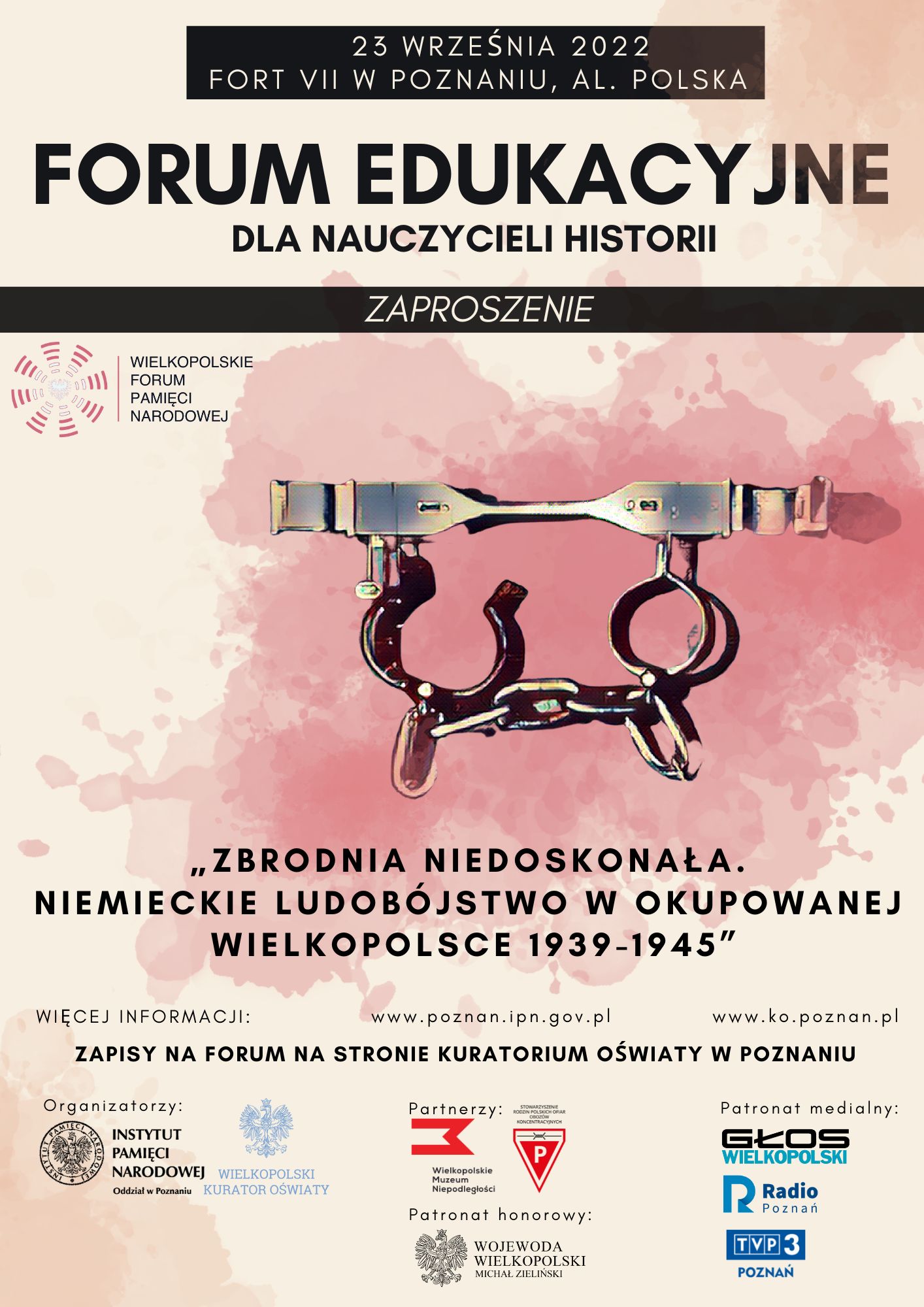Motywem przewodnim Forum Edukacyjnego dla nauczycieli historii jest ukazanie okupowanej Wielkopolski jako poligonu doświadczalnego dla masowych zbrodni, dokonywanych przez Niemców w Europie w okresie II wojny światowej. To na terenie Kraju Warty, regionu administarcyjnego utworzonego przez Niemców na okupowanych ziemiach polskich, powstał pierwszy niemiecki obóz koncentracyjny – Fort VII w Poznaniu. Niemcy dopuścili się tam aktów bestialstwa wobec zatrzymanych Polaków. W Forcie VII po raz pierwszy wykorzystano komorę gazową do uśmiercania więźniów. Na terenie okupowanej Wielkopolski powstał również pierwszy obóz zagłady Kulmhof w Chełmnie nad Nerem. Dokonywano także pierwszych w okupowanej Polsce eutanazji osób psychicznie chorych oraz, w ramach operacji „Tannenberg” i „Akcji Inteligencja”, wymordowano w sposób masowy lokalne warstwy przywódcze i elity (m. in. Lasy Palędzko-Zakrzewskie, Lasy Rożnowickie). Wszystkie te zbrodnie były ludobójstwem na narodzie polskim.