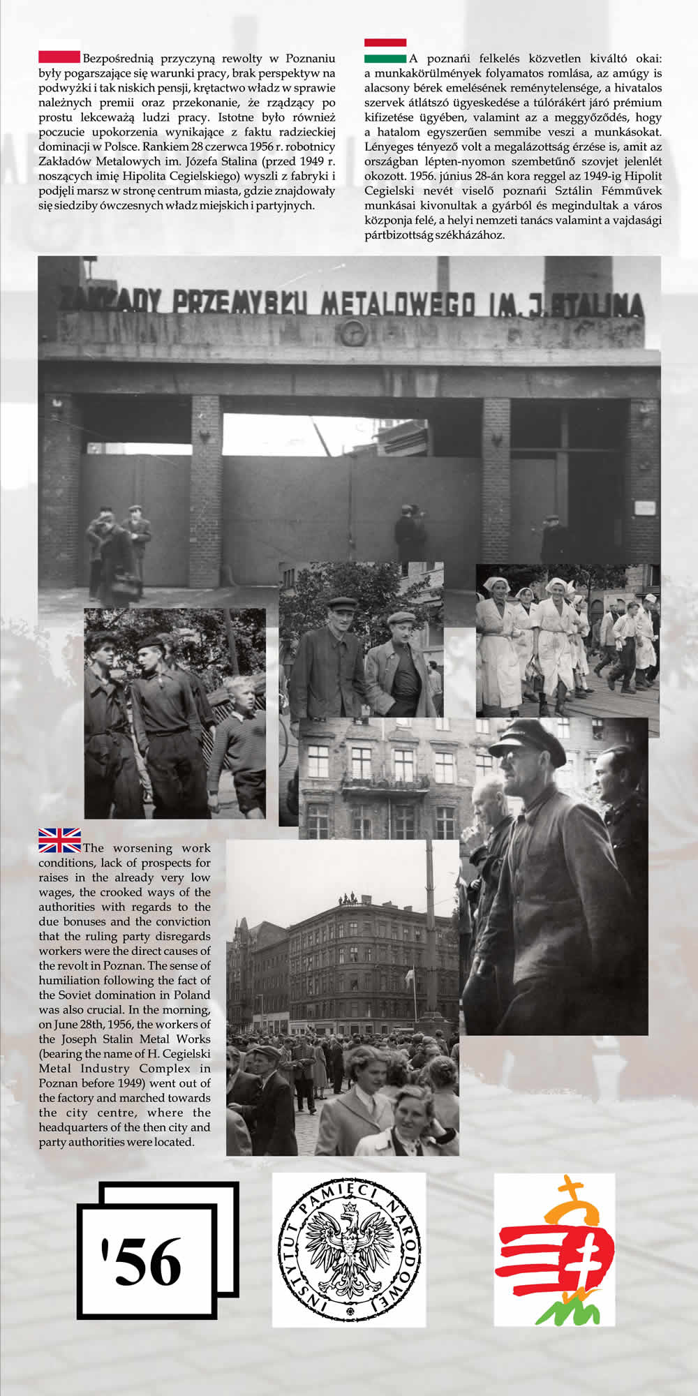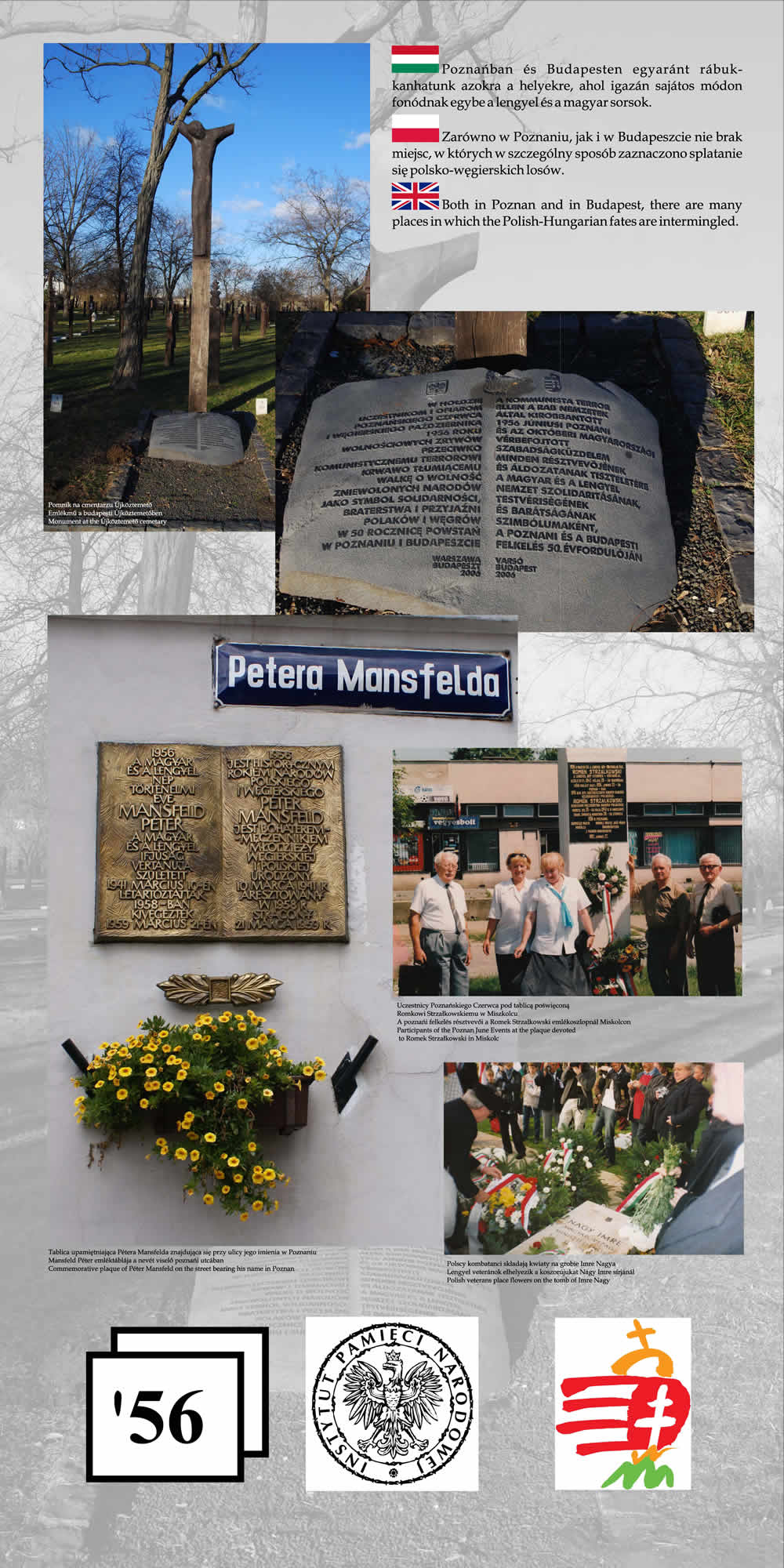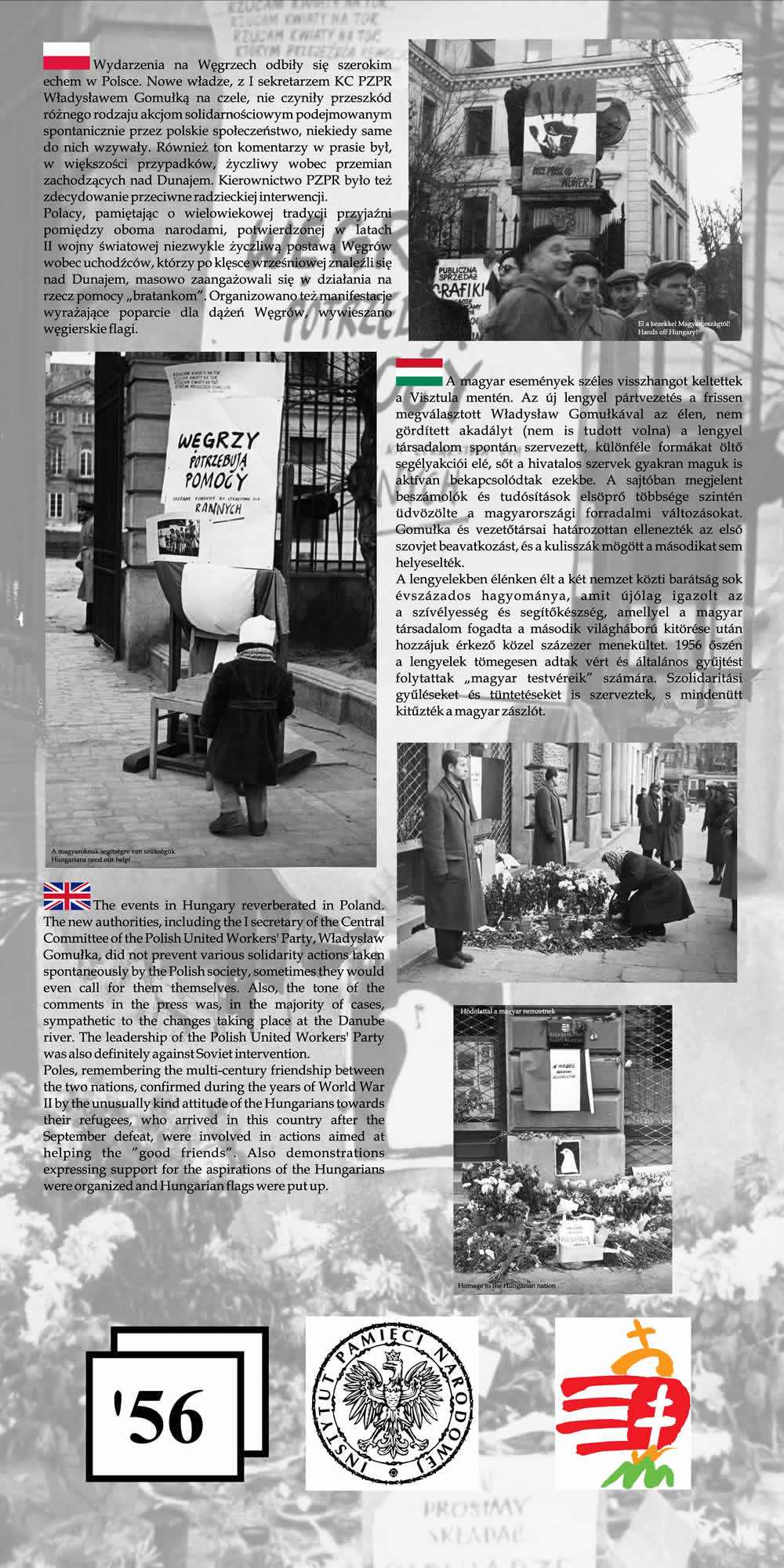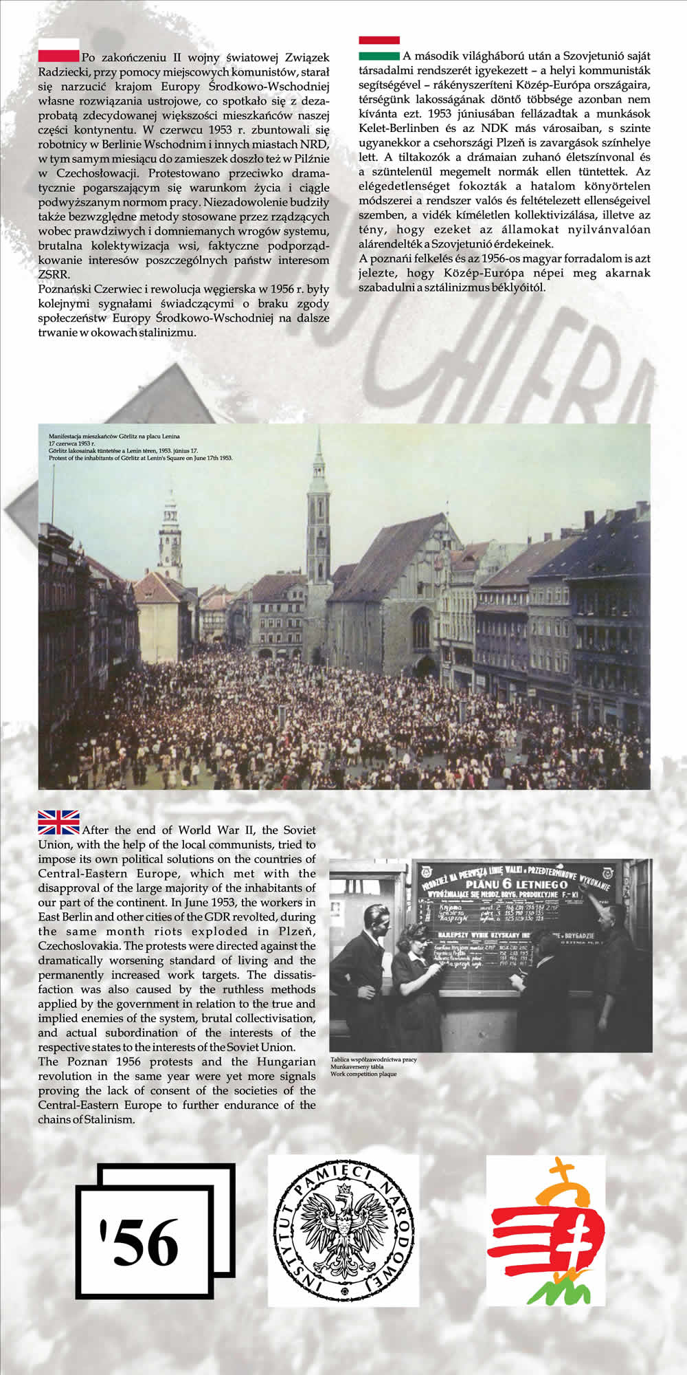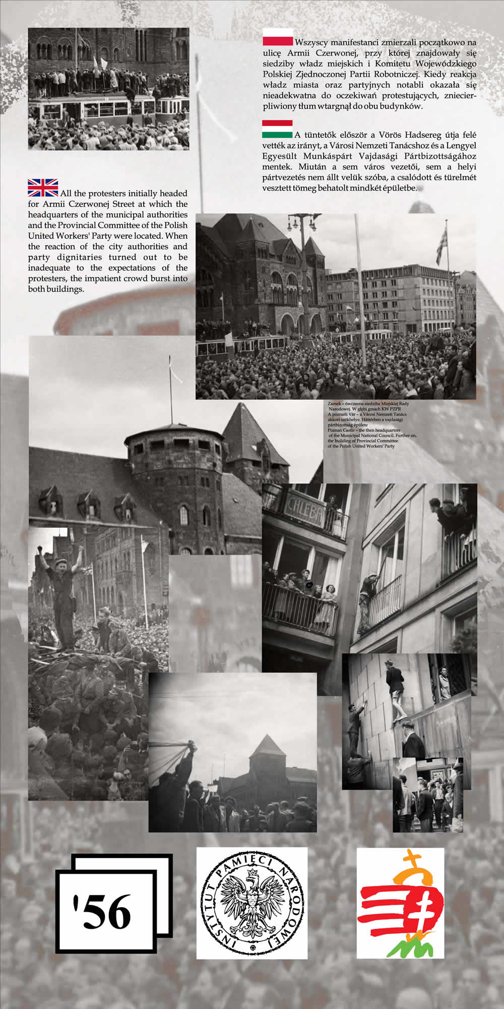 Wystawa przypomina wspólne losy Polaków i Węgrów w okresie komunizmu na przykładzie wydarzeń z 1956 r. Przedstawione na wystawie fotografie wraz z obszernym komentarzem historycznym nie tylko przypominają wydarzenia Poznańskiego Czerwca i Rewolucji Węgierskiej z 1956 r., ale starają się także pokazać, na ile pamięć o wydarzeniach sprzed prawie 55 lat jest obecna w przestrzeni obu miast poprzez pomniki, pamiątkowe płyty, groby poległych.