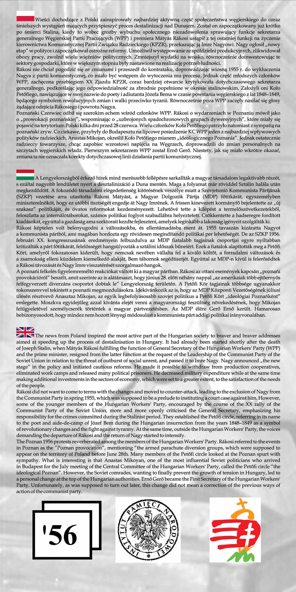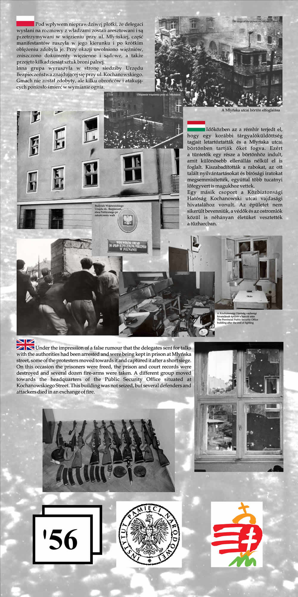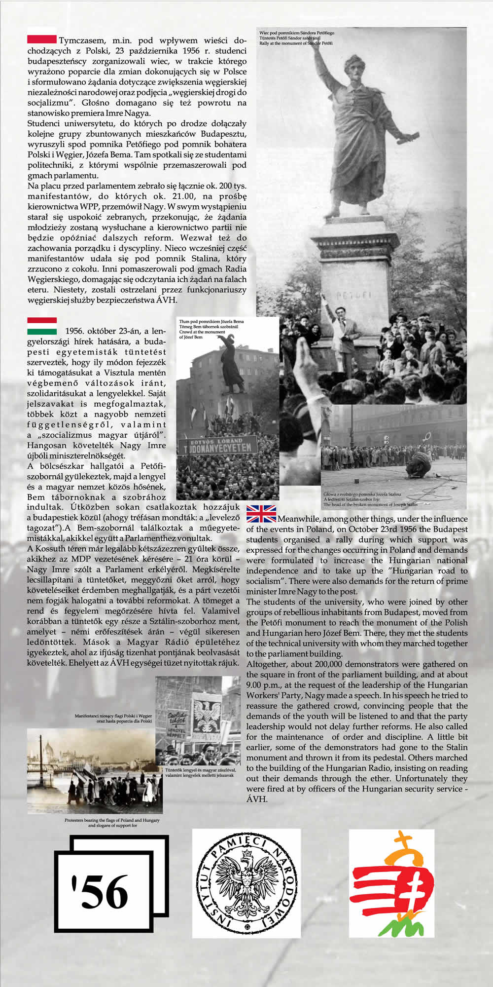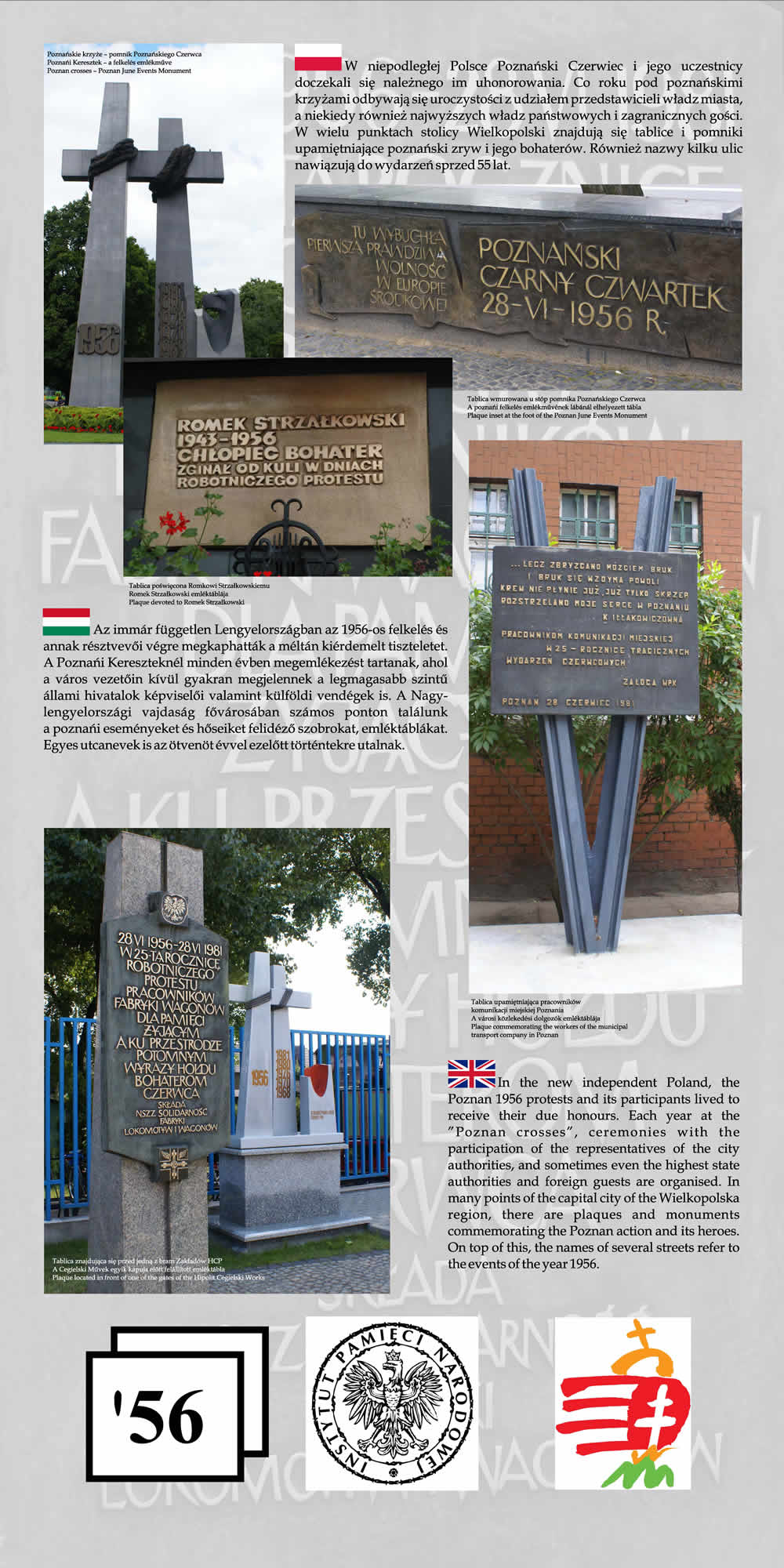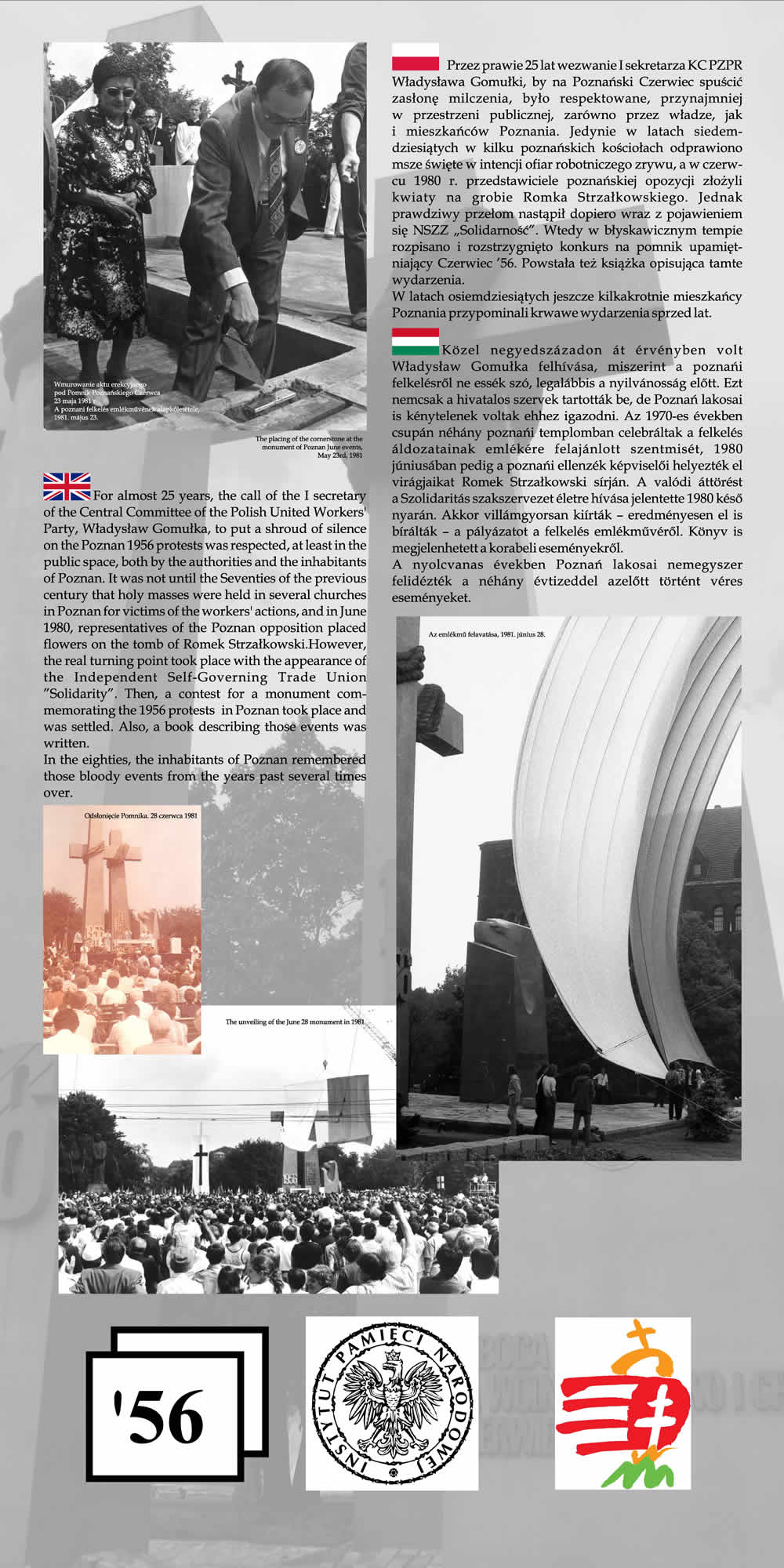 Wystawa przypomina wspólne losy Polaków i Węgrów w okresie komunizmu na przykładzie wydarzeń z 1956 r. Przedstawione na wystawie fotografie wraz z obszernym komentarzem historycznym nie tylko przypominają wydarzenia Poznańskiego Czerwca i Rewolucji Węgierskiej z 1956 r., ale starają się także pokazać, na ile pamięć o wydarzeniach sprzed prawie 55 lat jest obecna w przestrzeni obu miast poprzez pomniki, pamiątkowe płyty, groby poległych.