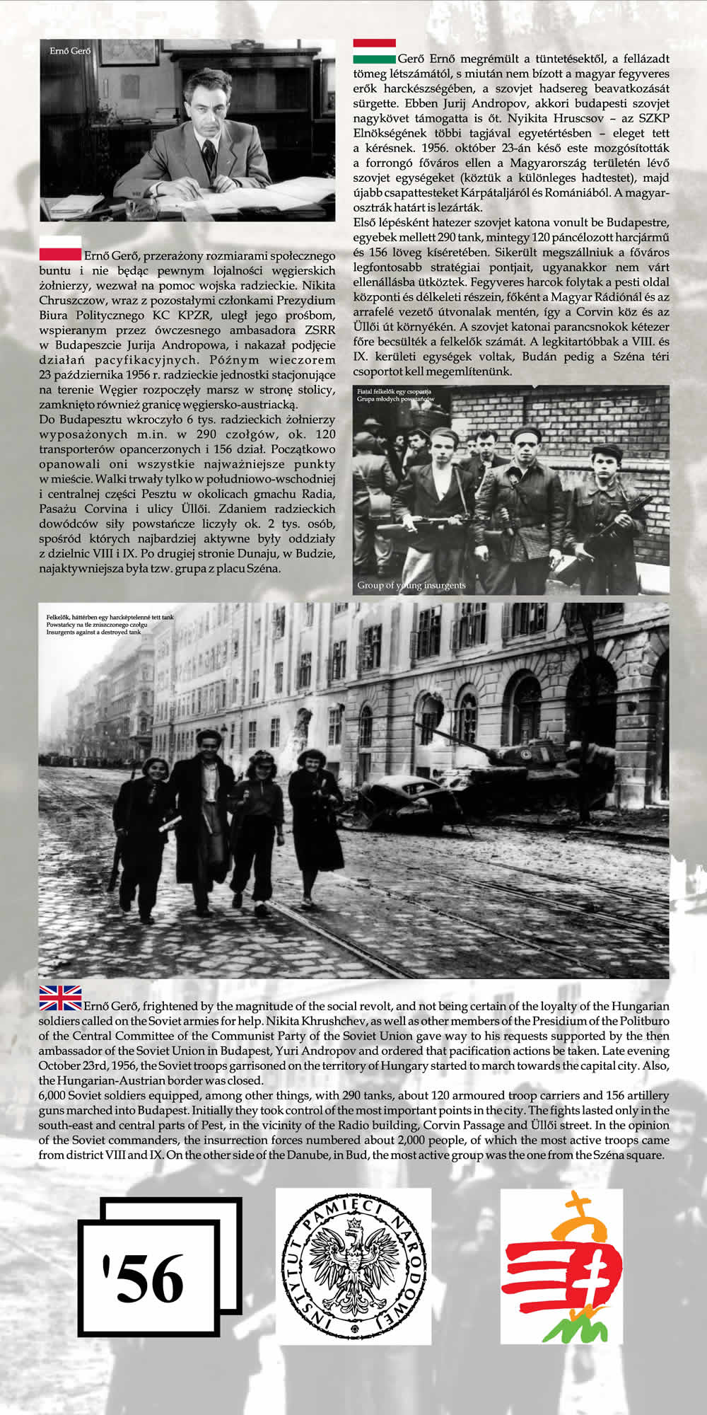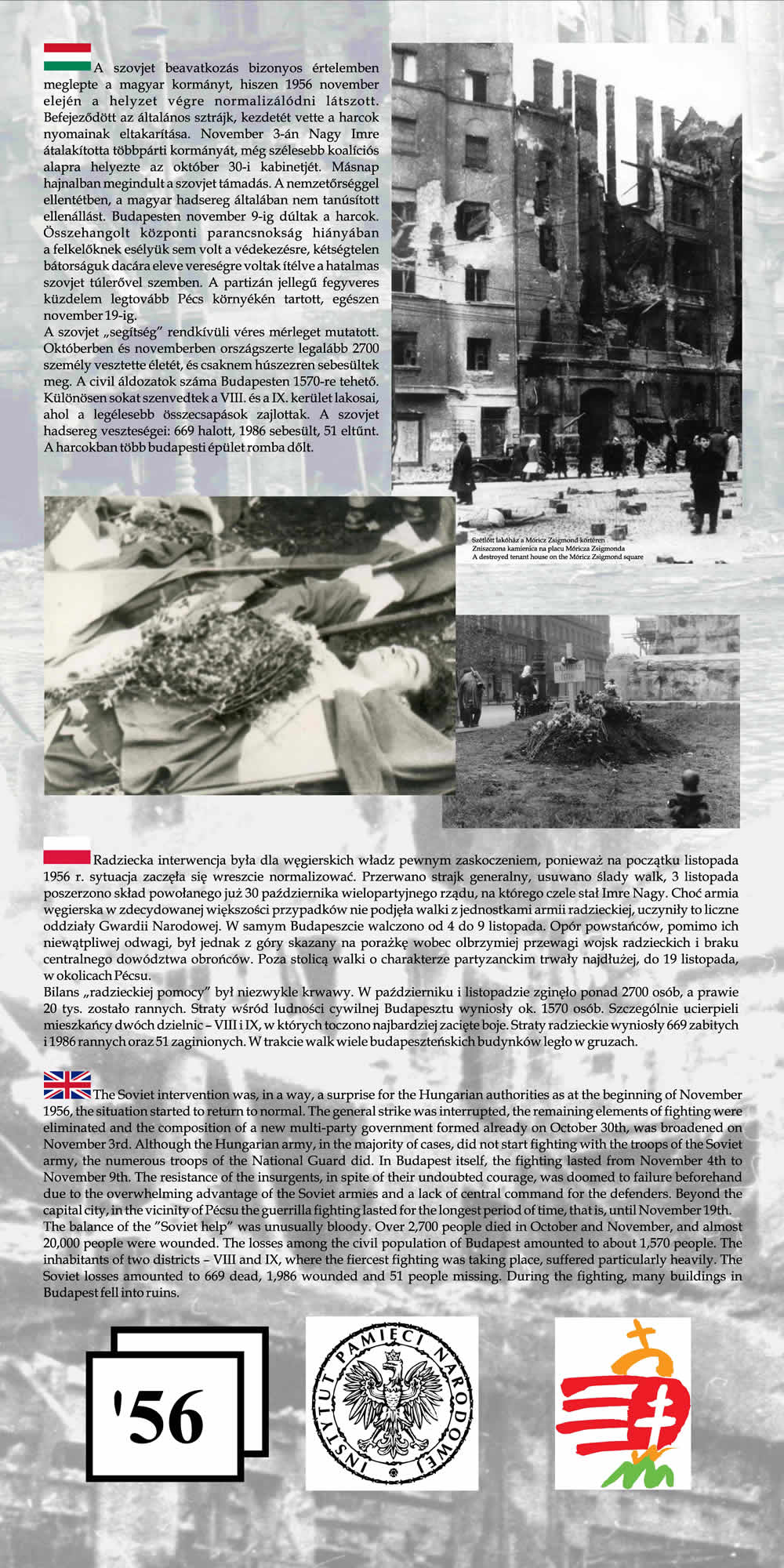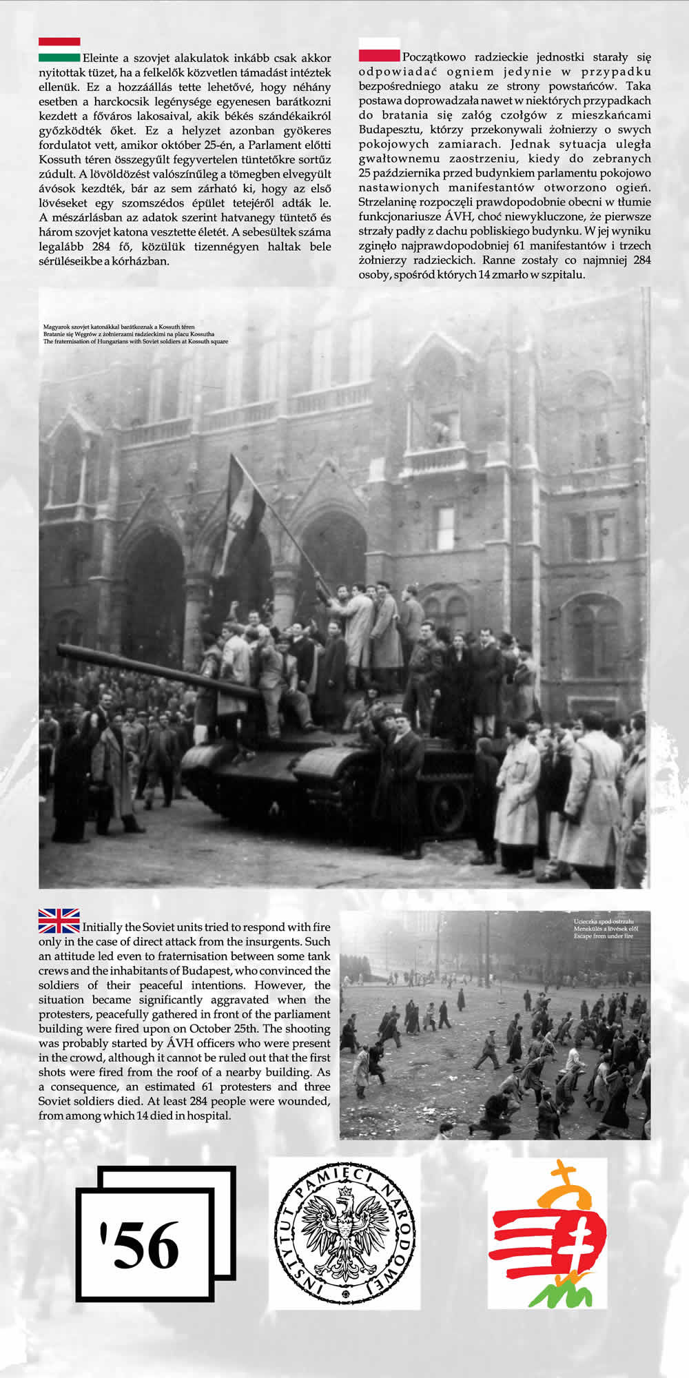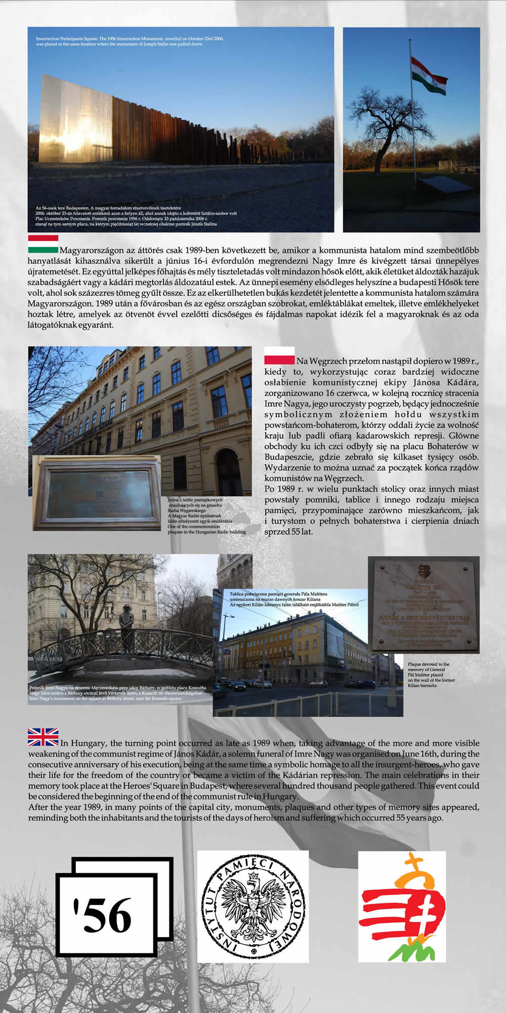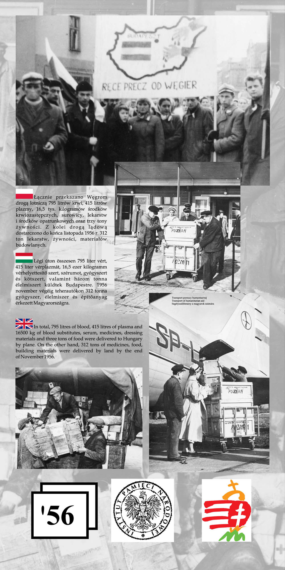 Wystawa przypomina wspólne losy Polaków i Węgrów w okresie komunizmu na przykładzie wydarzeń z 1956 r. Przedstawione na wystawie fotografie wraz z obszernym komentarzem historycznym nie tylko przypominają wydarzenia Poznańskiego Czerwca i Rewolucji Węgierskiej z 1956 r., ale starają się także pokazać, na ile pamięć o wydarzeniach sprzed prawie 55 lat jest obecna w przestrzeni obu miast poprzez pomniki, pamiątkowe płyty, groby poległych.