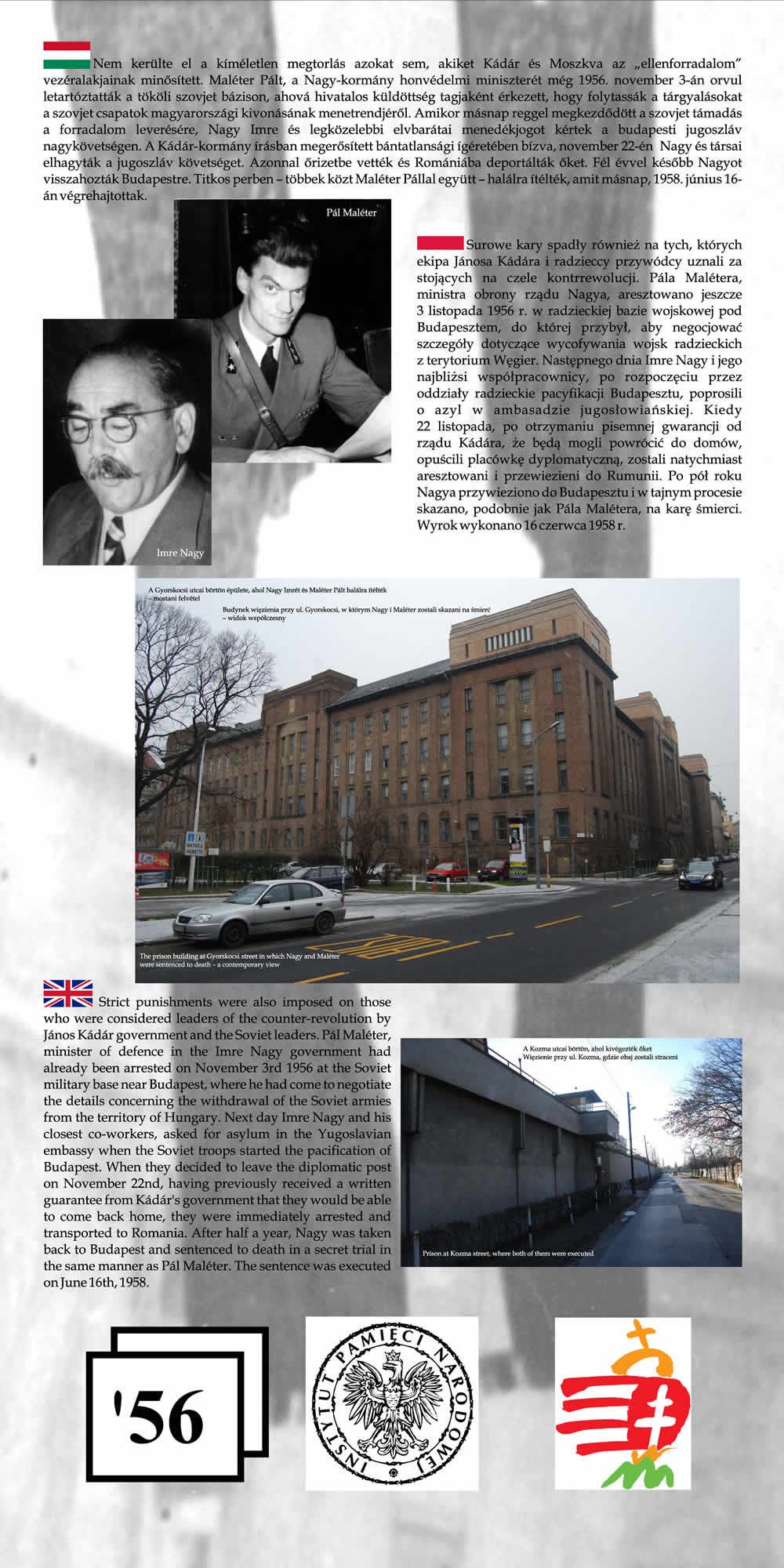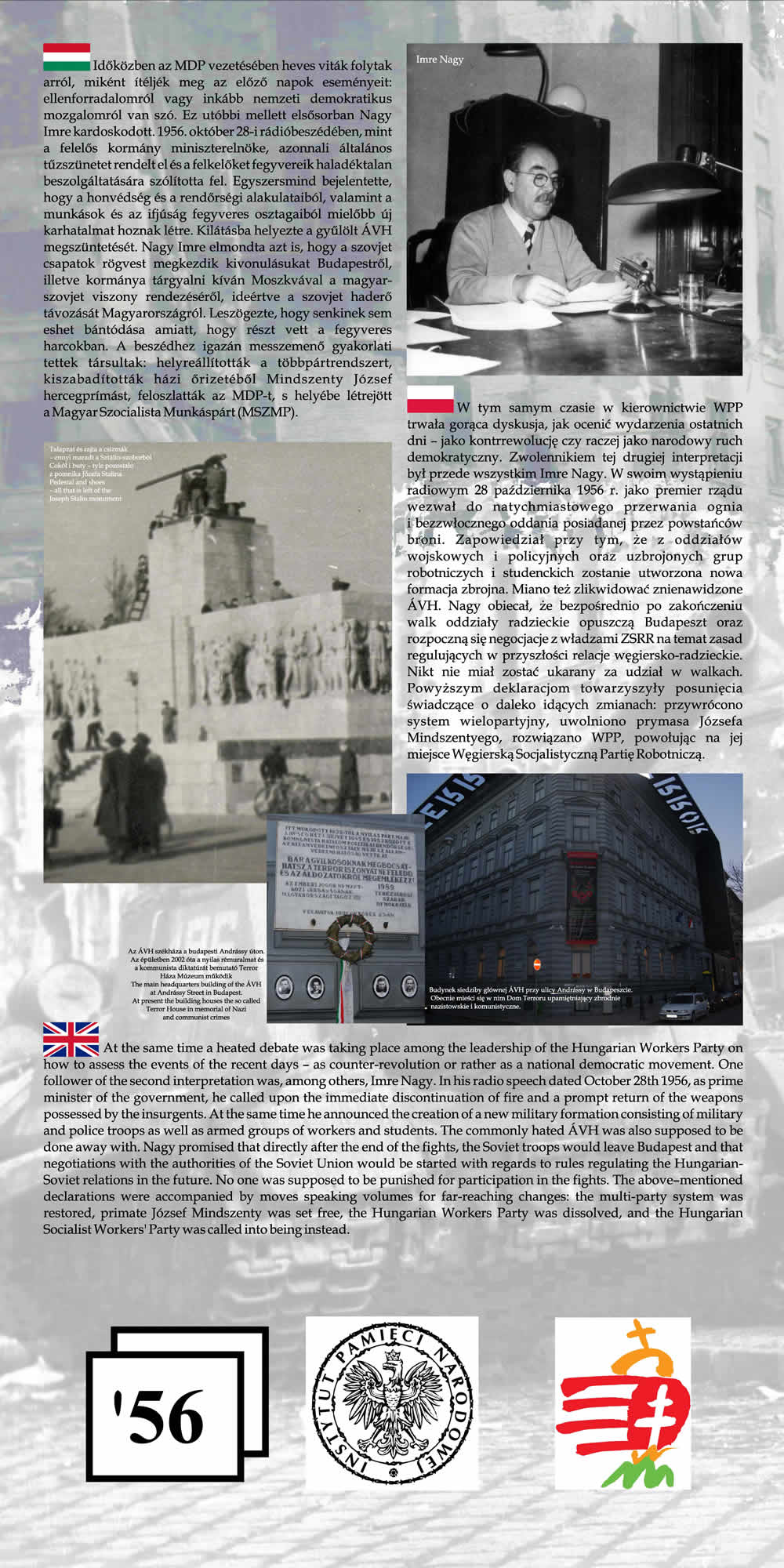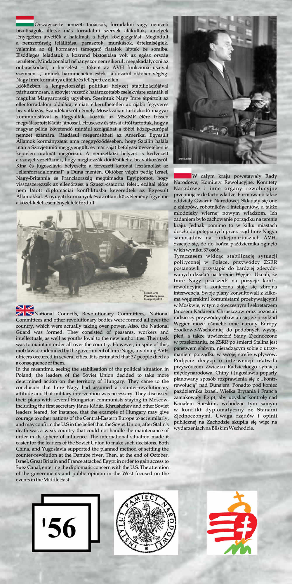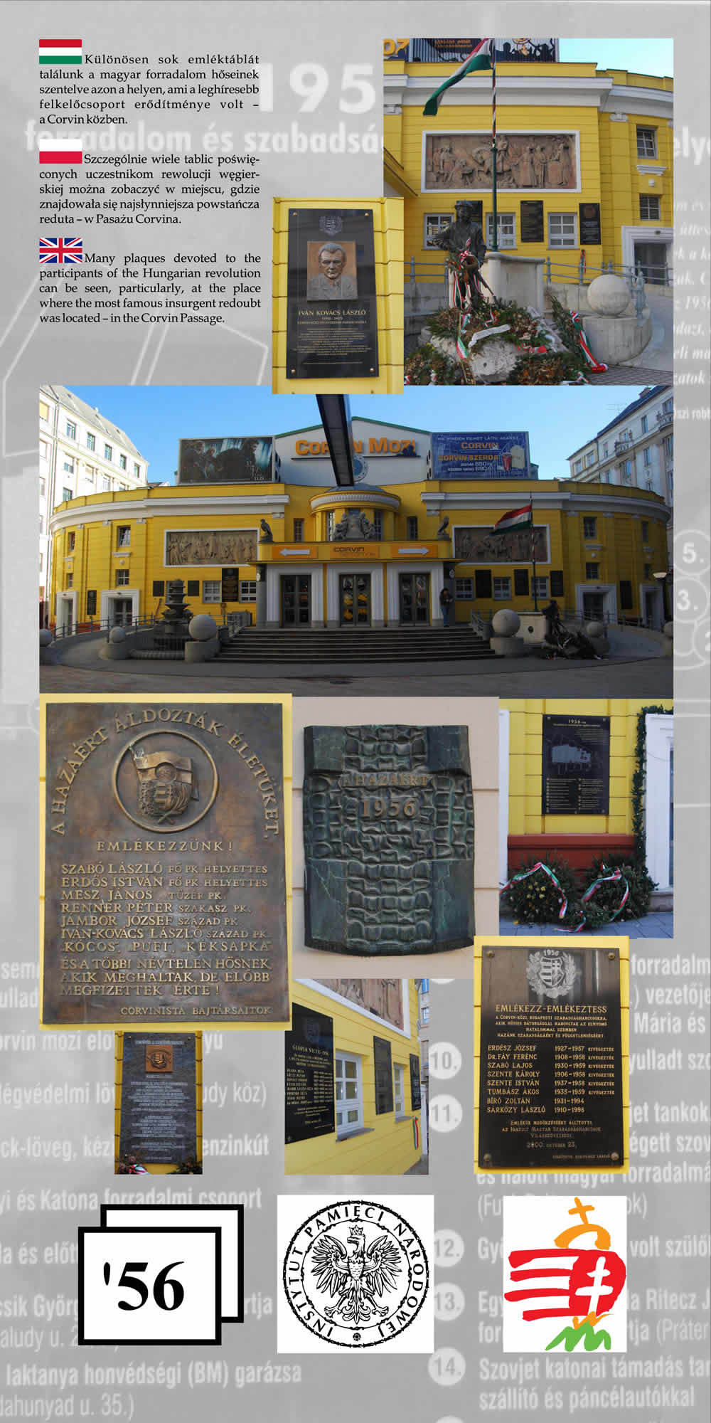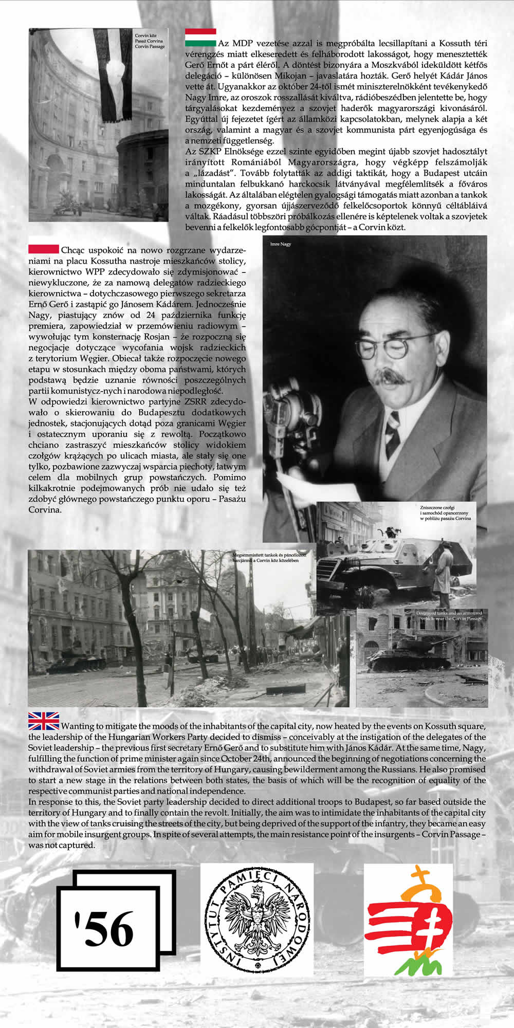 Wystawa przypomina wspólne losy Polaków i Węgrów w okresie komunizmu na przykładzie wydarzeń z 1956 r. Przedstawione na wystawie fotografie wraz z obszernym komentarzem historycznym nie tylko przypominają wydarzenia Poznańskiego Czerwca i Rewolucji Węgierskiej z 1956 r., ale starają się także pokazać, na ile pamięć o wydarzeniach sprzed prawie 55 lat jest obecna w przestrzeni obu miast poprzez pomniki, pamiątkowe płyty, groby poległych.