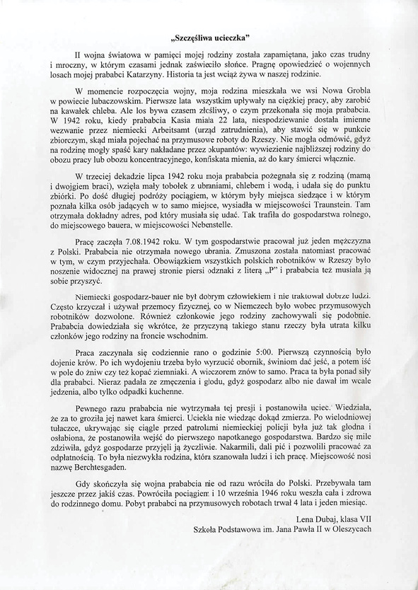 Lena Dubaj, Szkoła Podstawowa im. Jana Pawła II w Oleszycach, tytuł pracy: Szczęśliwa ucieczka,