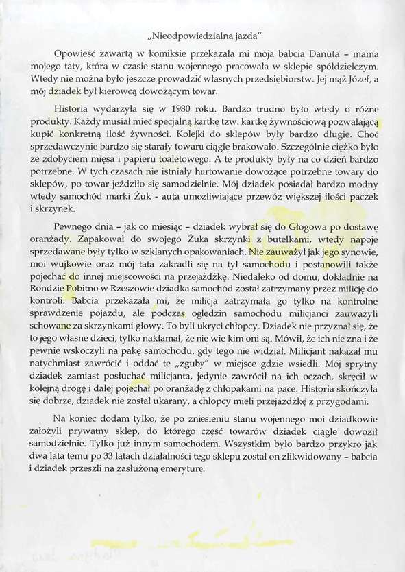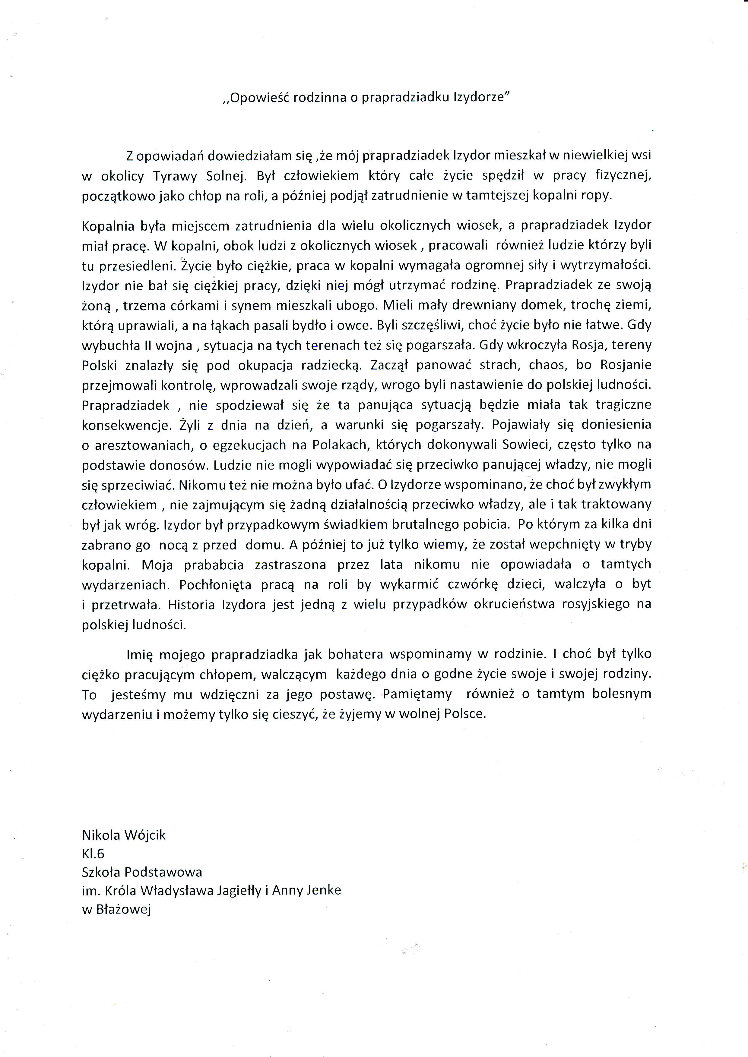 i Anny Jenke w Błażowej, tytuł pracy: Opowieść rodzinna o prapradziadku Izydorze,