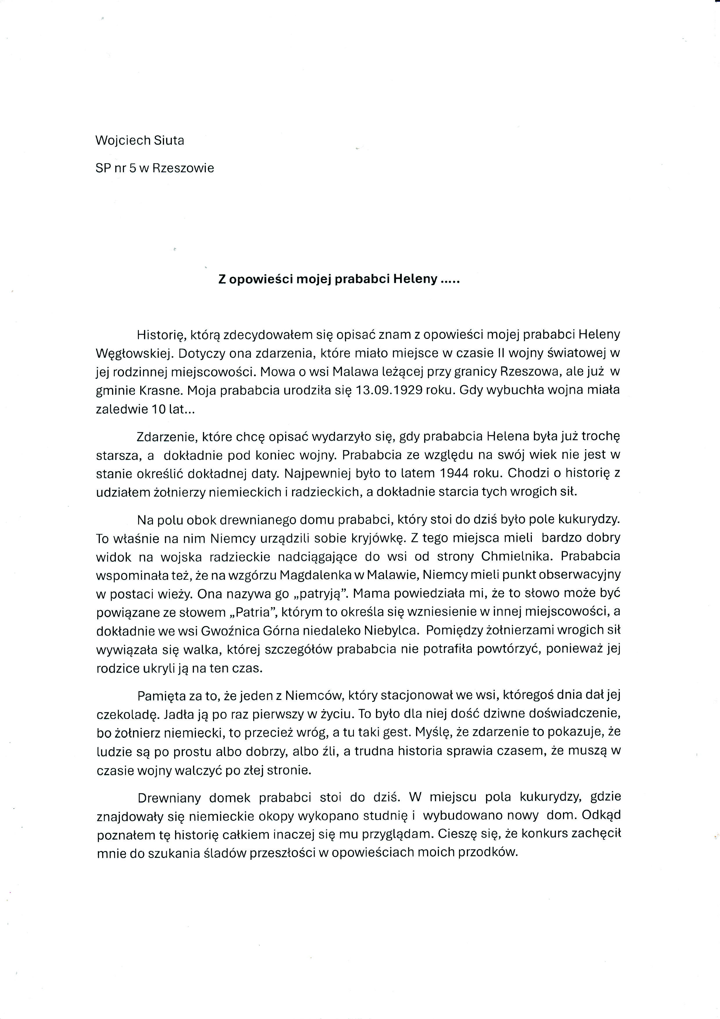 Daria Chrobak, Zespół Szkół w Orzechówce Szkoła Podstawowa im. Króla Władysława Jagiełły i Królowej Jadwigi, tytuł pracy: Ostrzelany próg domu rodzinnego i krok od śmierci. Obraz wojny mojego pradziadka Henryka i jego młodszego brata, kiedy to Niemcy celowali do wówczas tam stacjonujących Rosjan,