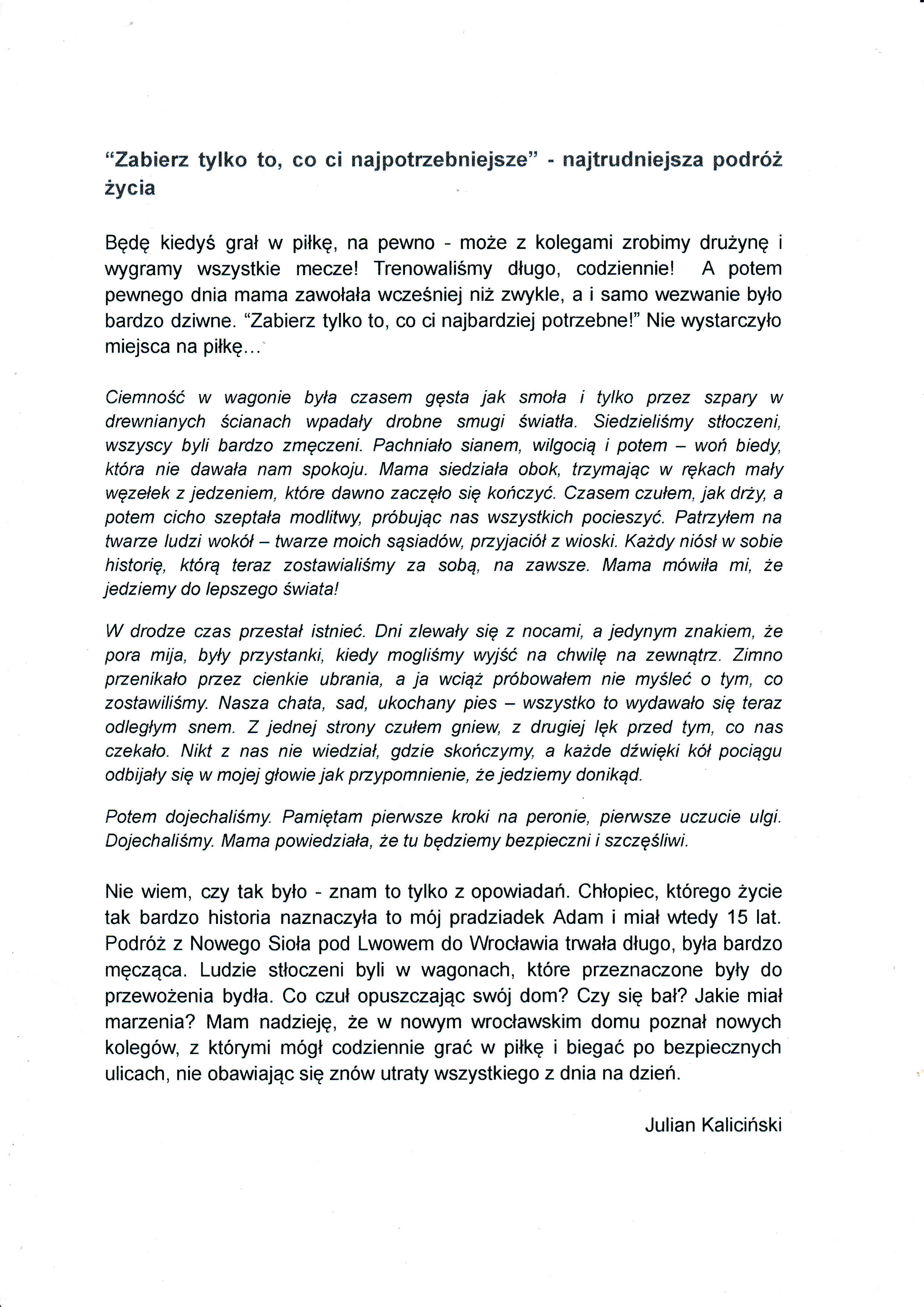 Julian Kaliciński, Szkoła Podstawowa im. Ks. Jana Twardowskiego w Niebylcu, tytuł pracy: „Zabierz tylko to co najpotrzebniejsze”. Najtrudniejsza podróż życia,