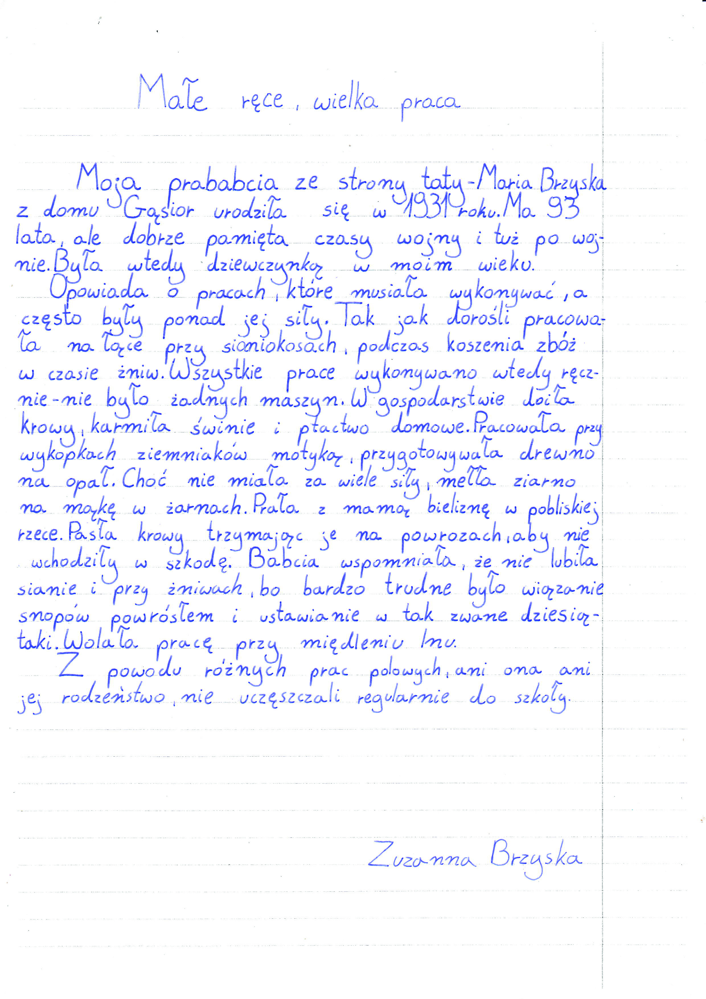 Zuzanna Brzyska, Szkoła Podstawowa im. bł. ks. Jerzego Popiełuszki w Majdanie Sieniawskim, tytuł pracy: Małe ręce, wielka praca – codzienność dzieci na wsi po II wojnie światowej,