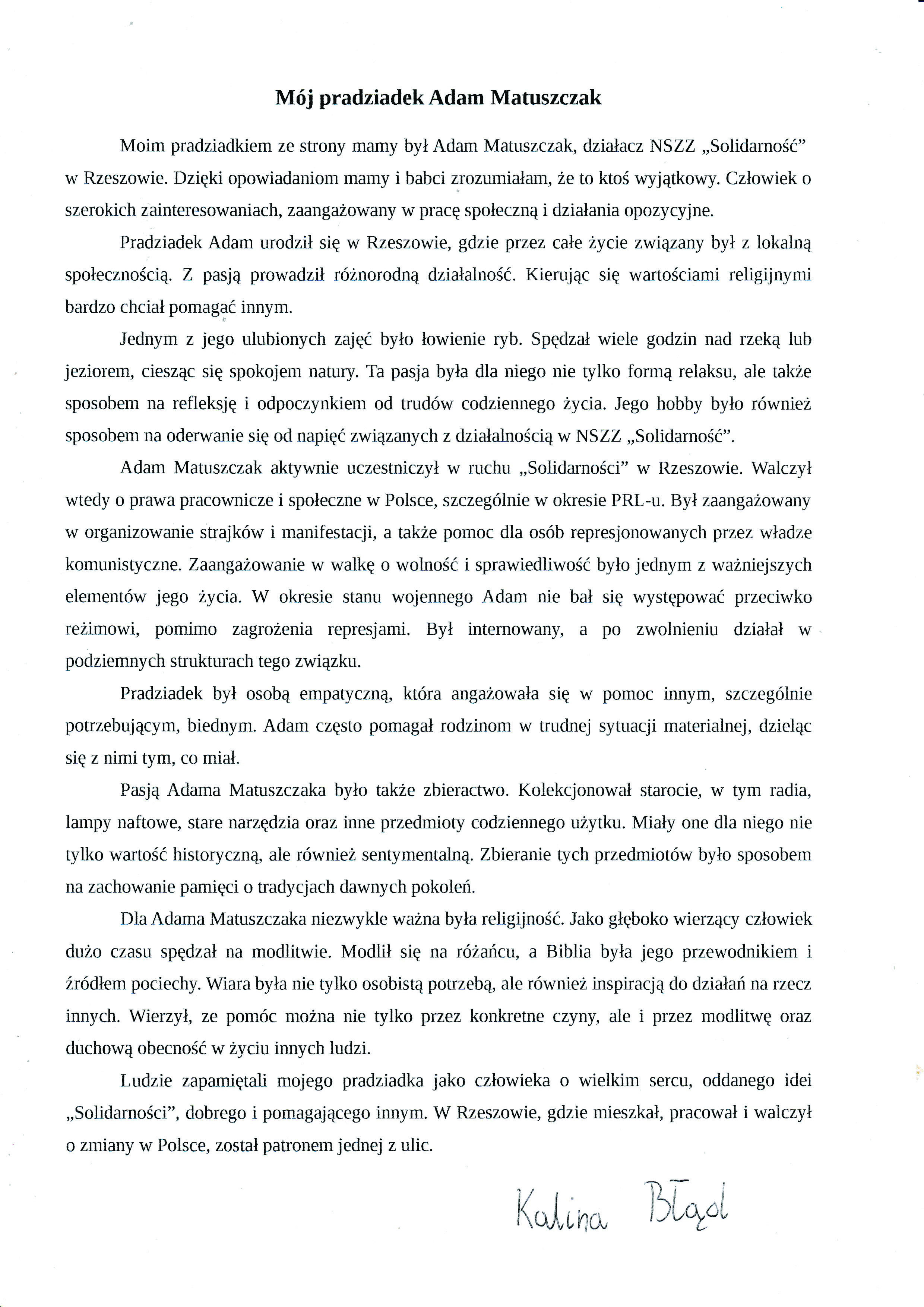 Kalina Błąd, Szkoła Podstawowa Nr 1 im. H. Sienkiewicza w Kolbuszowej, tytuł pracy: Mój pradziadek Adam Matuszczak,