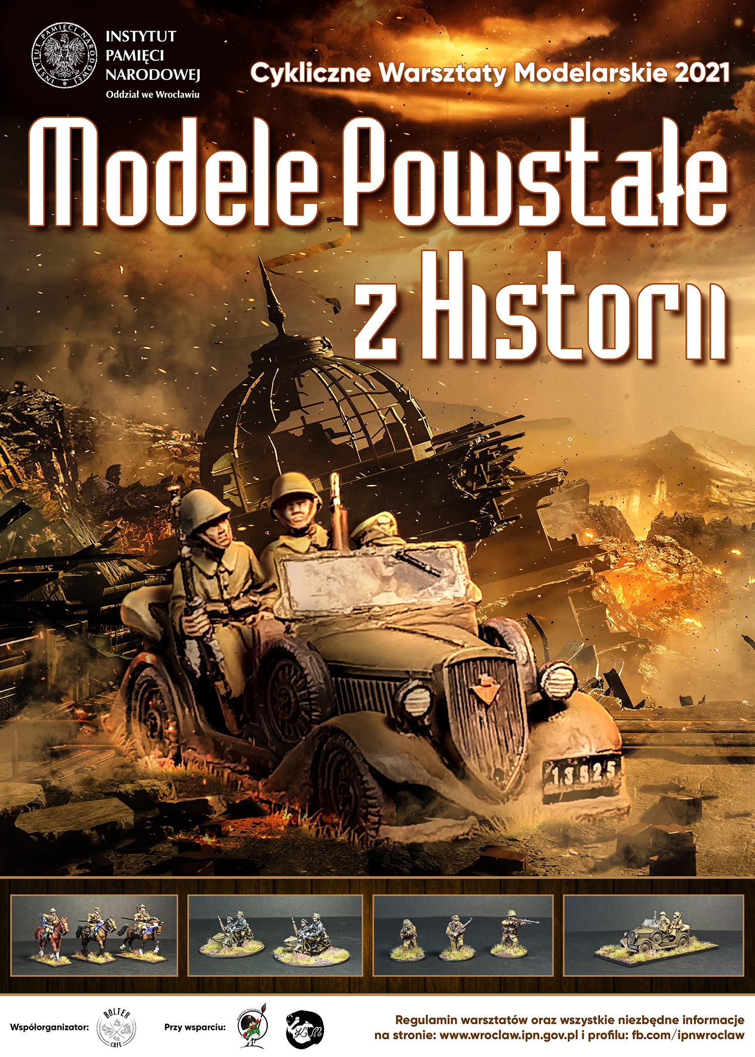 Co miesiąc będziemy proponować Państwu udział w warsztatach modelarskich, przeznaczonych dla trzech grup wiekowych (8–11, 12–15, 16+), których temat każdorazowo związany będzie z ważną rocznicą historyczną. Zajęciom praktycznym – sklejaniu i malowaniu – towarzyszyć będą krótkie prelekcje, przybliżające realia odpowiedniej rocznicy i związek z nią wybranego modelu. Autorzy najlepszych prac, wykonanych podczas warsztatów, będą wyróżniani.Informacje o terminie zajęć danej grupy wiekowej, temacie warsztatów, planowanym czasie ich trwania, ewentualnych dodatkowych, obowiązujących podczas zajęć, zasadach BHP publikowane będą każdorazowo na stronie internetowej https://wroclaw.ipn.gov.pl/ oraz na profilach Oddziału IPN we Wrocławiu i Bolter.pl w portalu Facebook.