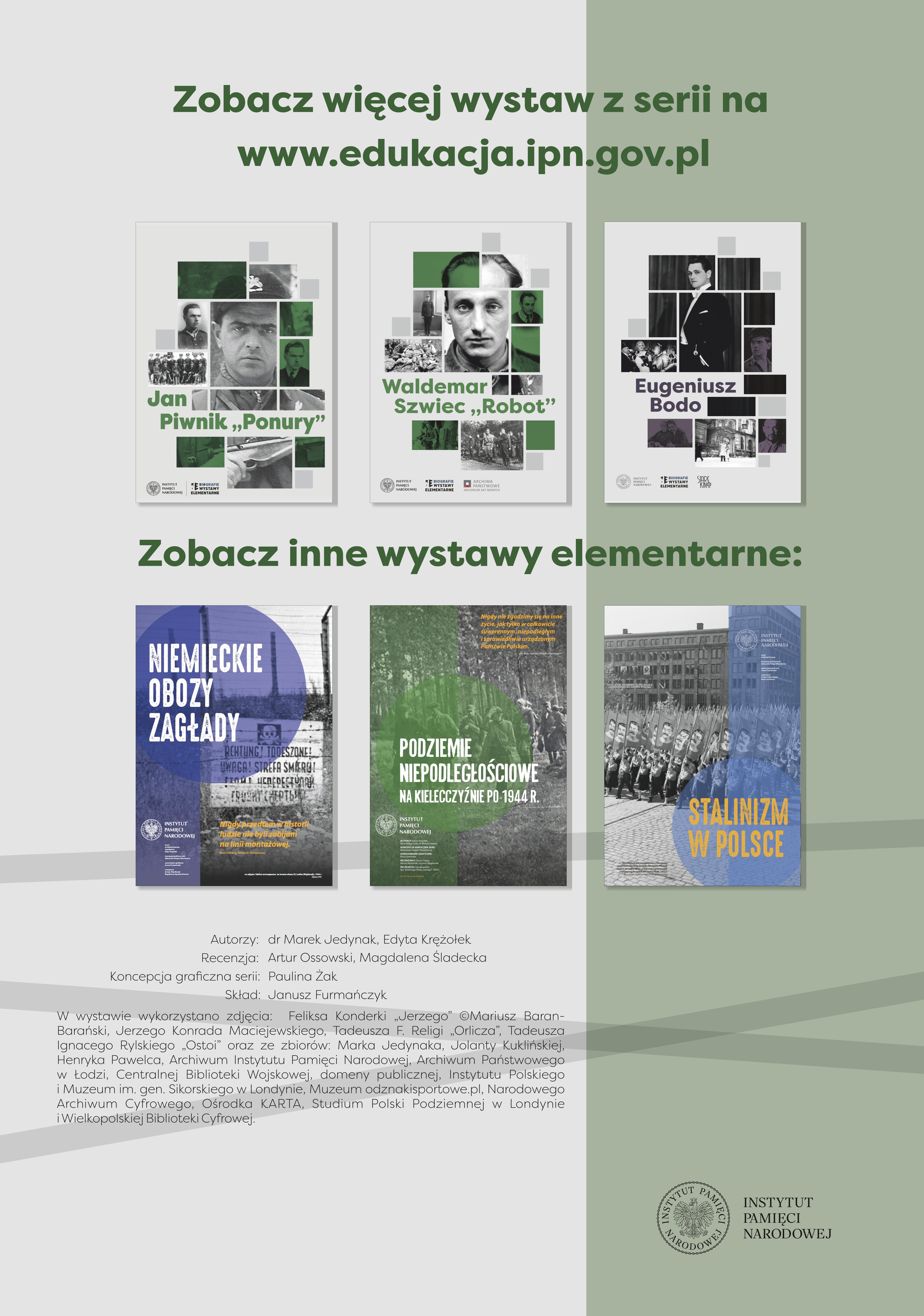 W wystawie wykorzystano zdjęcia: Feliksa Konderki „Jerzego” ©Mariusz Baran-Barański, Jerzego Konrada Maciejewskiego, Tadeusza F. Religi „Orlicza”, Tadeusza Ignacego Rylskiego „Ostoi” oraz ze zbiorów: Marka Jedynaka, Jolanty Kuklińskiej, Henryka Pawelca, Archiwum Instytutu Pamięci Narodowej, Archiwum Państwowego w Łodzi, Centralnej Biblioteki Wojskowej, domeny publicznej, Instytutu Polskiego i Muzeum im. gen. Sikorskiego w Londynie, Muzeum odznakisportowe.pl, Narodowego Archiwum Cyfrowego, Ośrodka KARTA, Studium Polski Podziemnej w Londynie i Wielkopolskiej Biblioteki Cyfrowej.