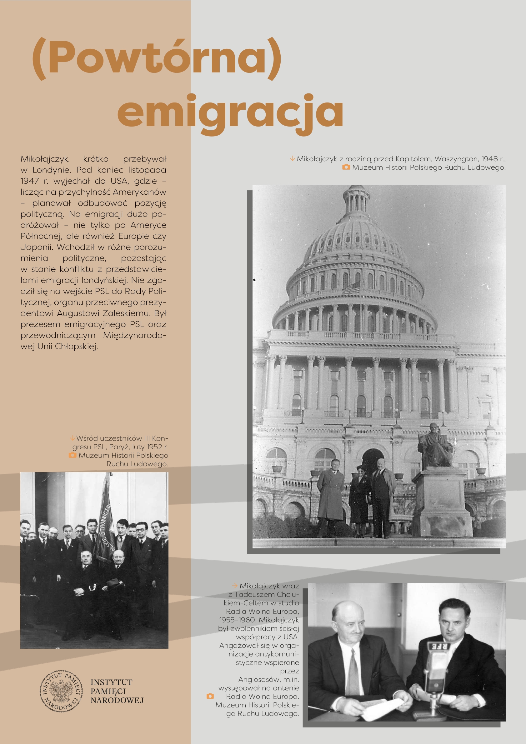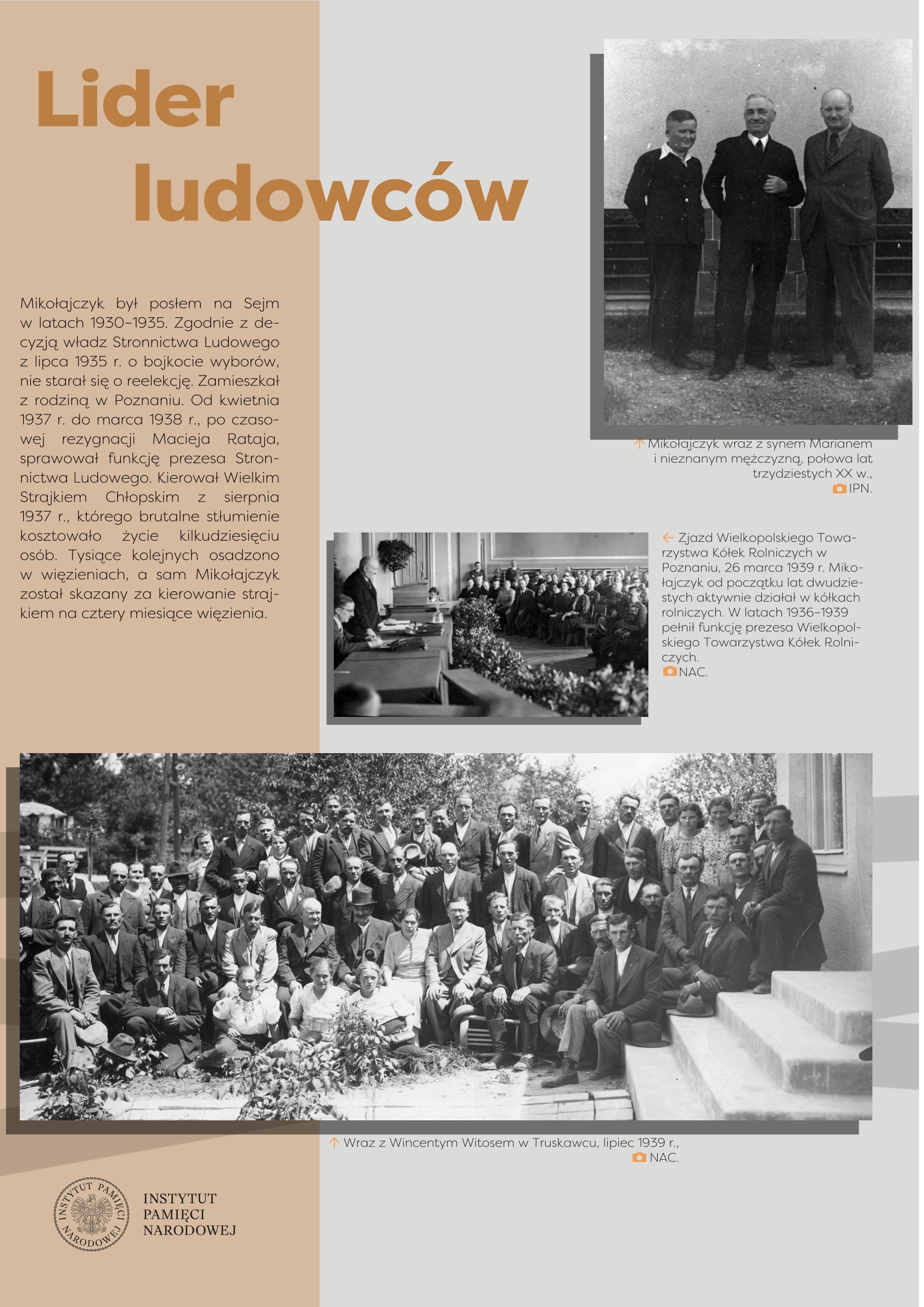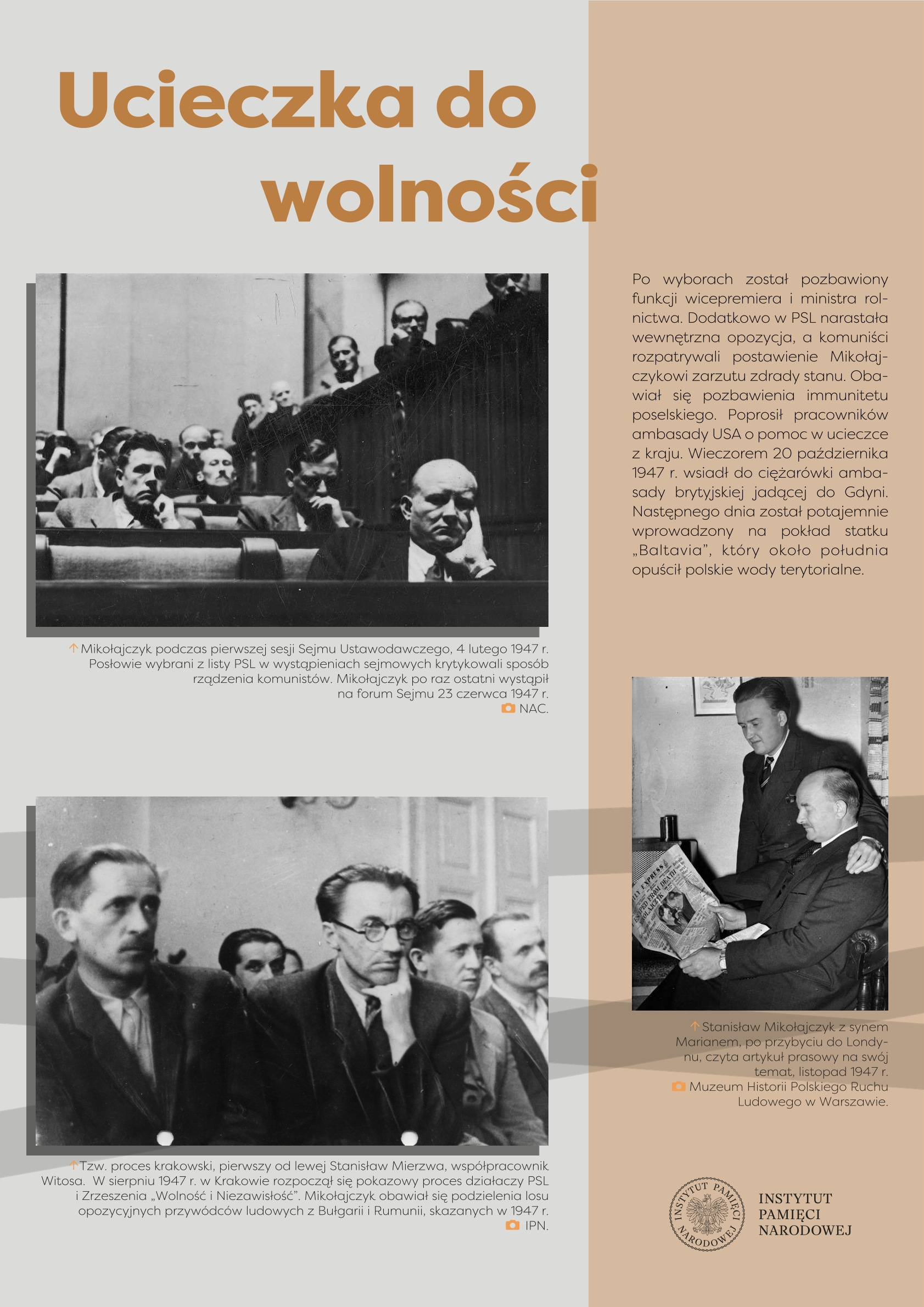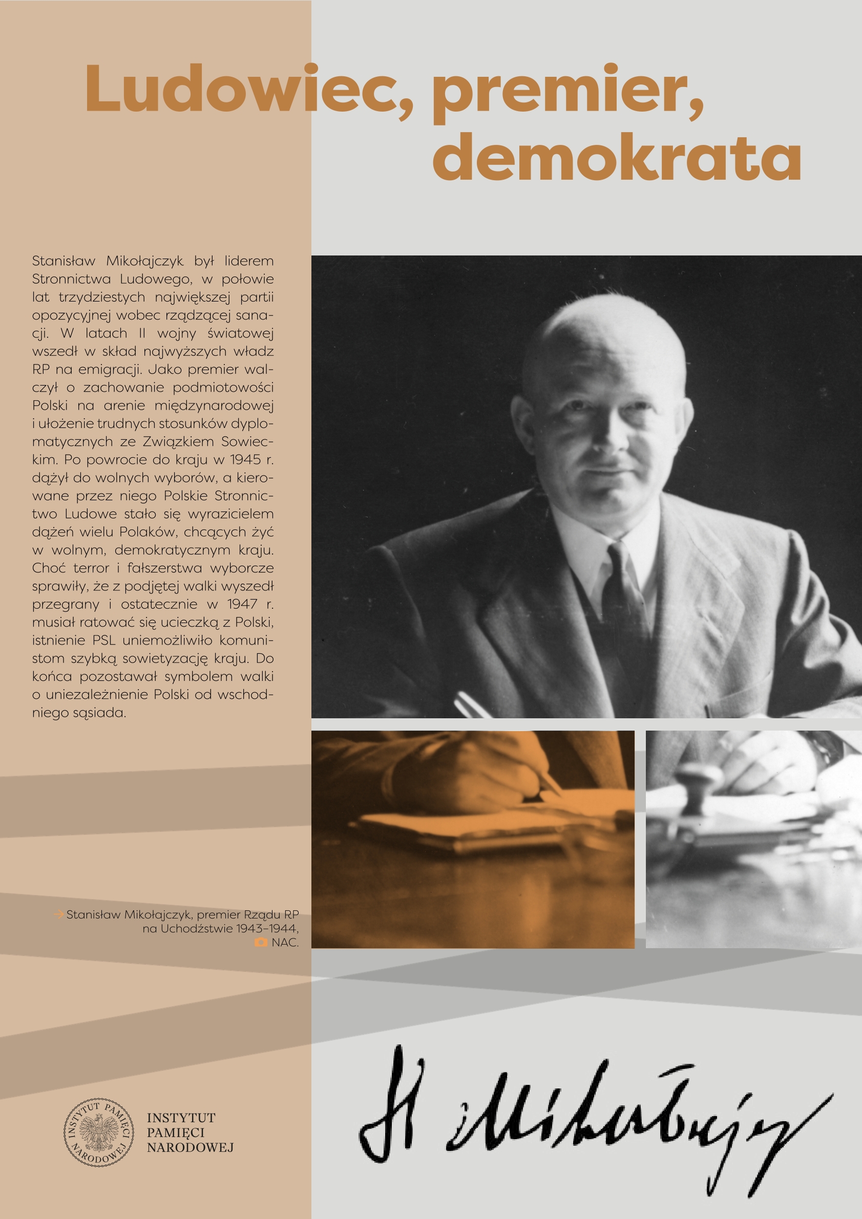 Wystawa przygotowana przez Referat Edukacji Narodowej Delegatury IPN w Kielcach ukazuje życie i działalność Stanisława Mikołajczyka, jednego z najważniejszych polityków polskich trzeciej i czwartej dekady XX w. Przed 1939 r. przewodził Stronnictwu Ludowemu, największej partii politycznej, opozycyjnej wobec rządzącej sanacji. W latach II wojny światowej znalazł się we władzach RP na Uchodźstwie, pełniąc funkcję premiera (1943–1944). Po zakończeniu wojny stanął na czele Polskiego Stronnictwa Ludowego – dążył do przeprowadzenia wolnych wyborów, w ten sposób próbując odsunąć komunistów od władzy. Fałszerstwa wyborcze, a następnie realna obawa przed represjami zmusiły go do powtórnej emigracji. Do końca życia pozostał krytykiem komunizmu i symbolem walki o uniezależnienie Polski od Związku Sowieckiego.