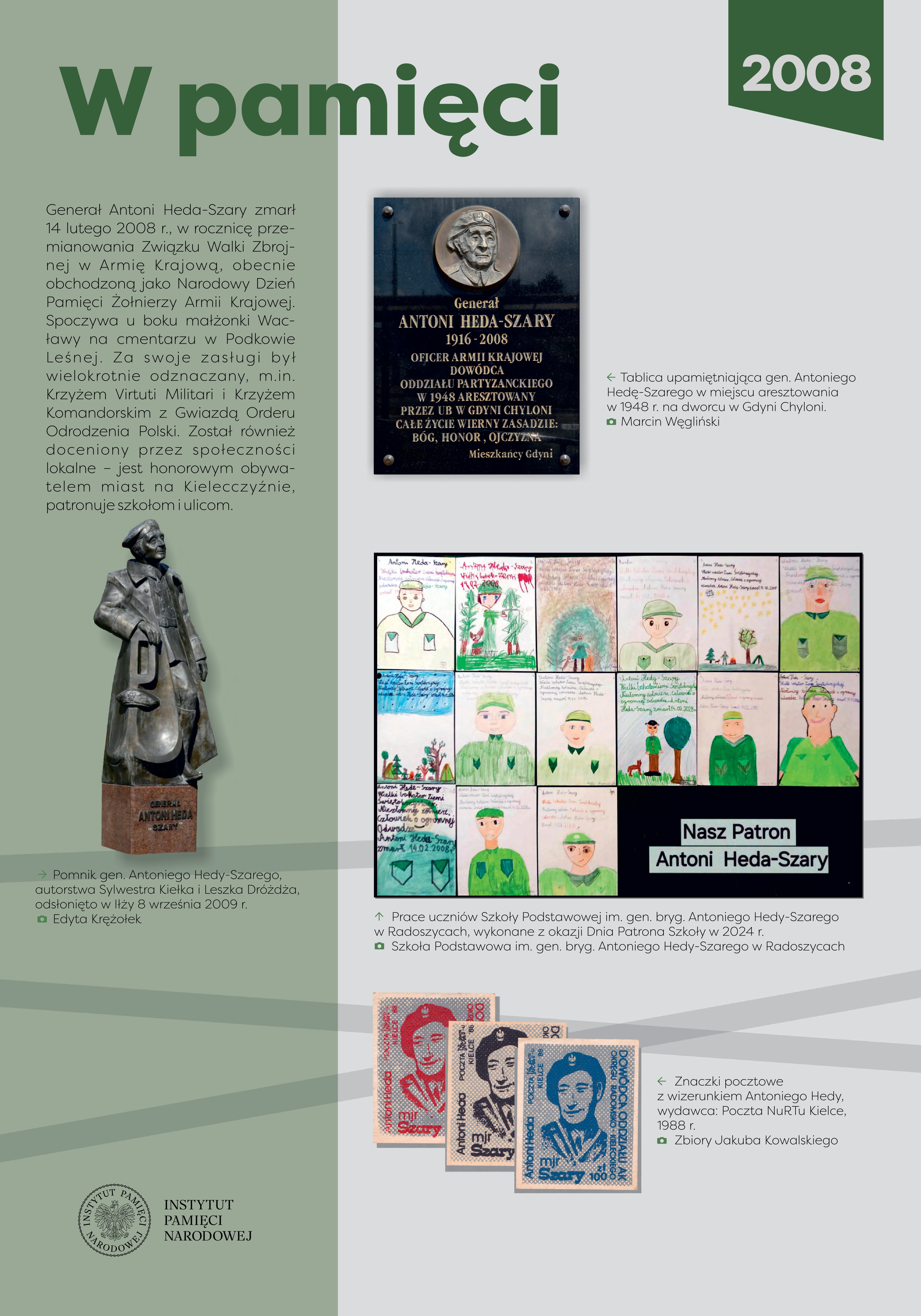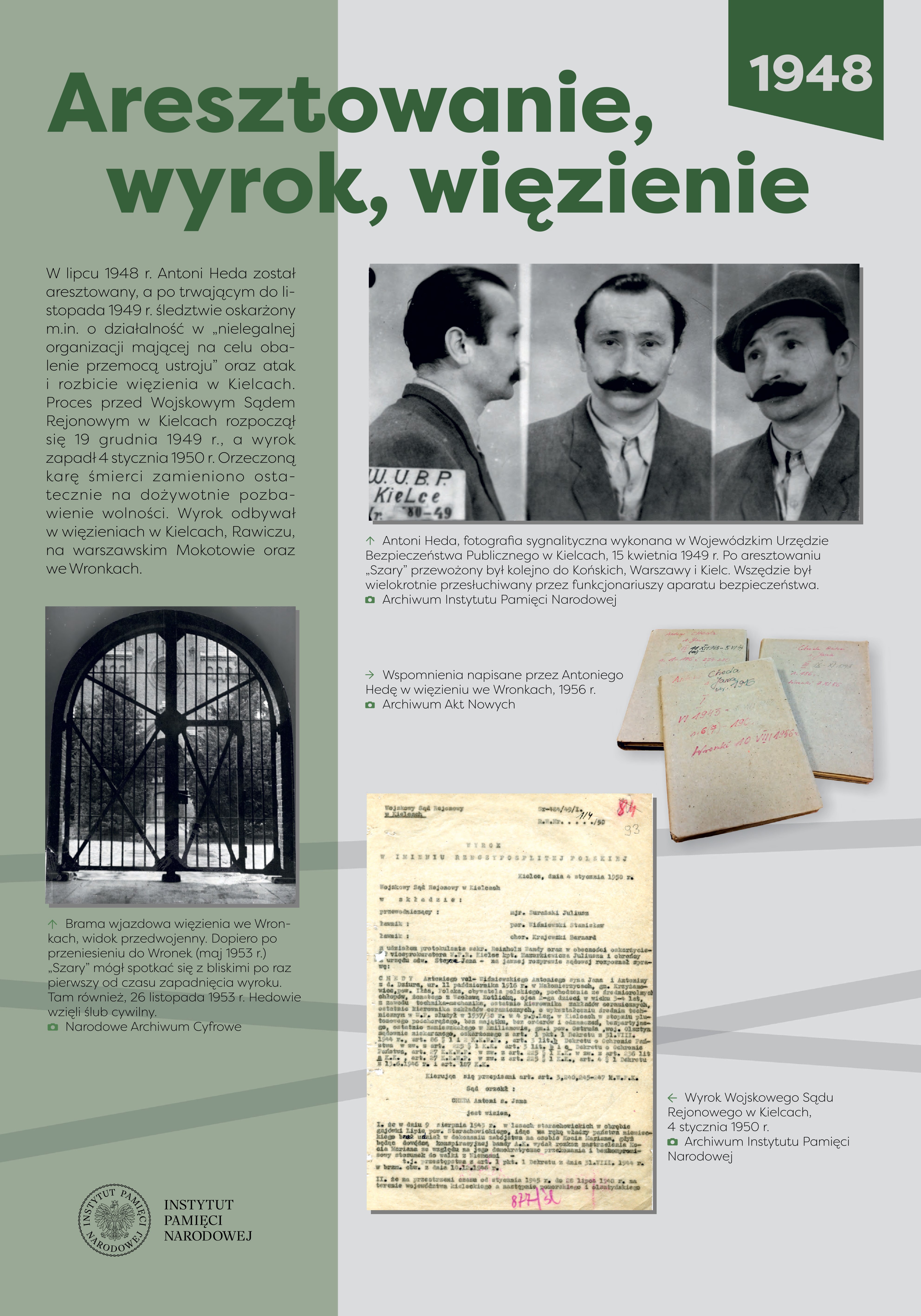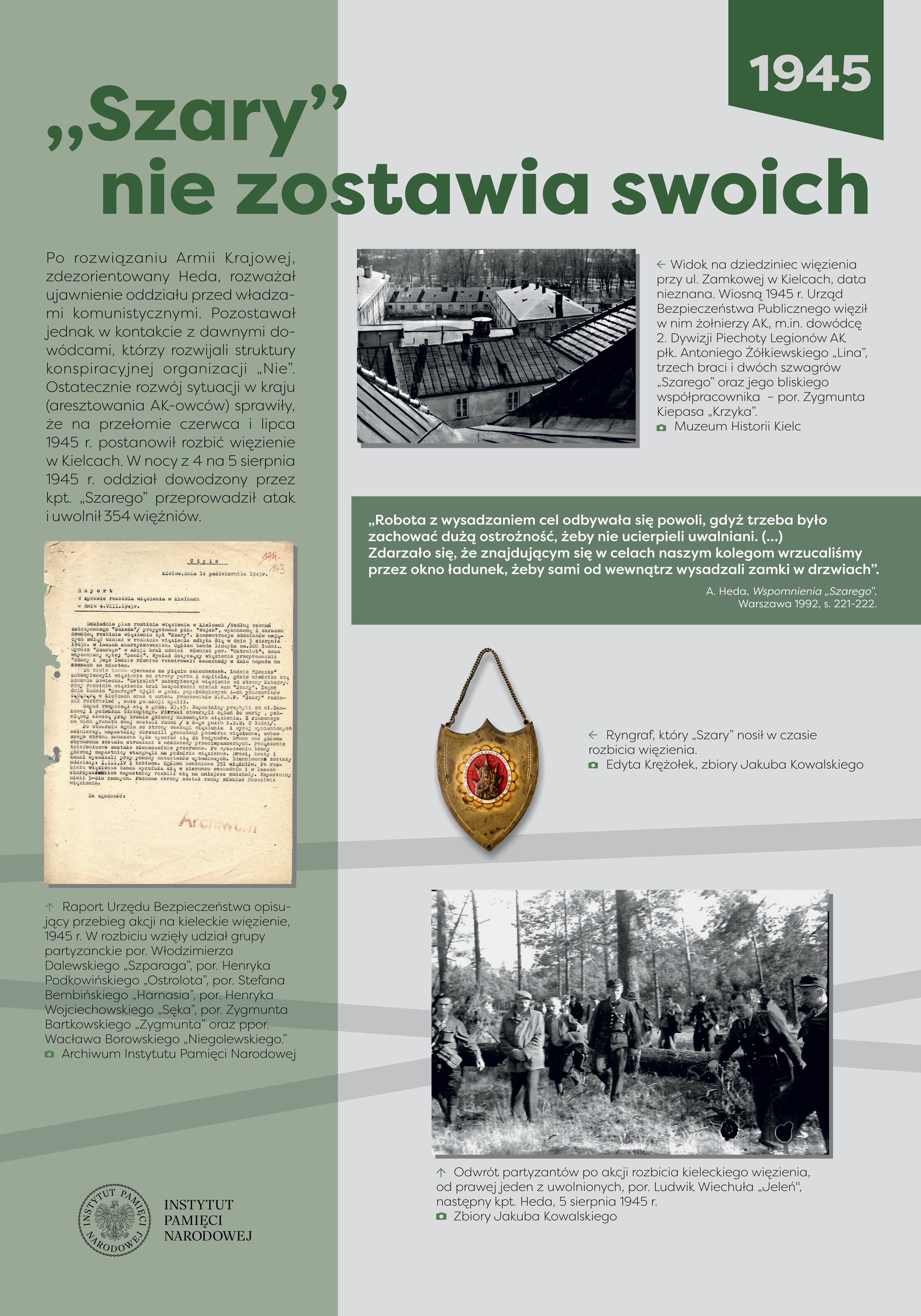 Antoni Heda-Szary (1916-2008) pochodził z rodziny chłopskiej, ukończył Państwową Średnią Szkołę Techniczną w Radomiu. Przed wojną pracował w fabryce zbrojeniowej w Starachowicach, odbył również zasadniczą służbę wojskową. We wrześniu wojnie 1939 r., jako plutonowy podchorąży, bronił zakładu pracy, a po zajęciu Starachowic przez Niemców dołączył do 51. pp. 12. DP. Po demobilizacji powrócił w rodzinne strony. Od lutego 1940 r. był członkiem Związku Walki Zbrojnej, dowodził placówką w Obwodzie Iłża. W lipcu 1940 r. został aresztowany przez NKWD podczas próby przekroczenia granicy niemiecko-sowieckiej, trafił do twierdzy brzeskiej. Skazany na 12 lat łagrów, uniknął zesłania na Syberię po niemieckim ataku na ZSRS, jednak Niemcy osadzili go w obozie dla jeńców sowieckich. Zbiegł stamtąd w grudniu 1941 r. i powrócił w okolice Iłży, gdzie kontynuował działalność w konspiracji. Od połowy 1942 r. komendant Podobwodu Iłża AK, współpracował ze zgrupowaniem mjr. Jana Piwnika „Ponurego”, a 6 sierpnia 1943 r. przeprowadził brawurową akcję zdobycia więzienia w Starachowicach, z którego uwolniono ok. 80 więźniów. Od jesieni 1943 r. dowodził oddziałem partyzanckim, który przeprowadził szereg akcji przeciwko Niemcom, m.in. 5/6 czerwca 1944 r. opanował Końskie i uwolnił 70 osadzonych. W czasie akcji „Burza” dowodził II batalionem 3. pp. 2. DP Leg. AK, a 8 października objął dowództwo nad pułkiem. Po rozwiązaniu AK i zakończeniu wojny rozważał ujawnienie oddziału przed władzami komunistycznymi. Jednak ostatecznie, w nocy z 4 na 5 sierpnia 1945 r., na czele ponad dwustuosobowego zgrupowania partyzanckiego, rozbił komunistyczne więzienie w Kielcach, uwalniając 354 więźniów. Po akcji ukrywał się, mieszkał i pracował w różnych miejscach Polski. Aresztowany przez Urząd Bezpieczeństwa w Gdyni 27 lipca 1948 r., został 4 stycznia 1950 r. skazany przez Wojskowy Sąd Rejonowy w Kielcach na karę śmierci, zmienioną ostatecznie na dożywotnie pozbawienie wolności. W 1956 r. wyszedł na wolność, podjął aktywną działalność w środowisku byłych żołnierzy AK. W późniejszych latach współpracował z opozycyjnymi ugrupowaniami politycznymi oraz NSZZ „Solidarność”, w czasie stanu wojennego był internowany. Po 1989 r. prowadził działalność kombatancką i polityczną. Za zasługi odznaczony został Krzyżem Srebrnym Orderu Wojennego Virtuti Militari, kilkukrotnie Krzyżem Walecznych oraz innymi odznaczeniami bojowymi, a w 2006 r. awansowany na stopień generała brygady.