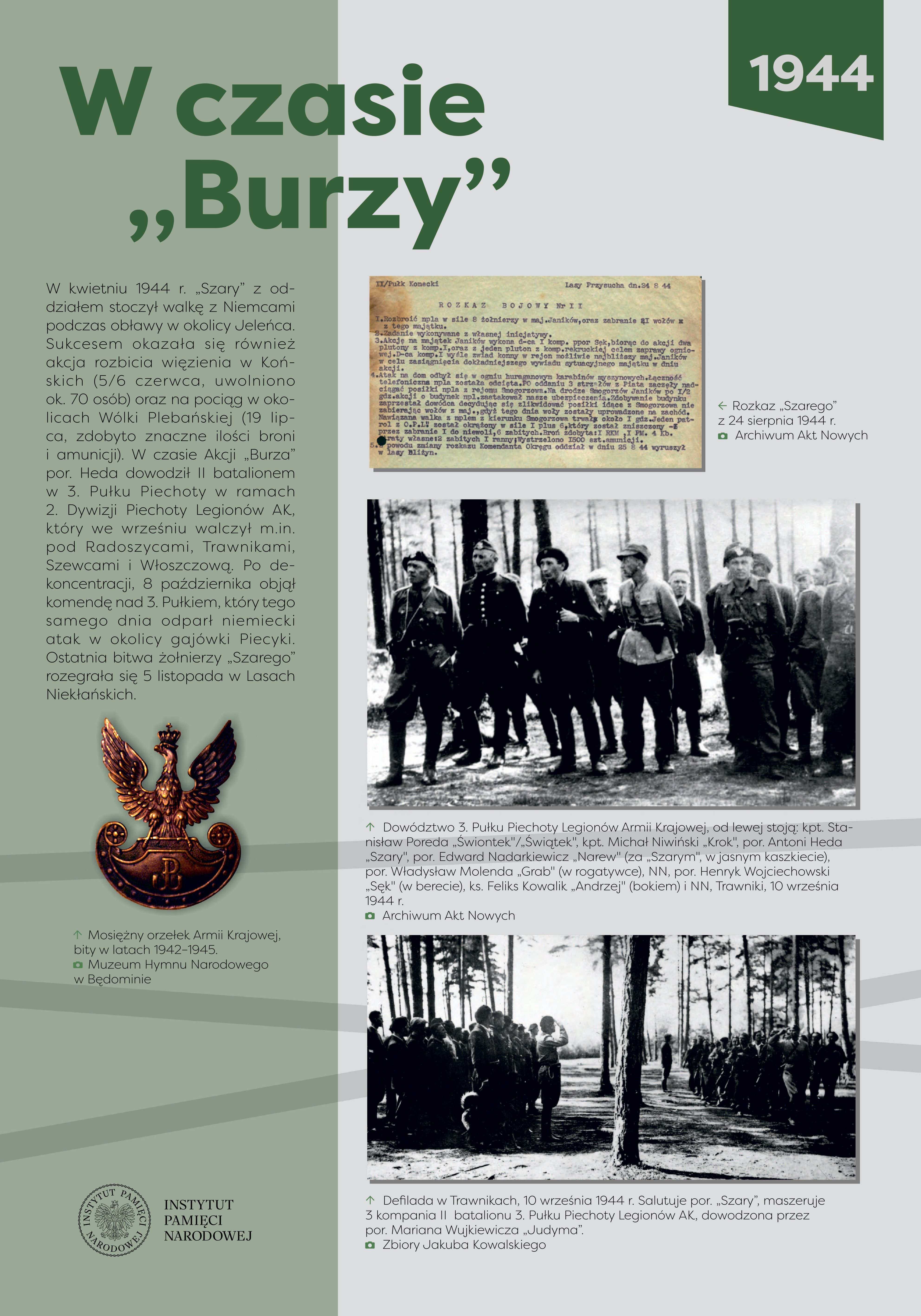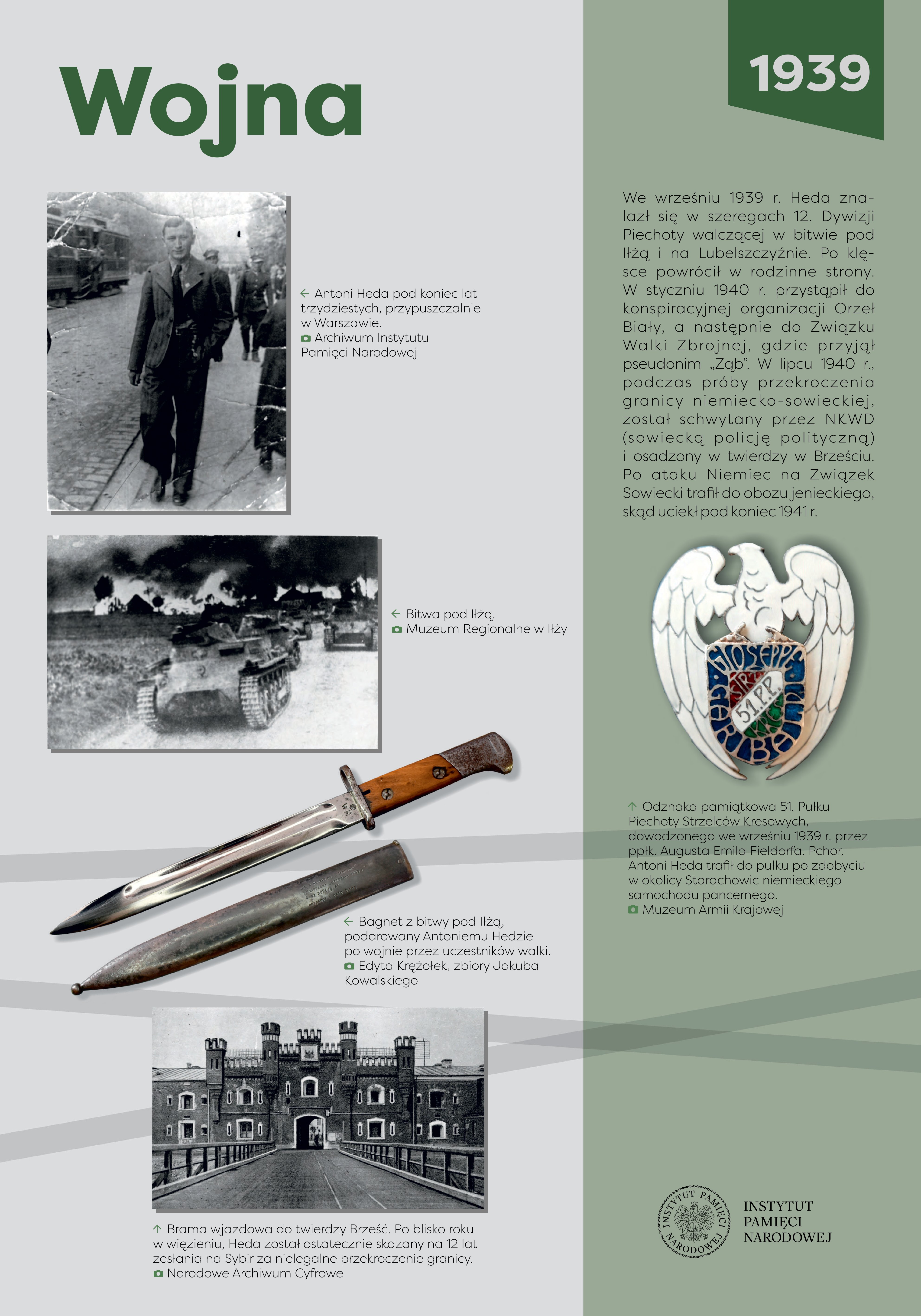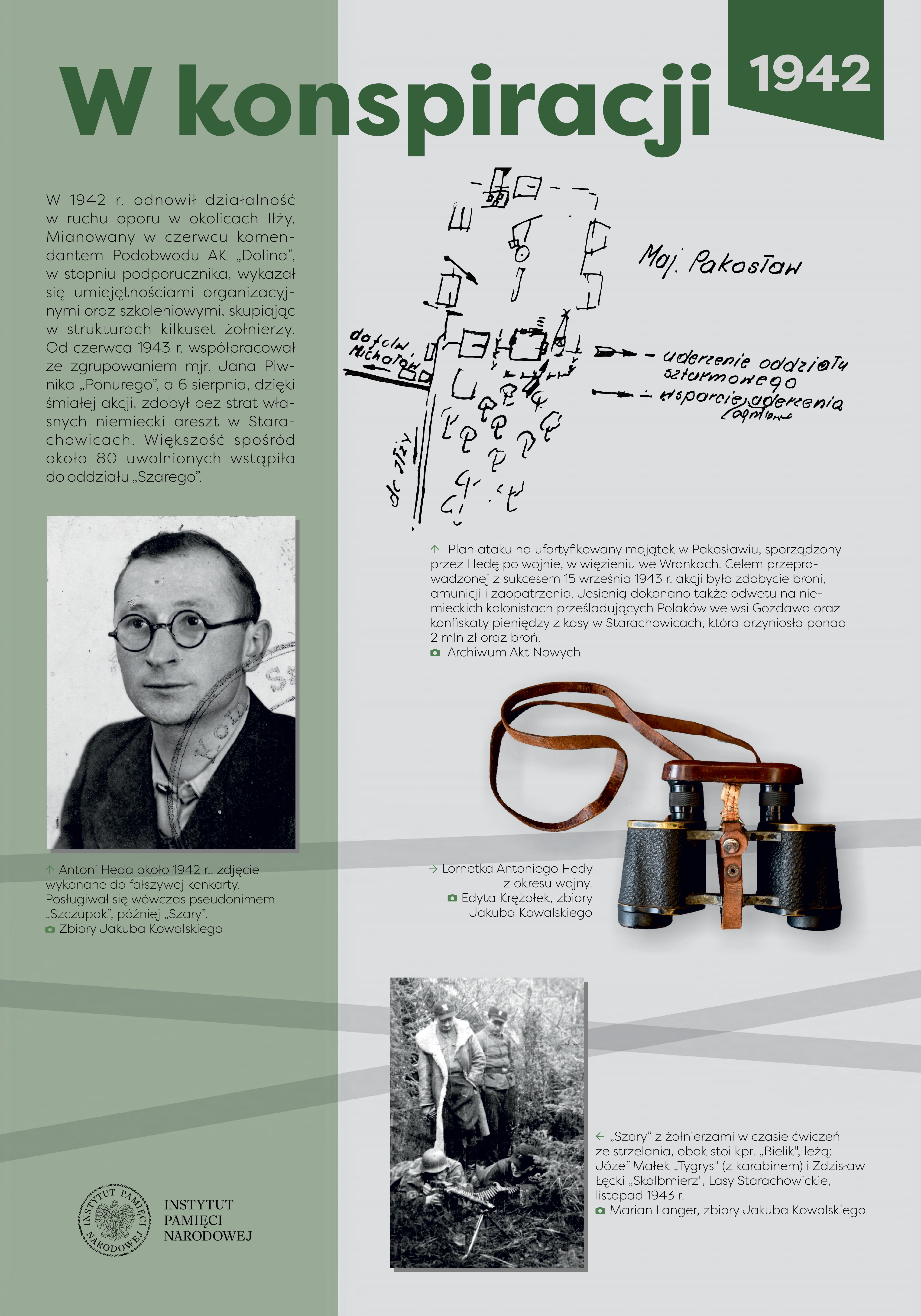 Antoni Heda-Szary (1916-2008) pochodził z rodziny chłopskiej, ukończył Państwową Średnią Szkołę Techniczną w Radomiu. Przed wojną pracował w fabryce zbrojeniowej w Starachowicach, odbył również zasadniczą służbę wojskową. We wrześniu wojnie 1939 r., jako plutonowy podchorąży, bronił zakładu pracy, a po zajęciu Starachowic przez Niemców dołączył do 51. pp. 12. DP. Po demobilizacji powrócił w rodzinne strony. Od lutego 1940 r. był członkiem Związku Walki Zbrojnej, dowodził placówką w Obwodzie Iłża. W lipcu 1940 r. został aresztowany przez NKWD podczas próby przekroczenia granicy niemiecko-sowieckiej, trafił do twierdzy brzeskiej. Skazany na 12 lat łagrów, uniknął zesłania na Syberię po niemieckim ataku na ZSRS, jednak Niemcy osadzili go w obozie dla jeńców sowieckich. Zbiegł stamtąd w grudniu 1941 r. i powrócił w okolice Iłży, gdzie kontynuował działalność w konspiracji. Od połowy 1942 r. komendant Podobwodu Iłża AK, współpracował ze zgrupowaniem mjr. Jana Piwnika „Ponurego”, a 6 sierpnia 1943 r. przeprowadził brawurową akcję zdobycia więzienia w Starachowicach, z którego uwolniono ok. 80 więźniów. Od jesieni 1943 r. dowodził oddziałem partyzanckim, który przeprowadził szereg akcji przeciwko Niemcom, m.in. 5/6 czerwca 1944 r. opanował Końskie i uwolnił 70 osadzonych. W czasie akcji „Burza” dowodził II batalionem 3. pp. 2. DP Leg. AK, a 8 października objął dowództwo nad pułkiem. Po rozwiązaniu AK i zakończeniu wojny rozważał ujawnienie oddziału przed władzami komunistycznymi. Jednak ostatecznie, w nocy z 4 na 5 sierpnia 1945 r., na czele ponad dwustuosobowego zgrupowania partyzanckiego, rozbił komunistyczne więzienie w Kielcach, uwalniając 354 więźniów. Po akcji ukrywał się, mieszkał i pracował w różnych miejscach Polski. Aresztowany przez Urząd Bezpieczeństwa w Gdyni 27 lipca 1948 r., został 4 stycznia 1950 r. skazany przez Wojskowy Sąd Rejonowy w Kielcach na karę śmierci, zmienioną ostatecznie na dożywotnie pozbawienie wolności. W 1956 r. wyszedł na wolność, podjął aktywną działalność w środowisku byłych żołnierzy AK. W późniejszych latach współpracował z opozycyjnymi ugrupowaniami politycznymi oraz NSZZ „Solidarność”, w czasie stanu wojennego był internowany. Po 1989 r. prowadził działalność kombatancką i polityczną. Za zasługi odznaczony został Krzyżem Srebrnym Orderu Wojennego Virtuti Militari, kilkukrotnie Krzyżem Walecznych oraz innymi odznaczeniami bojowymi, a w 2006 r. awansowany na stopień generała brygady.