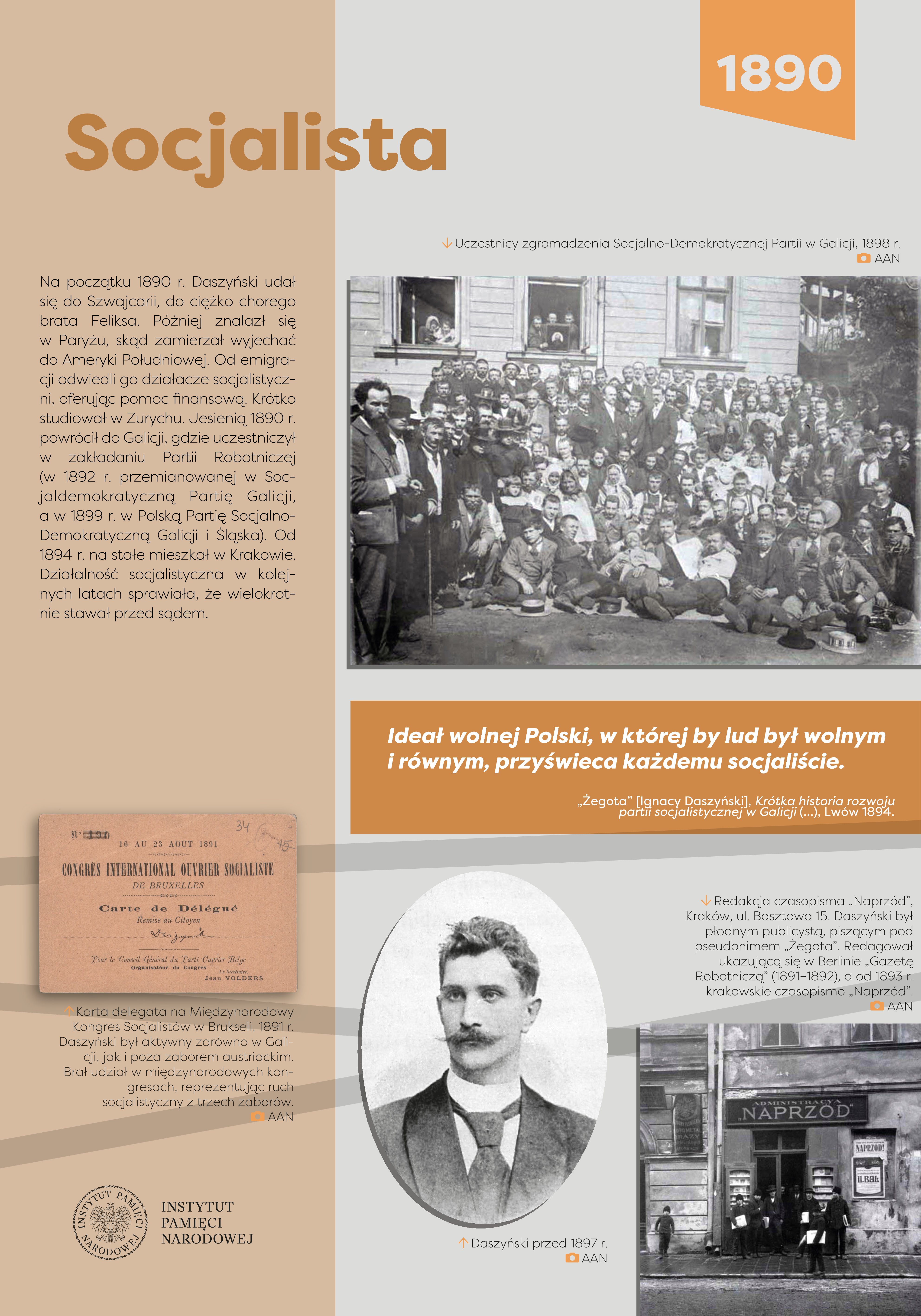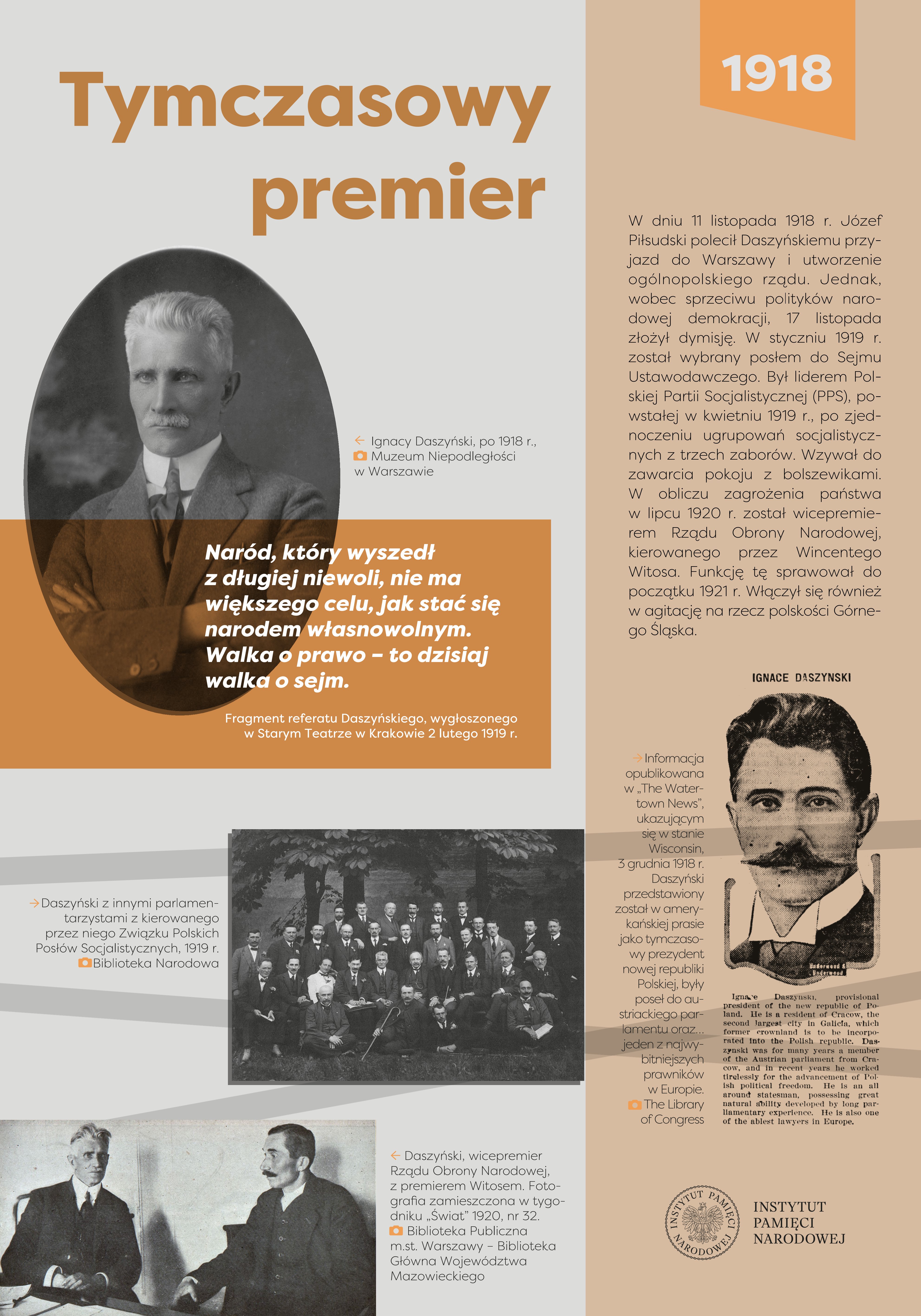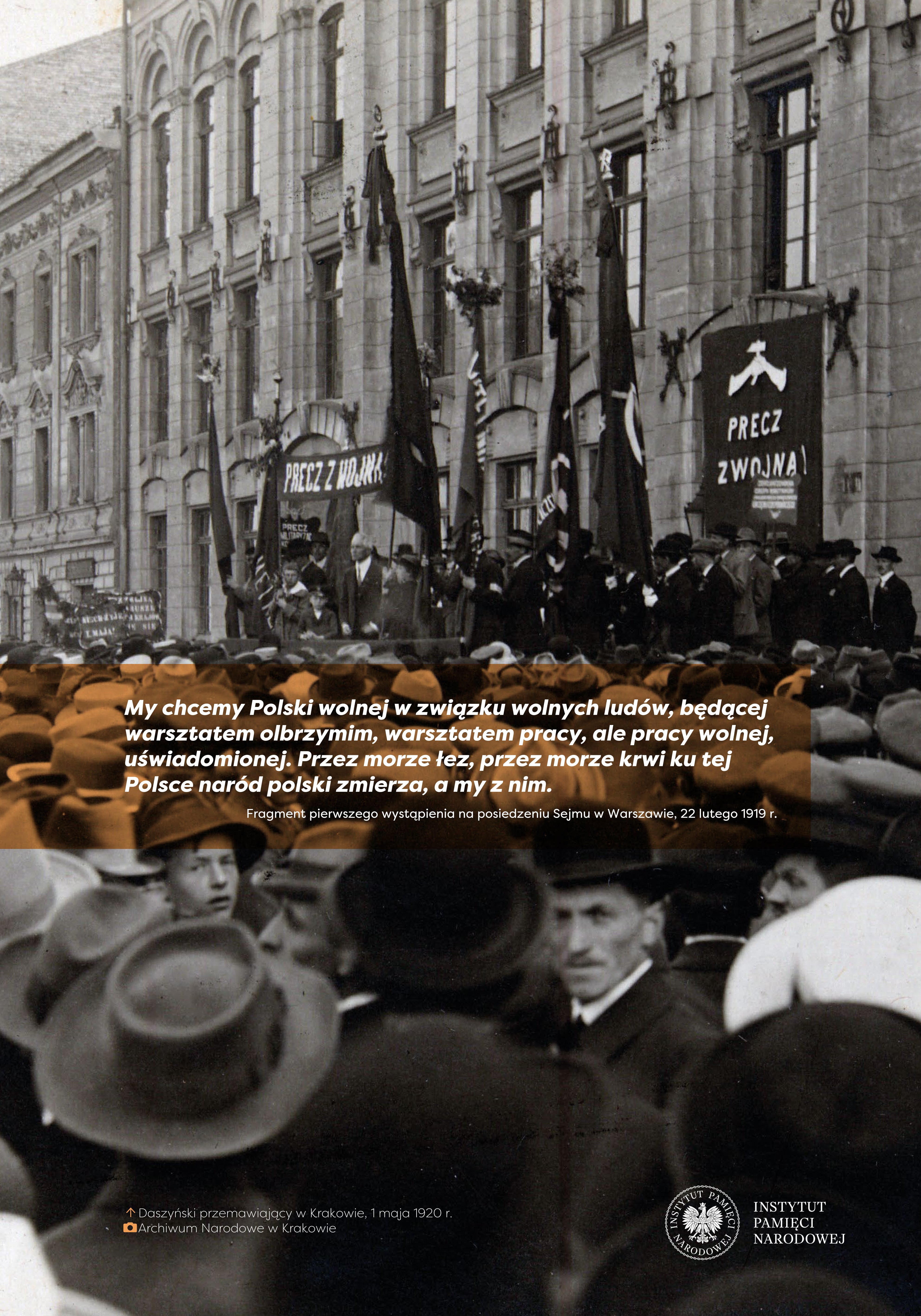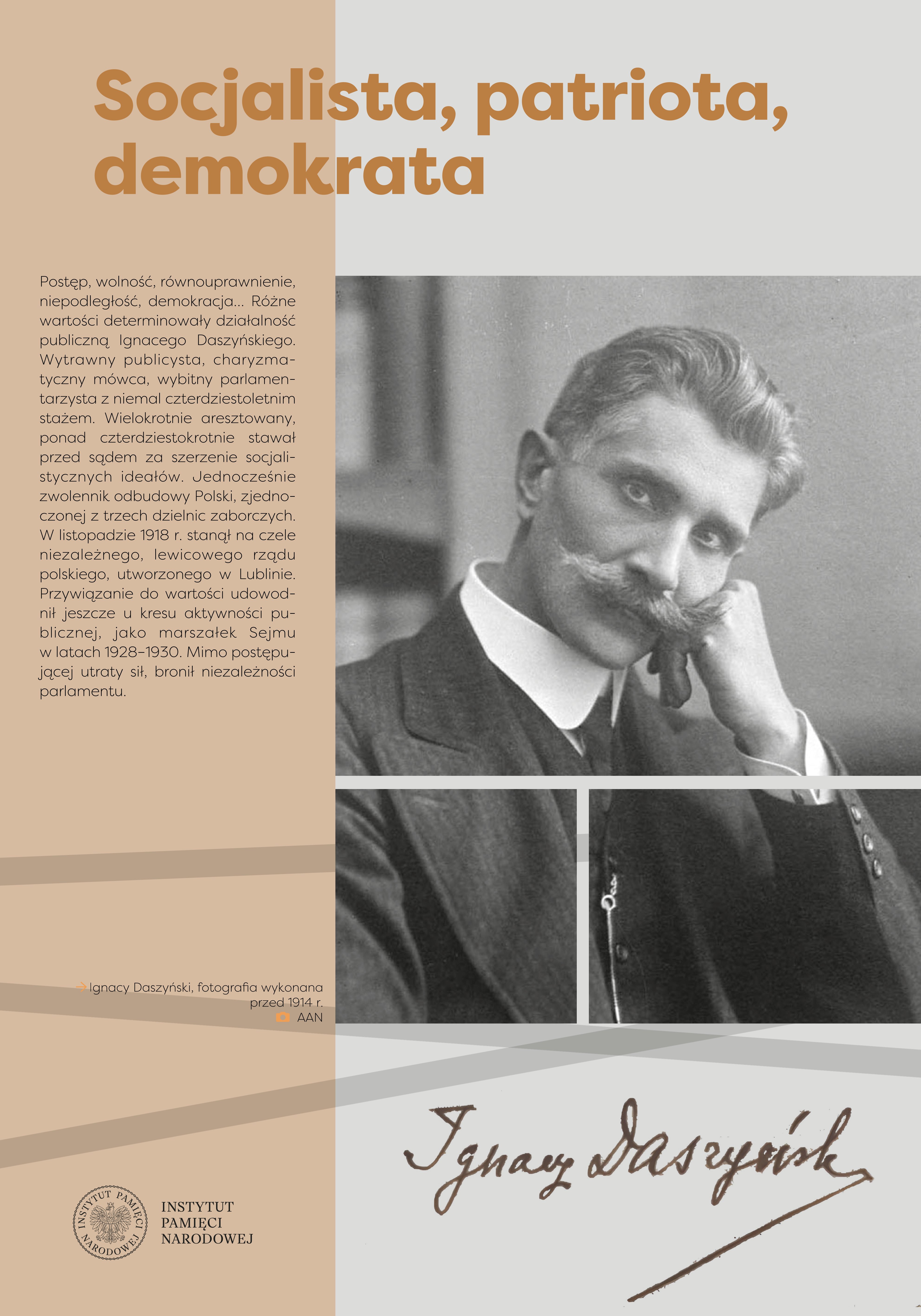 Wystawa przygotowana przez Referat Edukacji Narodowej Delegatury IPN w Kielcach ukazuje życie i działalność Ignacego Daszyńskiego, jednego z ojców polskiej niepodległości, zaliczanego do grona najważniejszych działaczy polskiego ruchu socjalistycznego. Daszyński był jednym z założycieli partii robotniczej w zaborze austriackim (późniejszej Polskiej Partii Socjalno-Demokratyczna Galicji i Śląska Cieszyńskiego), od 1897 r. posłem do wiedeńskiej Rady Państwa i jednym z najważniejszych działaczy niepodległościowych. Pod koniec I wojny światowej znalazł się we władzach Polskiej Komisji Likwidacyjnej, następnie stanął na czele pierwszego niezależnego rządu polskiego, powołanego do życia 7 listopada 1918 r. w Lublinie, a 14 listopada 1918 r. otrzymał od Józefa Piłsudskiego misję stworzenia pierwszego rządu ogólnopolskiego. W okresie międzywojennym, do 1935 r., był posłem do Sejmu. W lipcu 1920 r. został wicepremierem w Rządzie Obrony Narodowej. Pod koniec blisko czterdziestoletniej kariery parlamentarnej, w latach 1928–1930 pełnił funkcję marszałka Sejmu, broniąc demokracji i niezależności parlamentu.