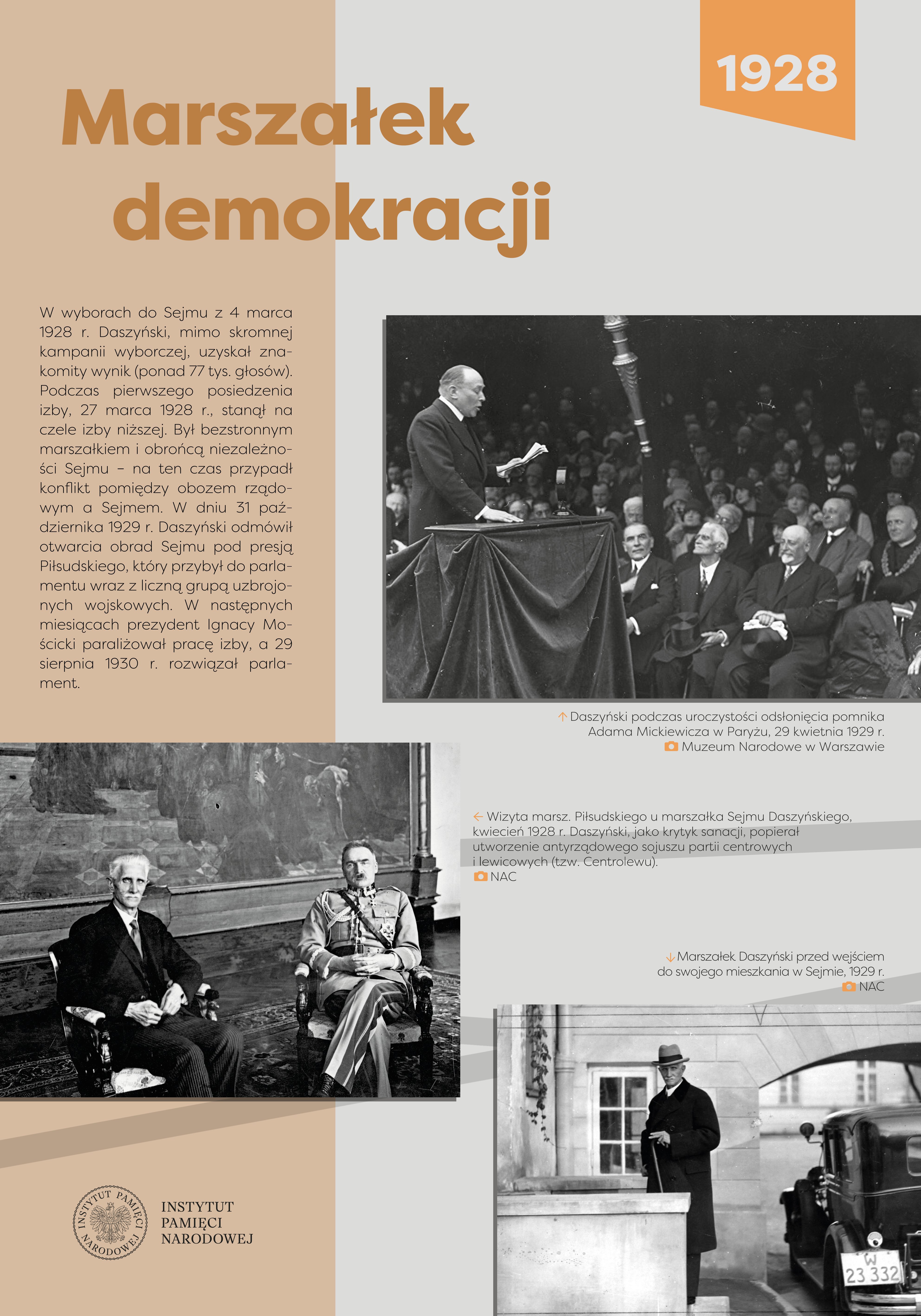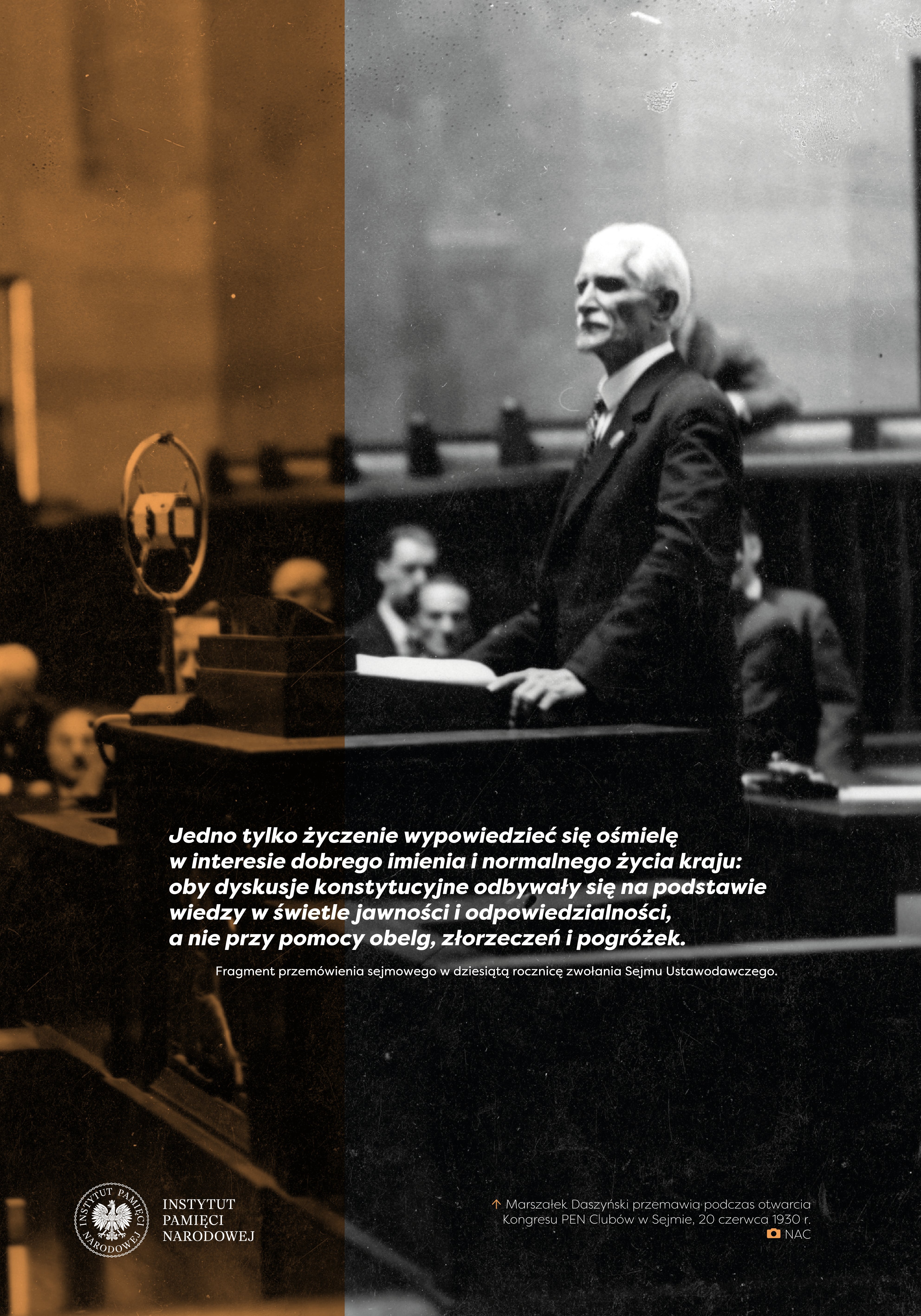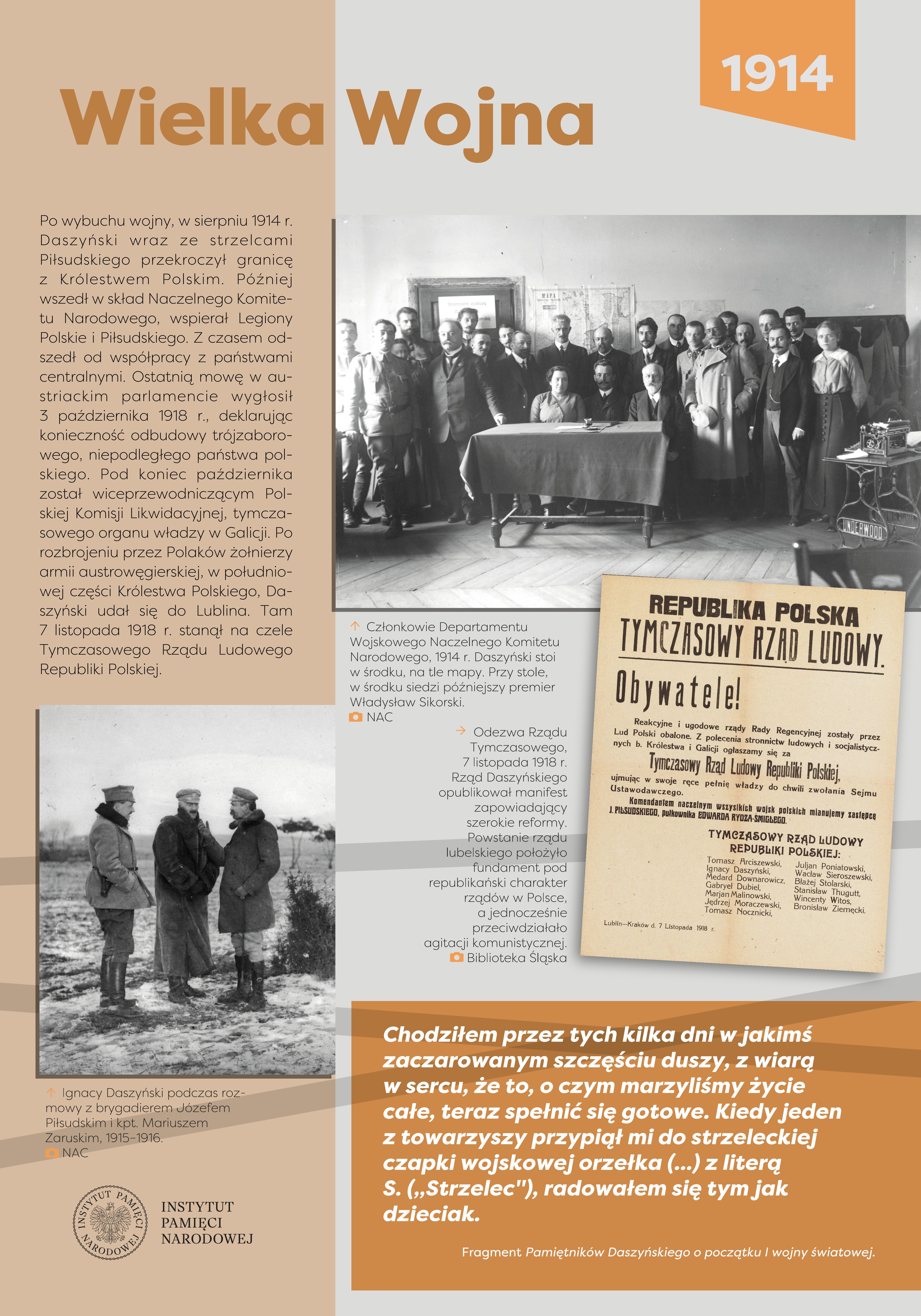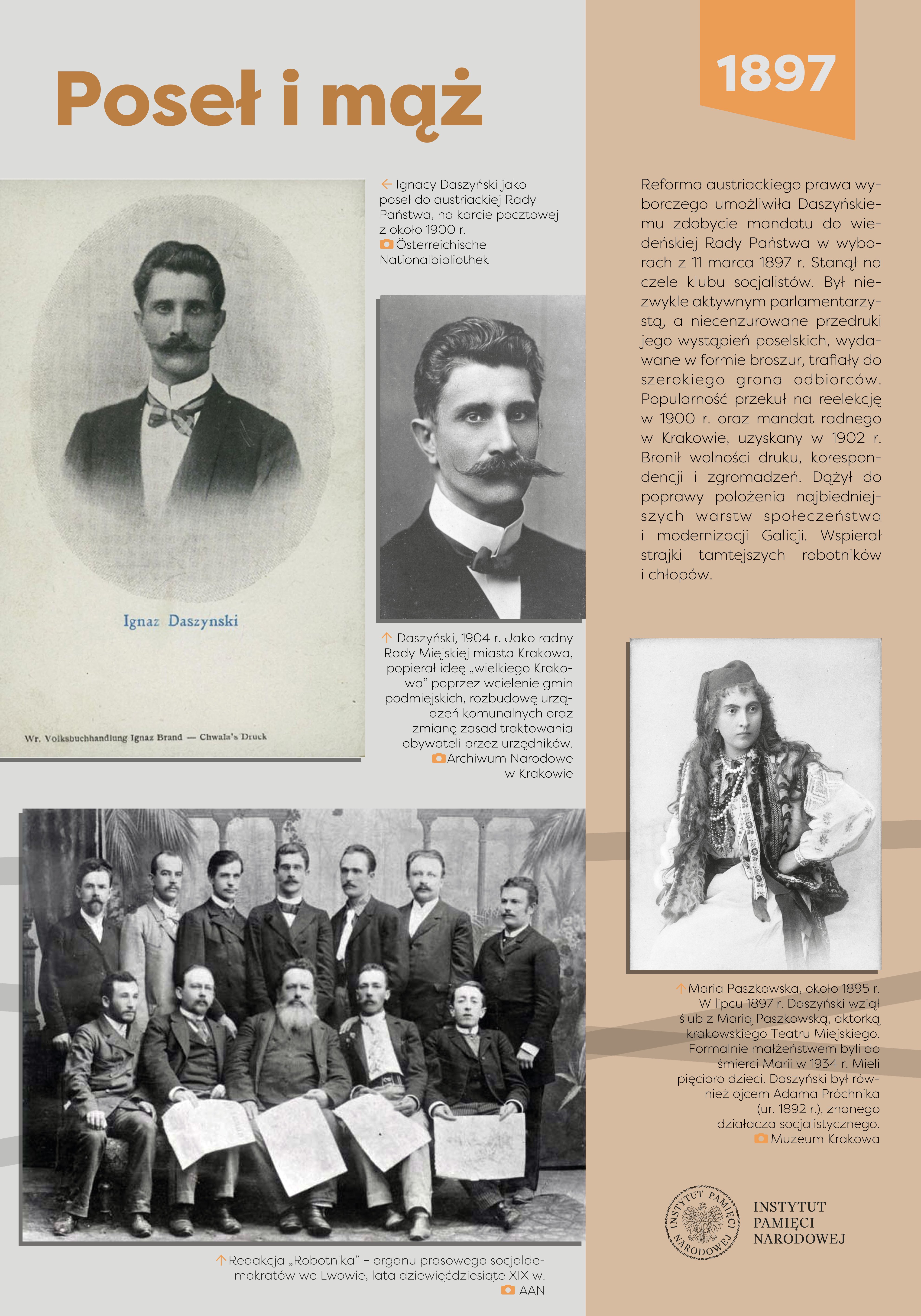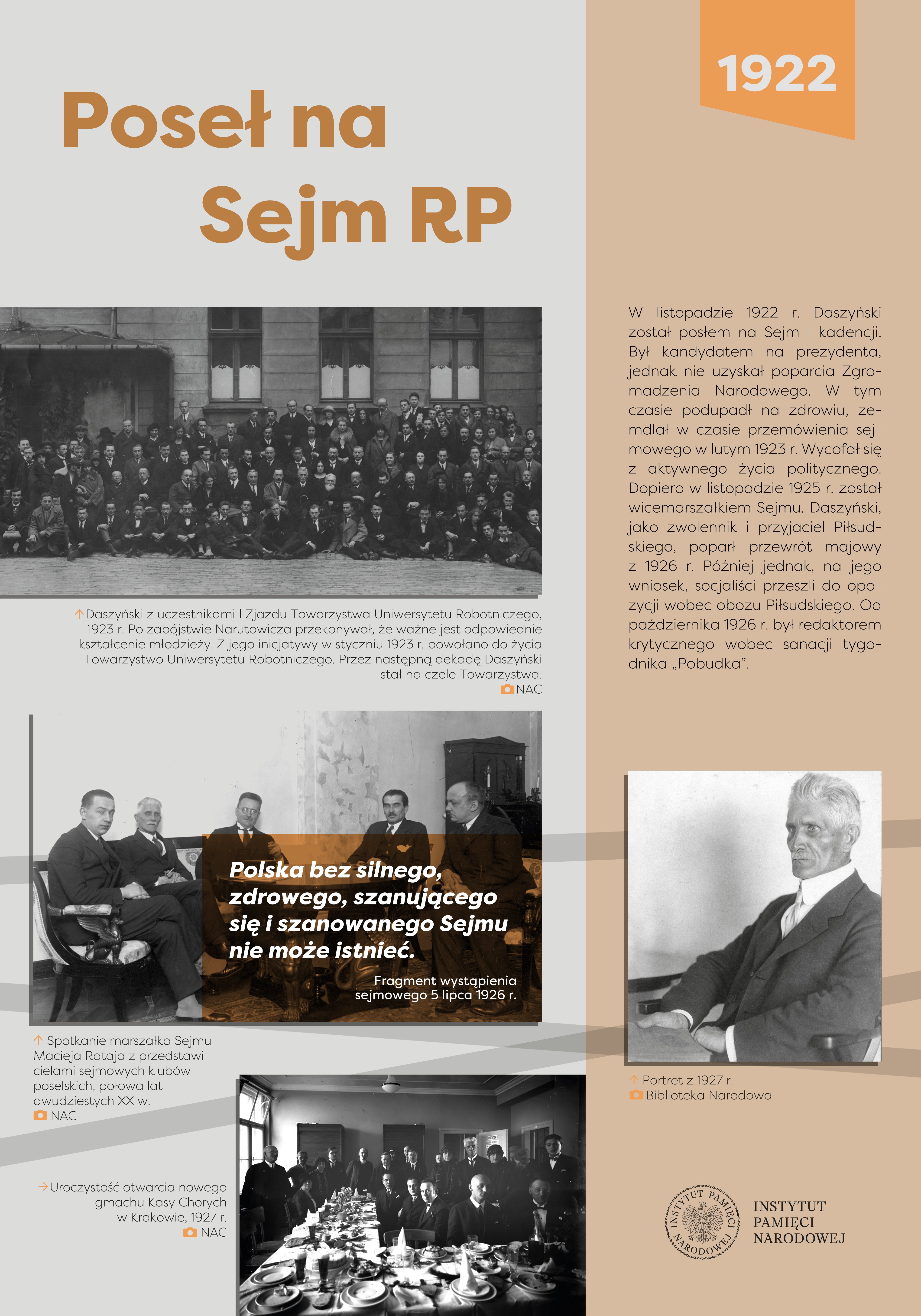 Wystawa przygotowana przez Referat Edukacji Narodowej Delegatury IPN w Kielcach ukazuje życie i działalność Ignacego Daszyńskiego, jednego z ojców polskiej niepodległości, zaliczanego do grona najważniejszych działaczy polskiego ruchu socjalistycznego. Daszyński był jednym z założycieli partii robotniczej w zaborze austriackim (późniejszej Polskiej Partii Socjalno-Demokratyczna Galicji i Śląska Cieszyńskiego), od 1897 r. posłem do wiedeńskiej Rady Państwa i jednym z najważniejszych działaczy niepodległościowych. Pod koniec I wojny światowej znalazł się we władzach Polskiej Komisji Likwidacyjnej, następnie stanął na czele pierwszego niezależnego rządu polskiego, powołanego do życia 7 listopada 1918 r. w Lublinie, a 14 listopada 1918 r. otrzymał od Józefa Piłsudskiego misję stworzenia pierwszego rządu ogólnopolskiego. W okresie międzywojennym, do 1935 r., był posłem do Sejmu. W lipcu 1920 r. został wicepremierem w Rządzie Obrony Narodowej. Pod koniec blisko czterdziestoletniej kariery parlamentarnej, w latach 1928–1930 pełnił funkcję marszałka Sejmu, broniąc demokracji i niezależności parlamentu.